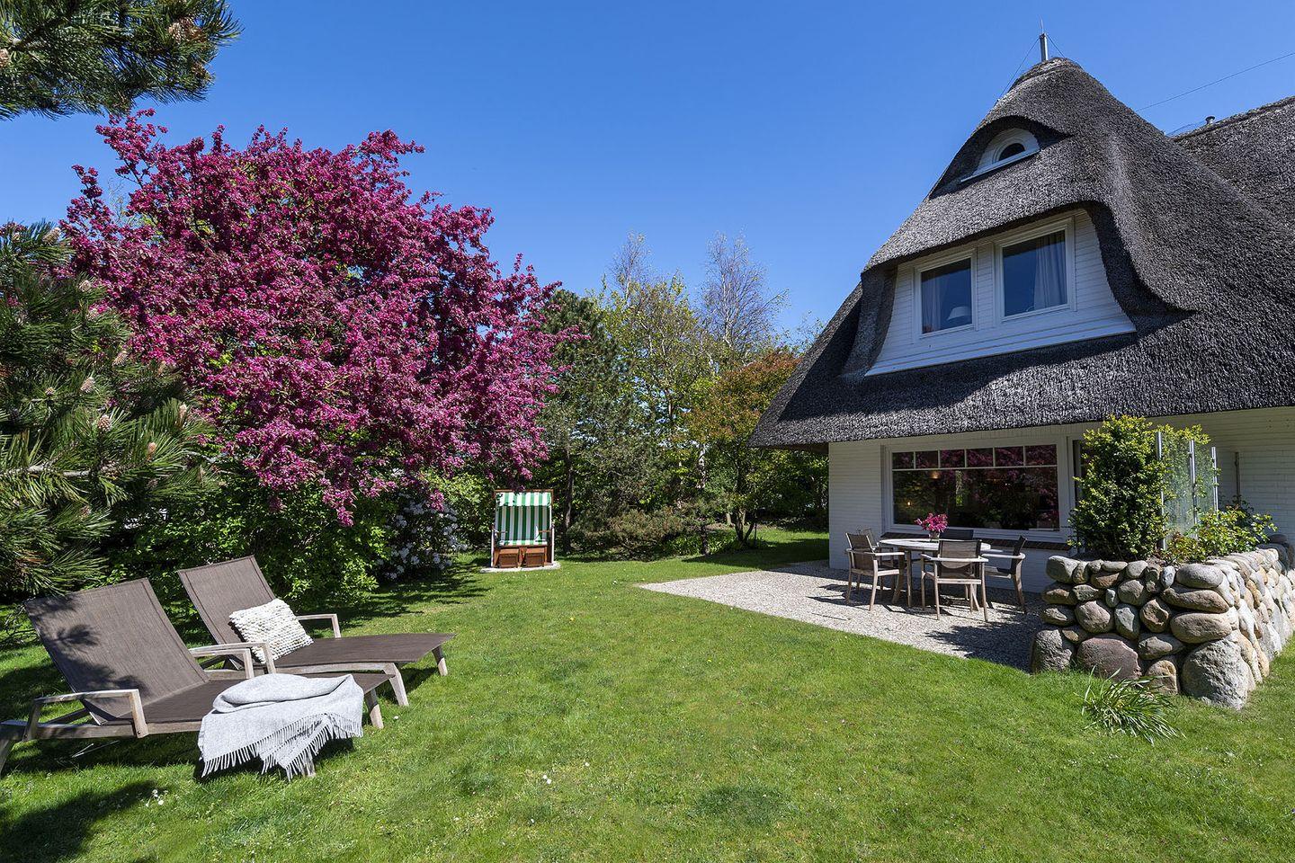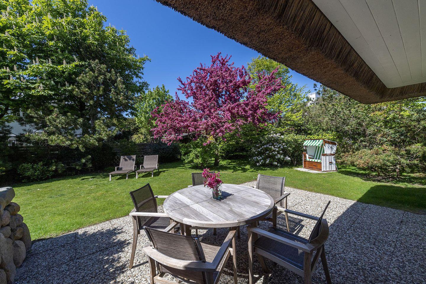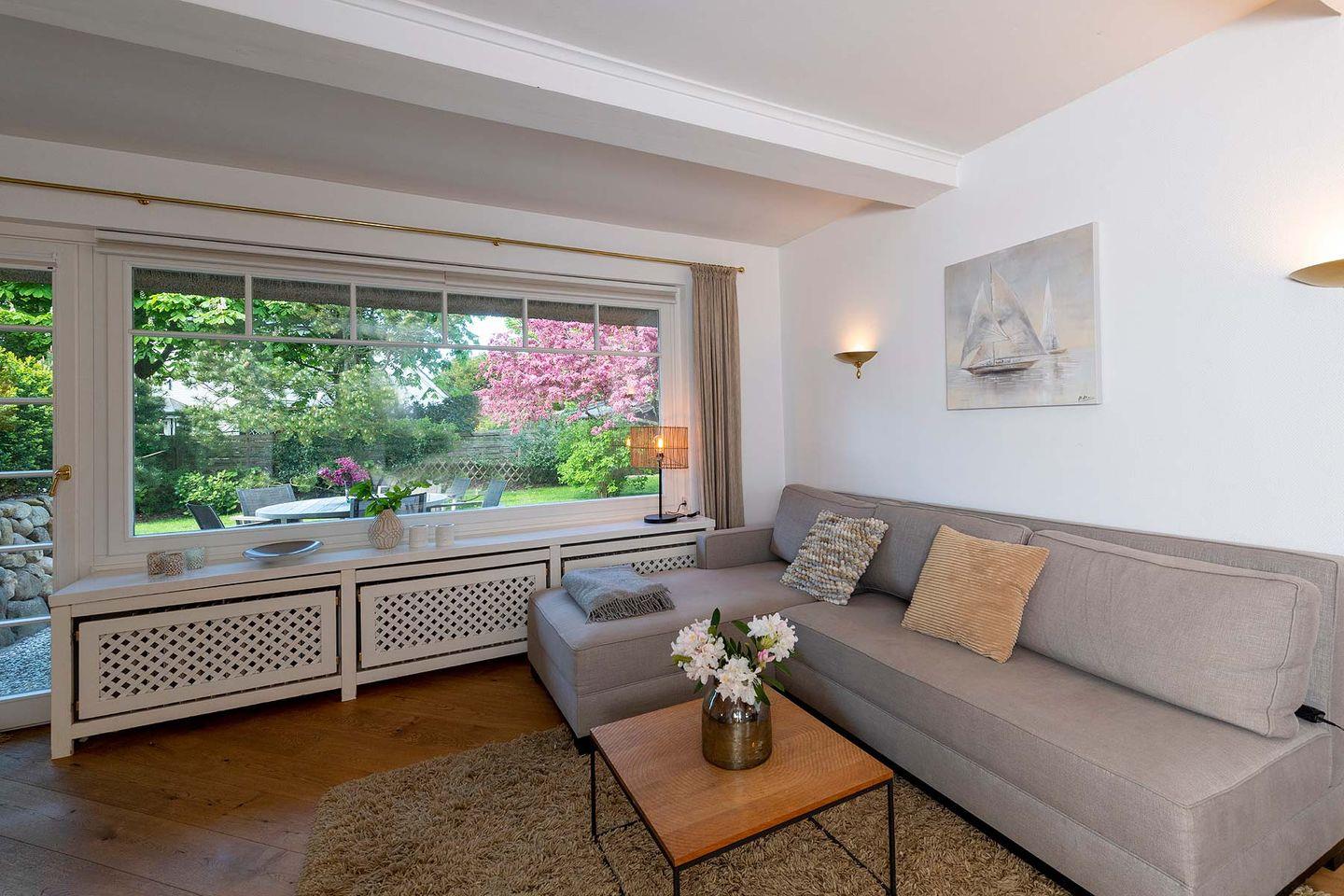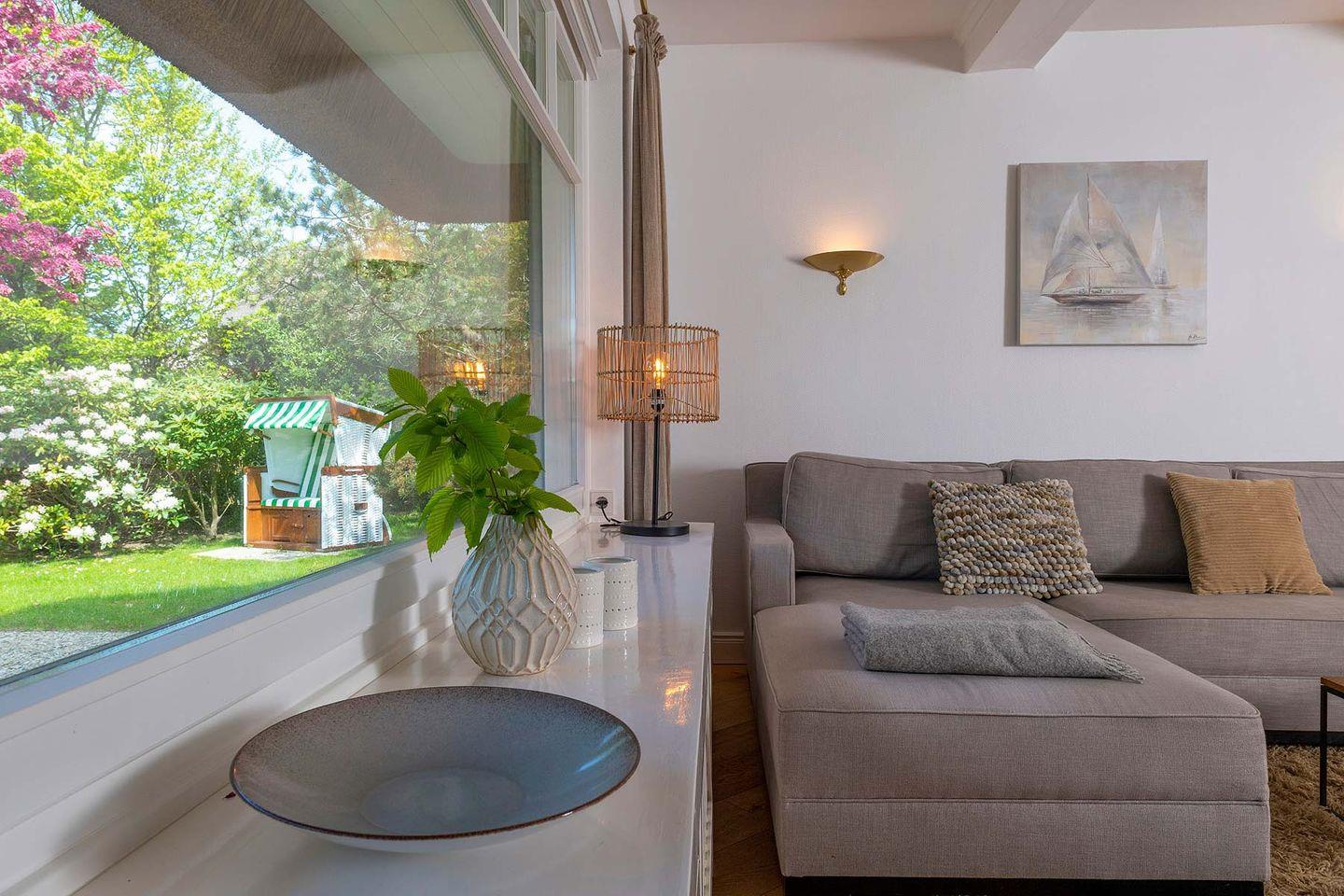 Erdgeschoss: Flur, Gäste-WC mit Dusche, komplett eingerichtet separate Küche mit Nespresso- und Filterkaffeemaschine, Wohnzimmer mit Kachelofen, TV und Esstisch, offener, ruhiger Garten, West-Terrasse mit Gartenmöbeln und Strandkorb