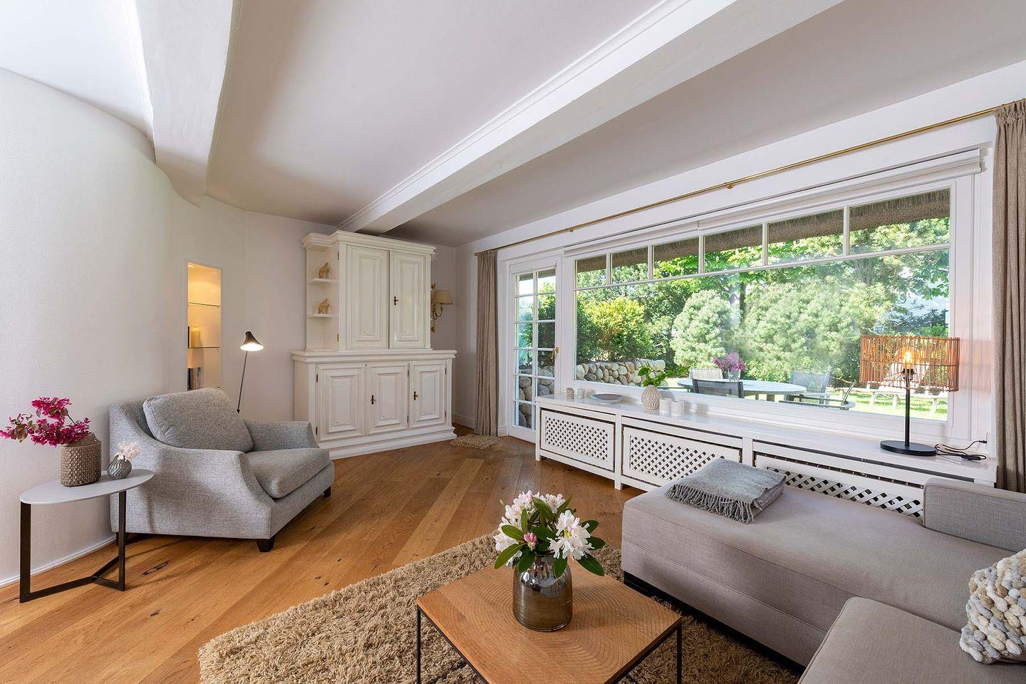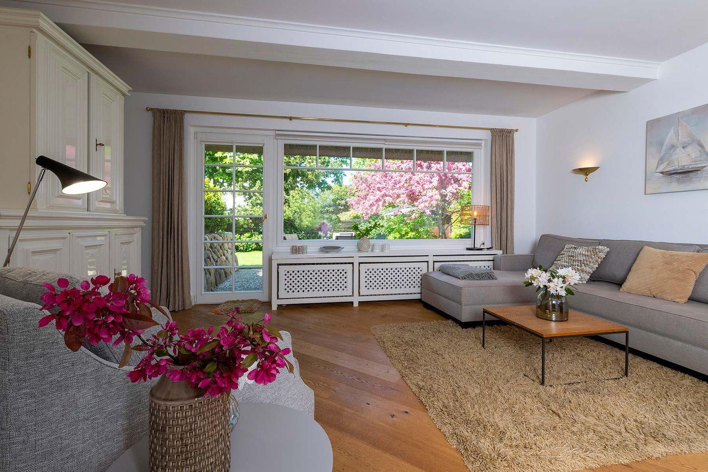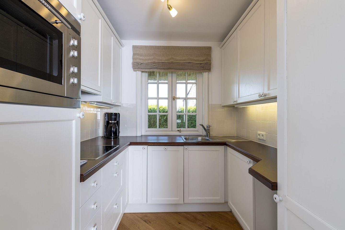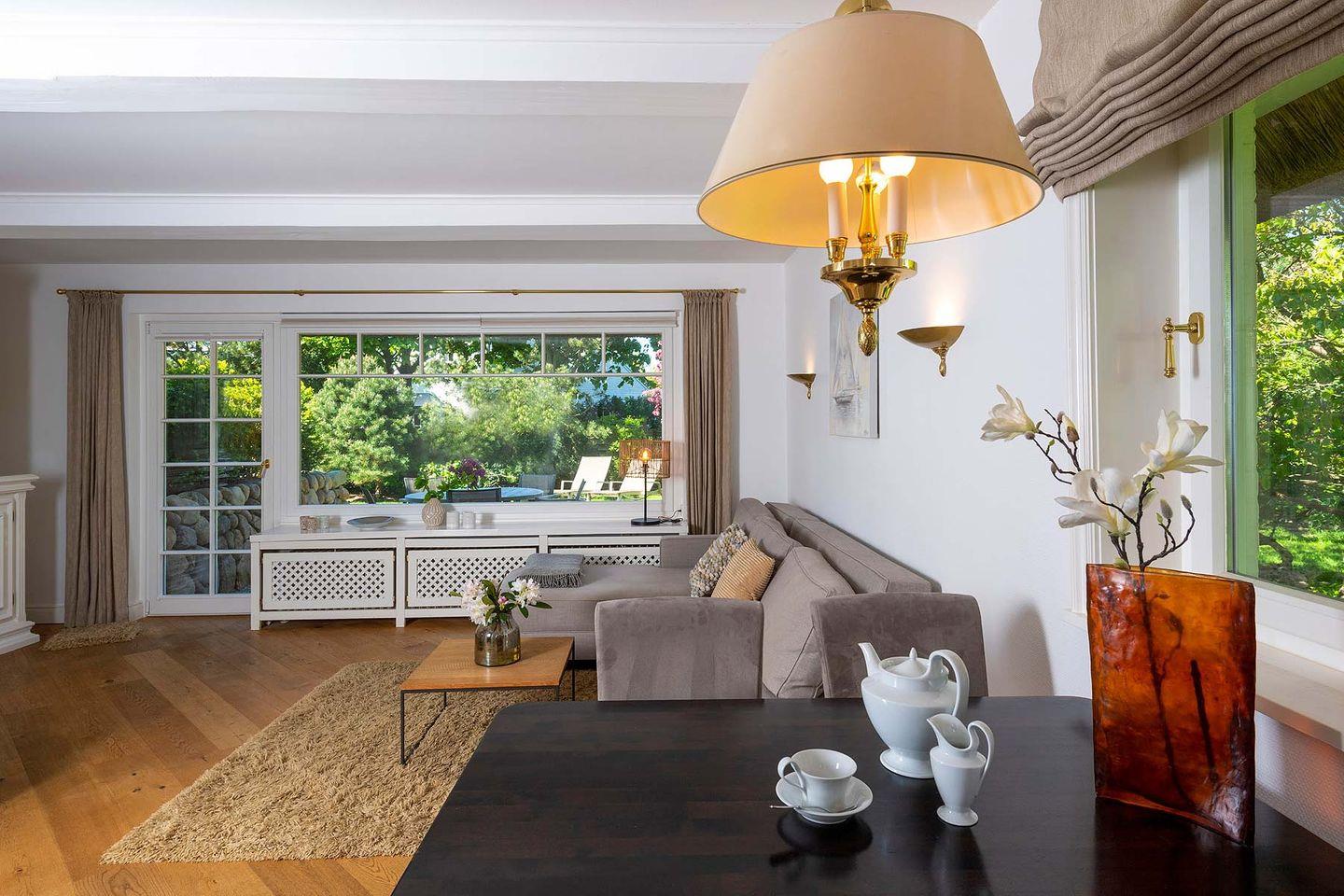 Erdgeschoss: Flur, Gäste-WC mit Dusche, komplett eingerichtet separate Küche mit Nespresso- und Filterkaffeemaschine, Wohnzimmer mit Kachelofen, TV und Esstisch, offener, ruhiger Garten, West-Terrasse mit Gartenmöbeln und Strandkorb