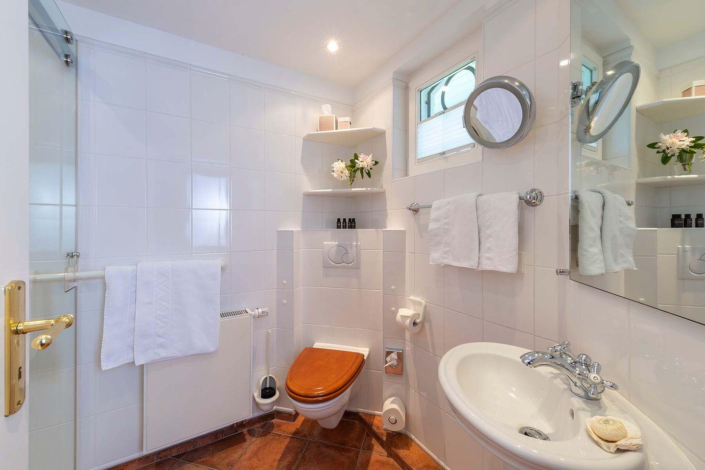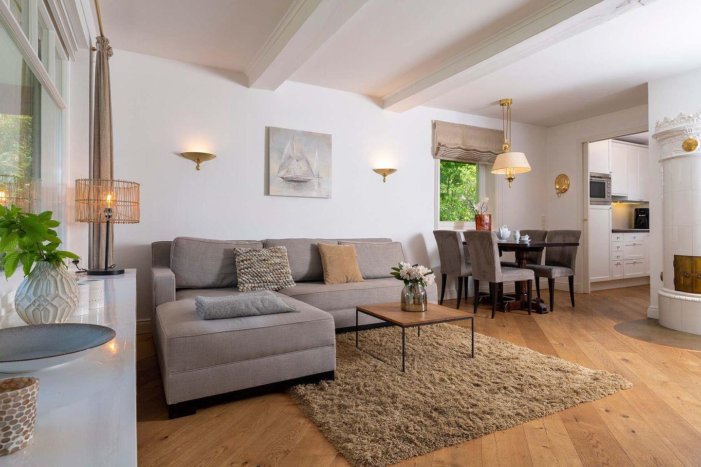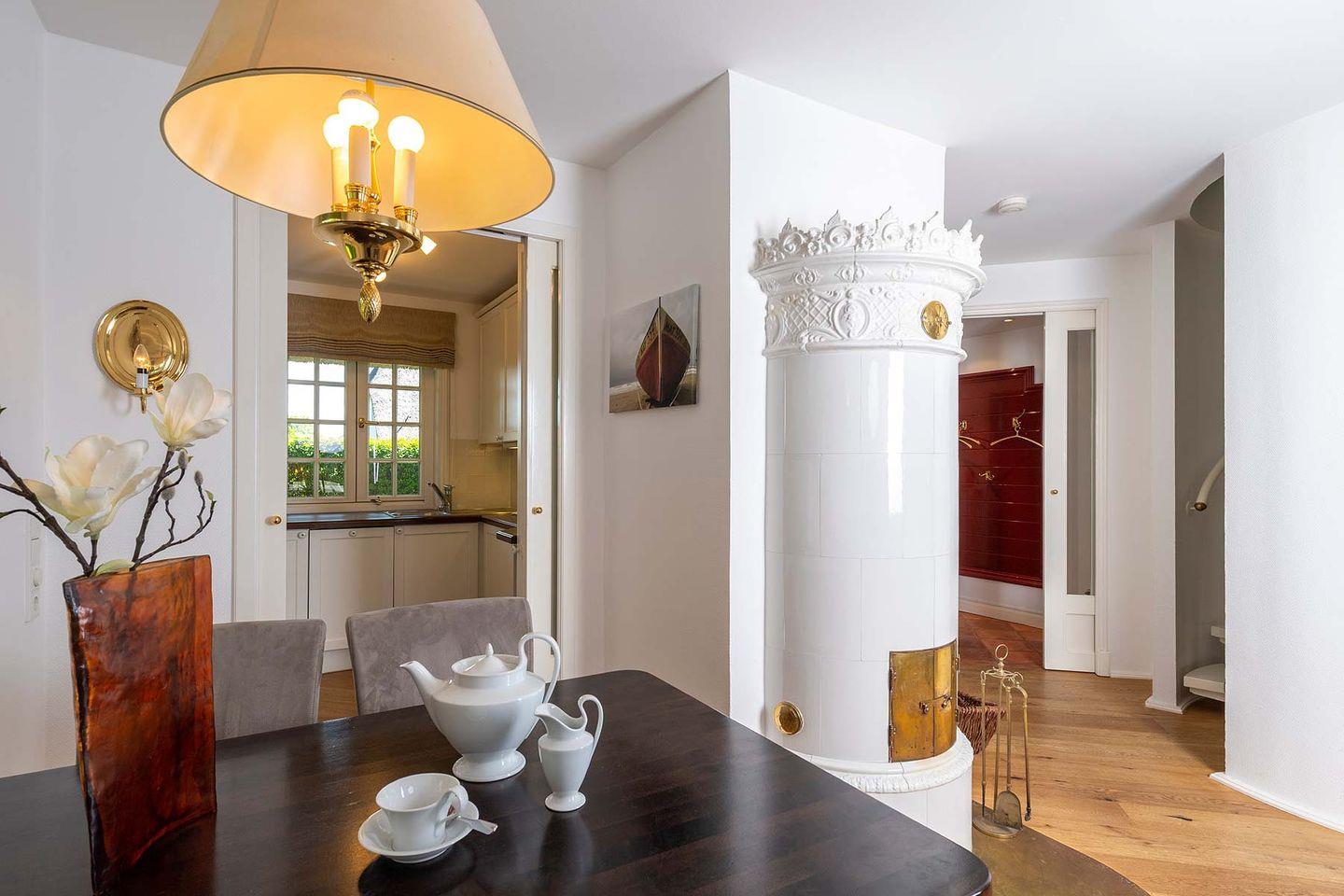 unmittelbar am Rande des Benen-Diken-Hofs gelegen – ist ein exklusives 5-Sterne Ferien Domizil. Auf gut 100 m² und über drei Ebenen bietet es Platz für maximal fünf Personen. Der wunderbar eingewachsene und geschützt liegende Garten bietet viel Ruhe an frischer Luft. Das Domizil ist vor allem für Gäste geeignet, die sowohl die Angebote des Hotels als auch den täglichen Hotel-Service zusätzlich buchen möchten. Eingewachsen in eine alte Gartenanlage mit einer nach Südwesten ausgerichteten Terrasse bietet es Zurückgezogenheit und zugleich die Nähe zum Hotel. Vielleicht ist es gerade deswegen das bevorzugte Domizil der Schriftsteller unter unseren Gästen. Schön ist es hier im Benendikenwai, ruhig, gemütlich und anspruchsvoll – die elegante Art, »friesisch« zu wohnen. Das Haus ist in einem für die Insel typischen Stil eingerichtet; liebenswerte Details sind der alte Kachelofen und die schwere Klöntür mit ihrem Bullauge.