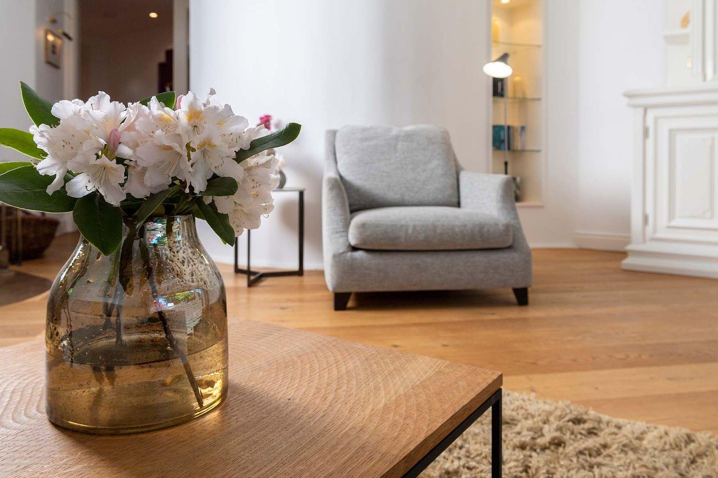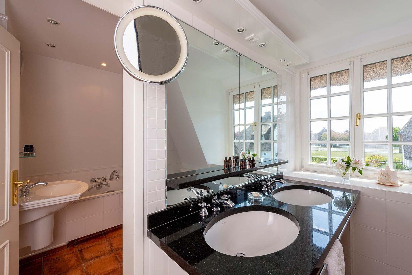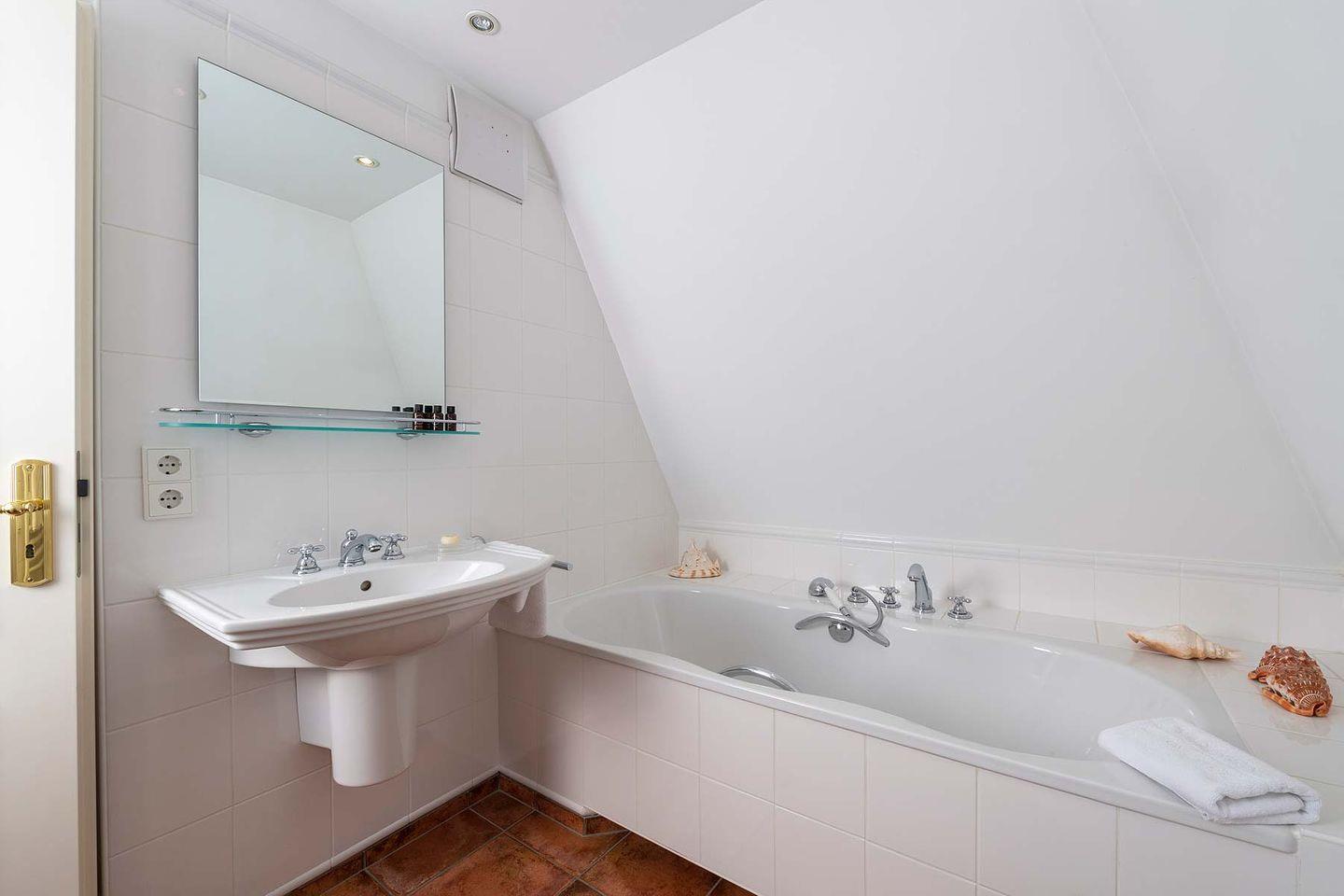 unmittelbar am Rande des Benen-Diken-Hofs gelegen – ist ein exklusives 5-Sterne Ferien Domizil. Auf gut 100 m² und über drei Ebenen bietet es Platz für maximal fünf Personen. Der wunderbar eingewachsene und geschützt liegende Garten bietet viel Ruhe an frischer Luft. Das Domizil ist vor allem für Gäste geeignet, die sowohl die Angebote des Hotels als auch den täglichen Hotel-Service zusätzlich buchen möchten. Eingewachsen in eine alte Gartenanlage mit einer nach Südwesten ausgerichteten Terrasse bietet es Zurückgezogenheit und zugleich die Nähe zum Hotel. Vielleicht ist es gerade deswegen das bevorzugte Domizil der Schriftsteller unter unseren Gästen. Schön ist es hier im Benendikenwai, ruhig, gemütlich und anspruchsvoll – die elegante Art, »friesisch« zu wohnen. Das Haus ist in einem für die Insel typischen Stil eingerichtet; liebenswerte Details sind der alte Kachelofen und die schwere Klöntür mit ihrem Bullauge.