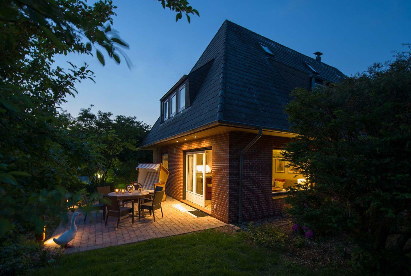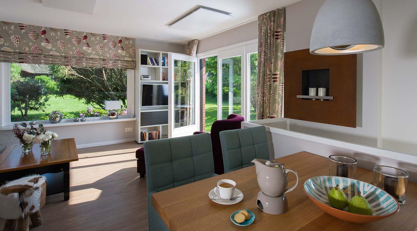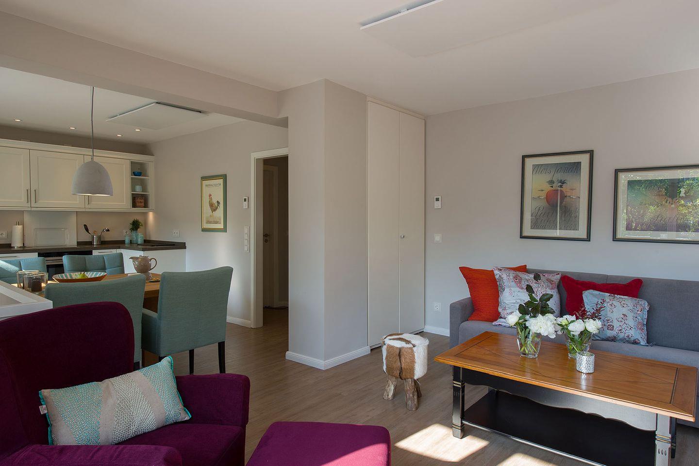 Das exklusive Ferien Domizil im Erich-Johannsen-Wai 7 in Keitum bietet für maximal zwei Personen ausreichend Platz, um hier gemeinsam auf zwei Ebenen und 74 m² entspannte Urlaubstage zu verbringen. Große Fensterfronten sorgen für ein natürliches und helles Wohlbefinden. Sie öffnen die Wohnung hin zu den Plätzen auf der Terrasse und in den 9000 m² großen Gemeinschaftsgarten. Von morgens bis abends lässt sich die Sonne genießen. Strand-Motive prägen die Dekore auf den Kissen und Stoffen des großzügigen Wohn– und Essbereichs. Die Farben Türkis und Brombeer gehören zum Farbkonzept der Inneneinrichtung und werden durch einen warmen Taupeton der Wände unterstrichen. Der offene Wohnbereich mit modernem Esstisch, kuscheliger Couch und voll ausgestatteter Küche tragen zum sympathischen Wohnambiente bei. Jeder Gast verfügt über ein eigenes, modernes Bad. Abends findet man Ruhe und Entspannung bei gutem Essen und einer Flasche Wein vor dem Ethanol-Kamin. Eine schöne Holztreppe verbindet den Wohnbereich mit dem behaglich anmutenden Schlafbereich im Untergeschoss. Das Ferien Domizil »Sonnenkoje« ist aufgrund seiner besonderen Lage ein idealer Ausgangspunkt, um den grünen Ort der Insel – Keitum – mit seinen zahlreichen Alleen und dem alten Baumbestand zu erkunden.