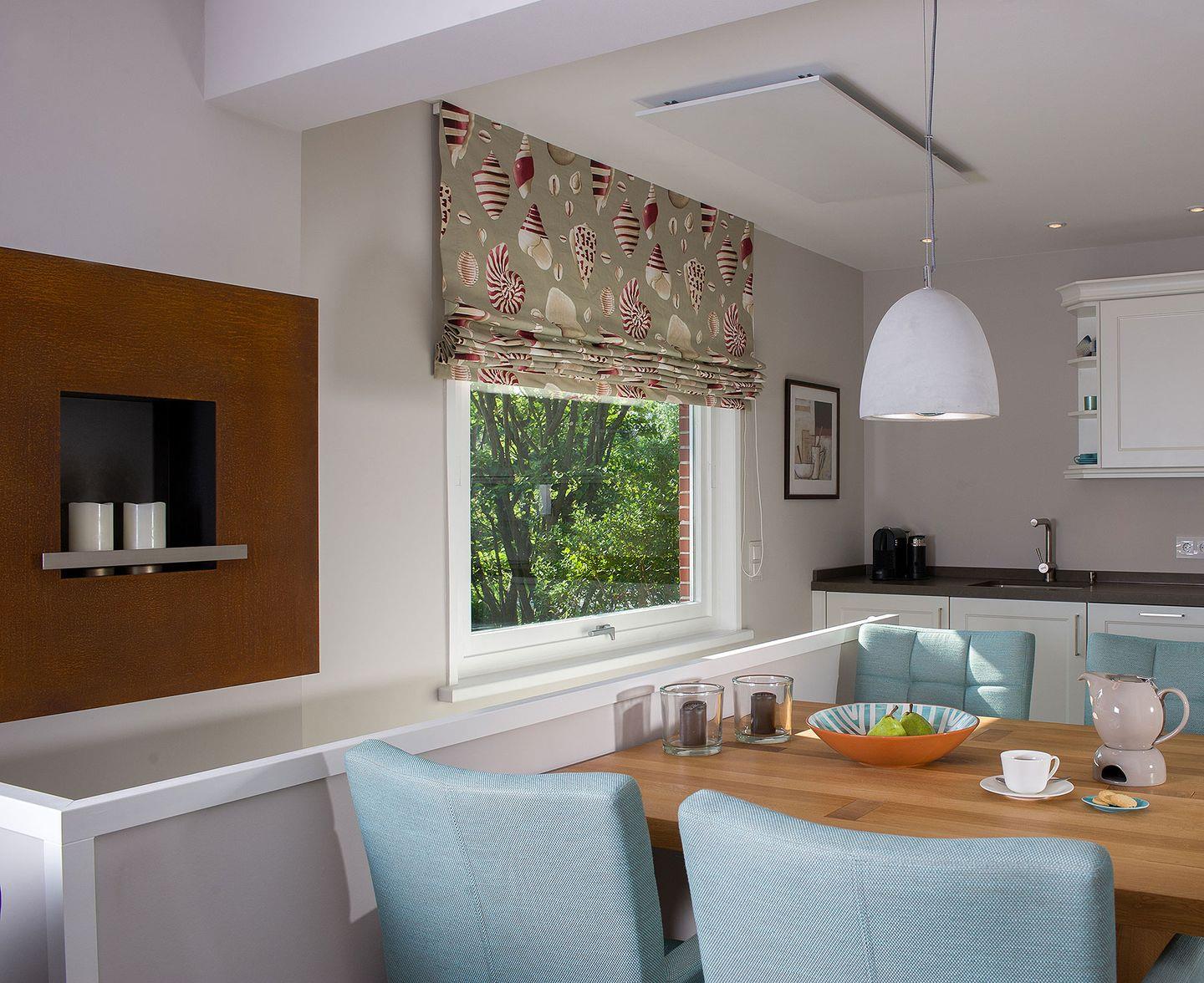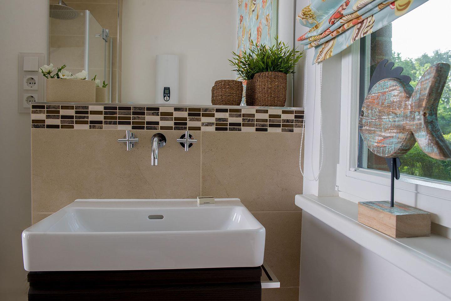 Erdgeschoss: Flur, Badezimmer mit Dusche und WC, komplett eingerichtete, offener Küche, Esstisch, Ethanol Kaminwandbild, Wohnzimmer mit TV, offener Garten, Südwest-Terrasse mit Gartenmöbeln und Strandkorb