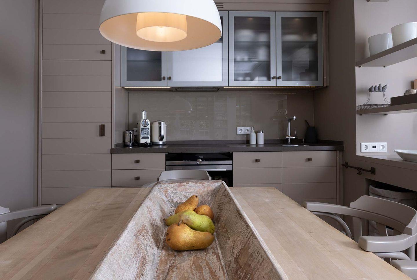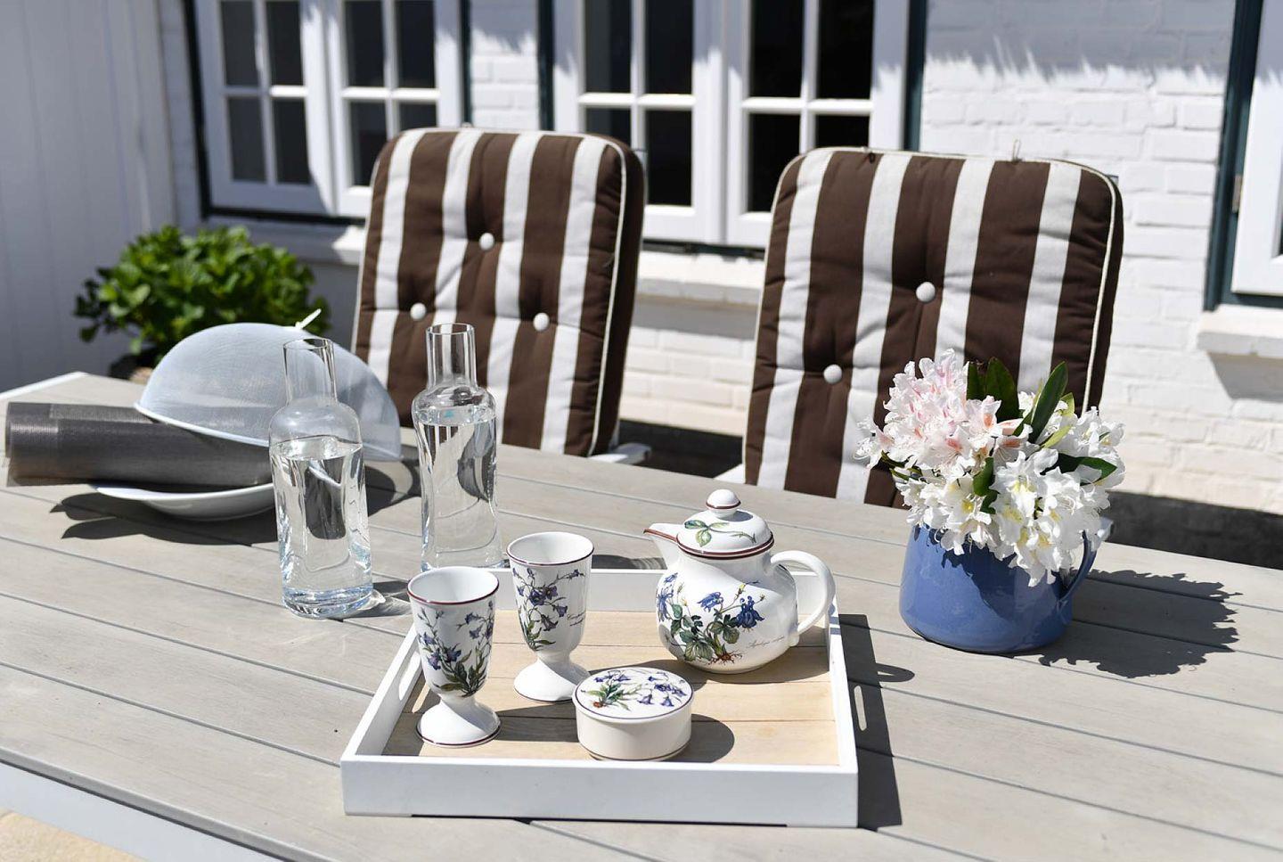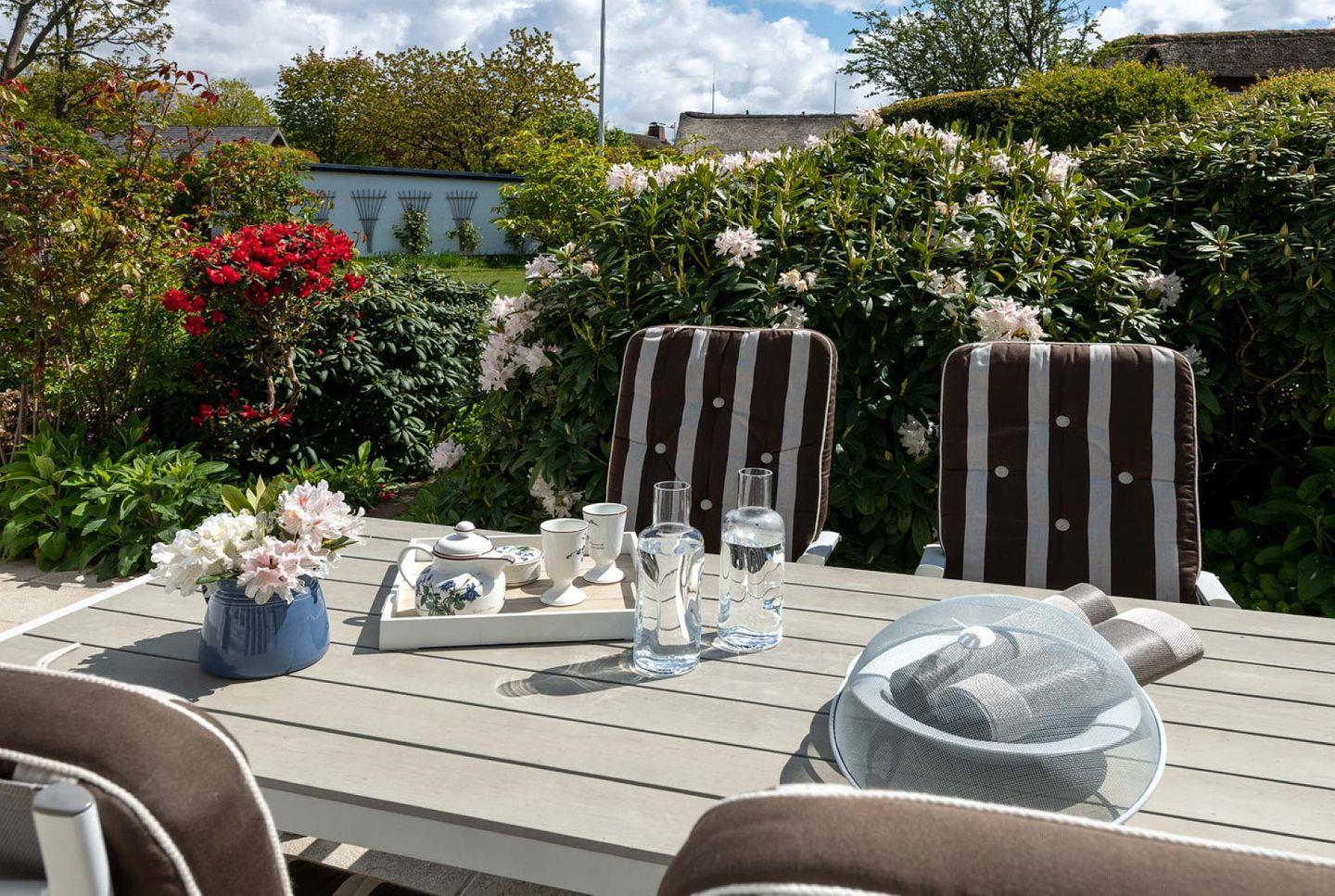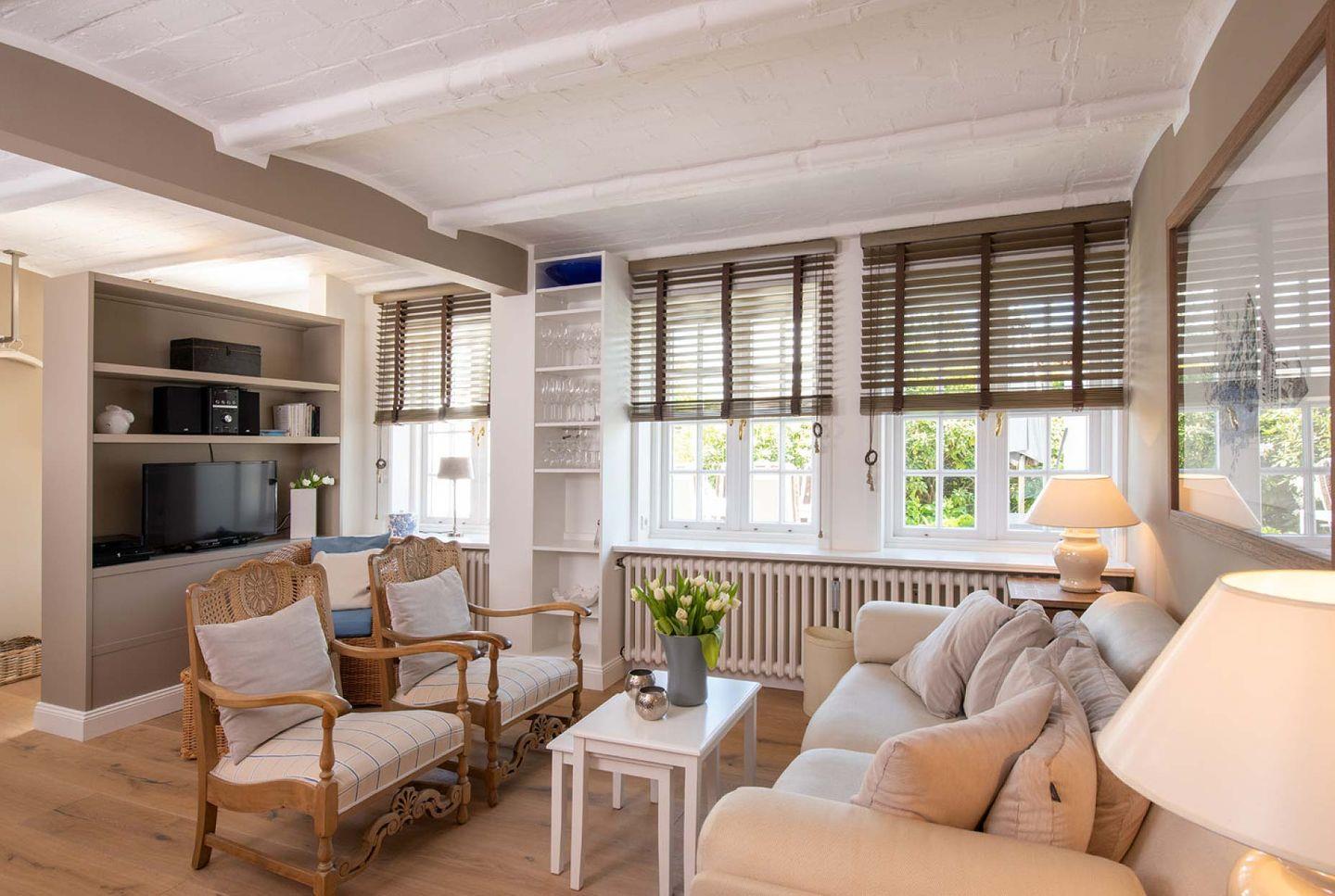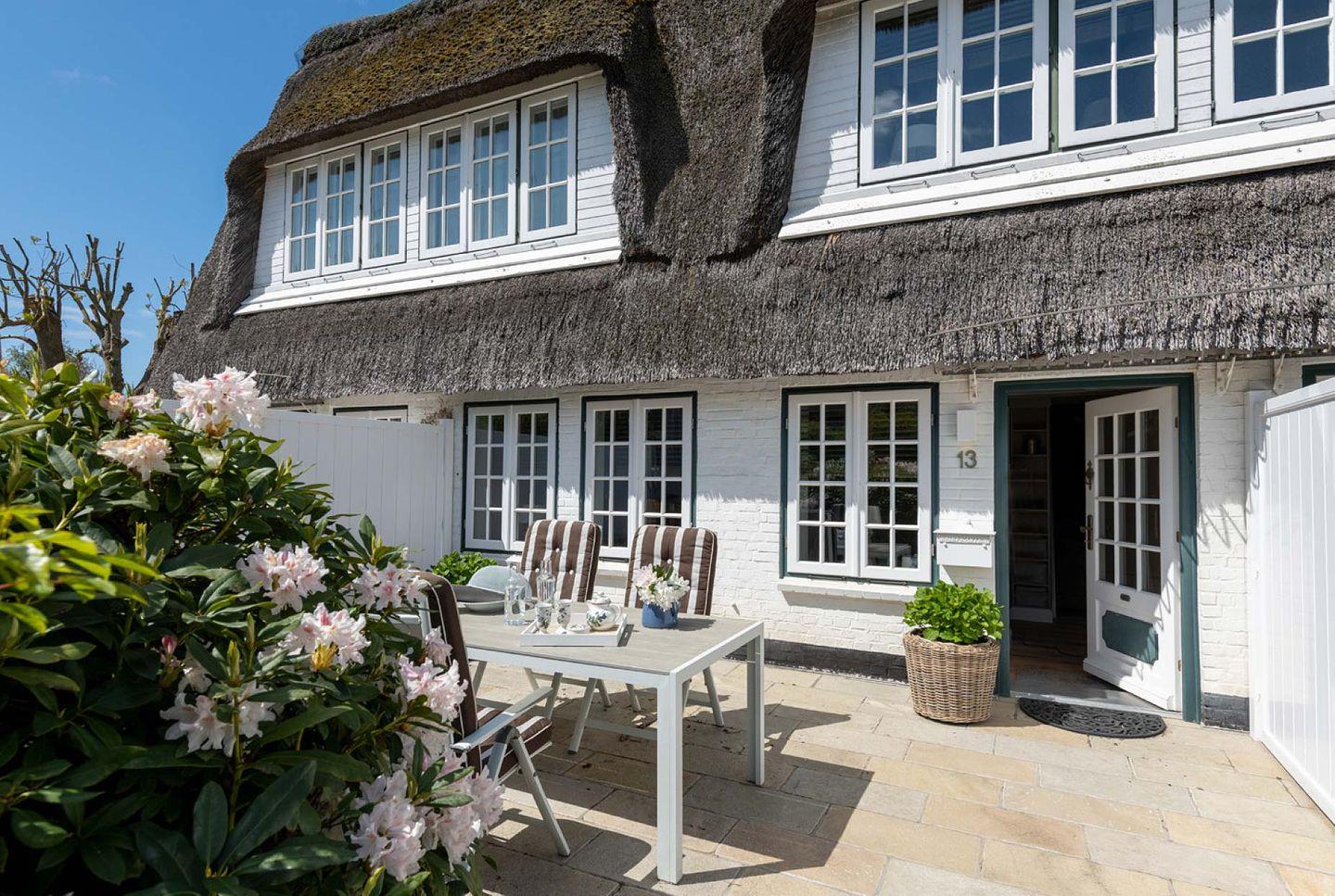 Das exklusive 4-Sterne Ferien Domizil Stutenhof 13 liegt am Gurtstig mitten in Keitum. Im Frühjahr 2019 wurde es umfassend und hochwertig renoviert. Zwei Personen finden hier auf zwei Ebenen und 55 m² ausreichend Platz. Eine nach Südwesten ausgerichtete 25 m² große Terrasse, eingewachsen in eine alte Gartenanlage, bietet wunderschöne, geschützt hinter Rhododendren liegende Sonnenplätze. Der moderne Hausteil unter Reet erwartet seine Gäste in freundlicher Atmosphäre. Holzrollos im Wohnbereich zaubern eine romantische Lichtatmosphäre auf dem gemütlichen Sofa. Der große Esstisch verbindet die offene und umfangreich ausgestattete Küche mit dem Wohnbereich. Alles ist durchdacht, jeder Platz wird genutzt. So befindet sich zwischen Küche und Treppenaufgang ein zweites Sofa, das tagsüber auch als gemütliche Leseecke genutzt werden kann. In der Verwendung von Sand- und Naturtönen im gesamten Ferien Domizil und der mit viel Liebe für Details ausgesuchten und zusammengefügten Möbel und Accessoires wurde sehr viel Wert daraufgelegt, dass seine Bewohner sich wohlfühlen. Ein Ferien Domizil für den besonderen Rückzug mitten in Keitum.