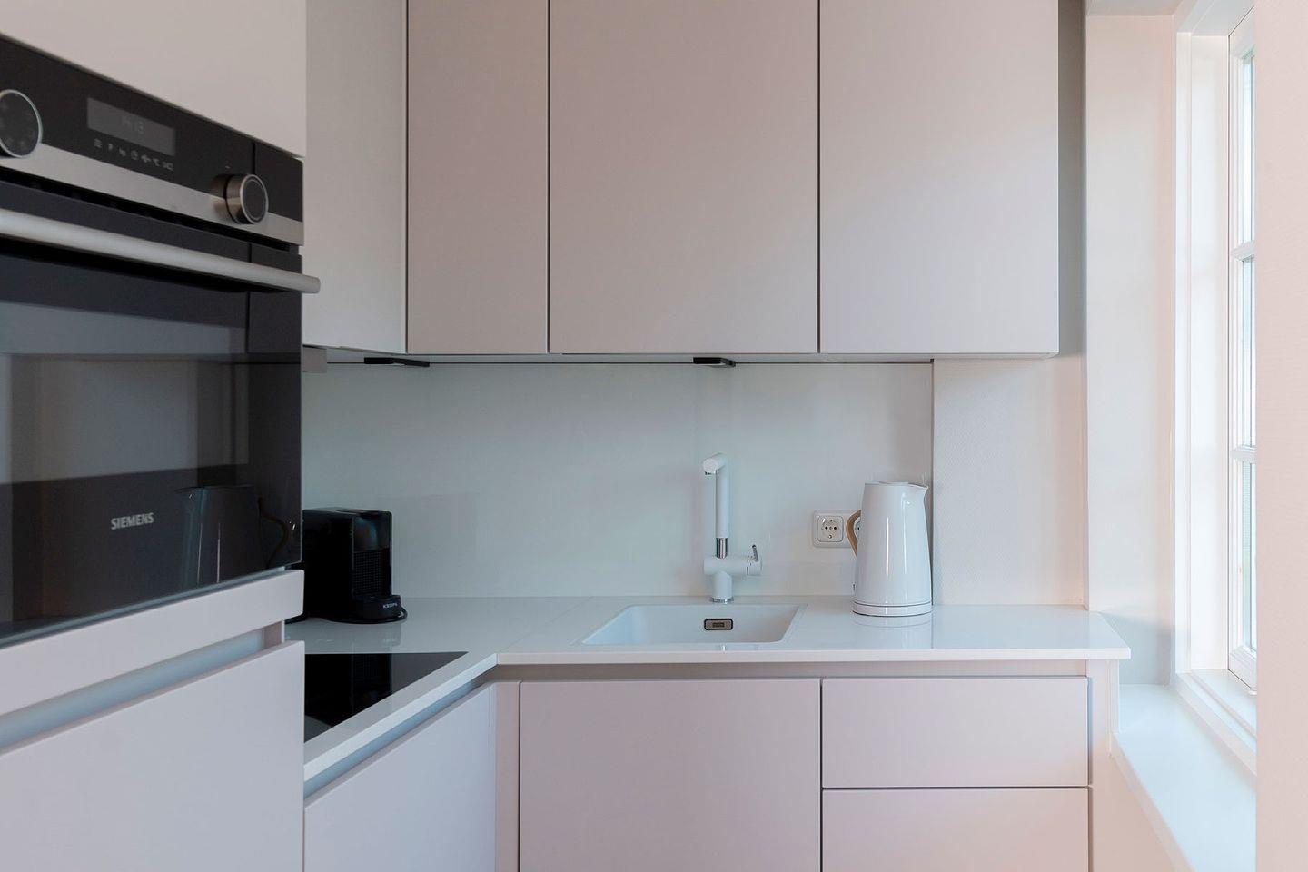 WohnZeit im Ferien Domizil »Leichte Brise« verspricht Leben in luftigen Räumen, eingerichtet mit nordischen Designklassikern wie z.B. dem von Wim Rietveld in den sechziger Jahren entworfenen »Pyramid Schreibtisch« oder dem »Wishbone Chair«. Die Farben der Nordsee – Luft-, Sand-, Seen- und Wälderfarben – sind die Inspirationsquelle fu¨r die neue Farbwelt des Groot's Hu¨s. Sie finden sich in den Wandtönen und tragen so schöne Namen wie »Light Sand«, »Powder Nude« und »Ocean«. Klare Linien und Formen, helles und dunkles Holz, Felle und Naturtextilien erzeugen eine harmonische Atmosphäre. Der Wohn-Essraum ist mit einer modernen, kompakten Ku¨chenzeile ausgestattet.