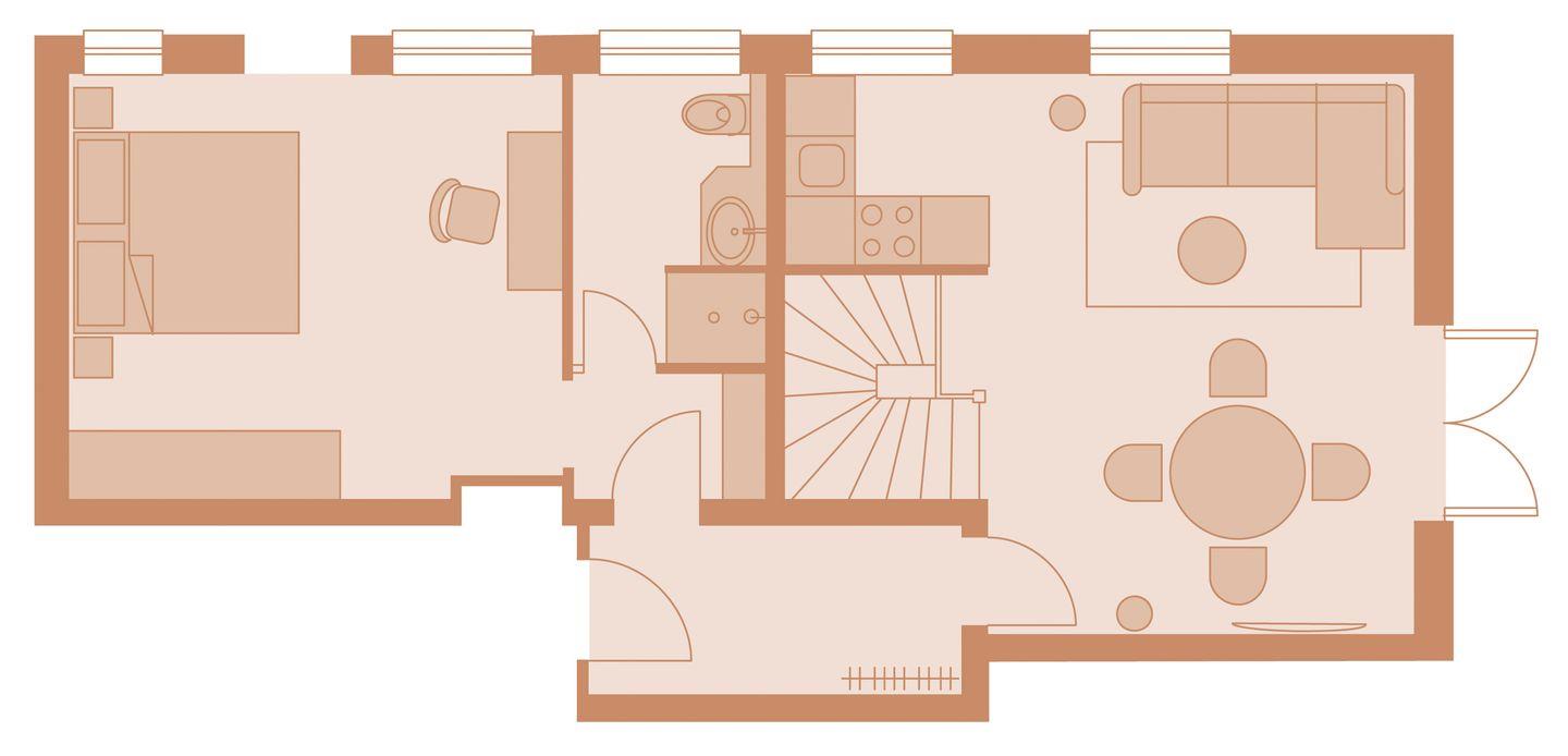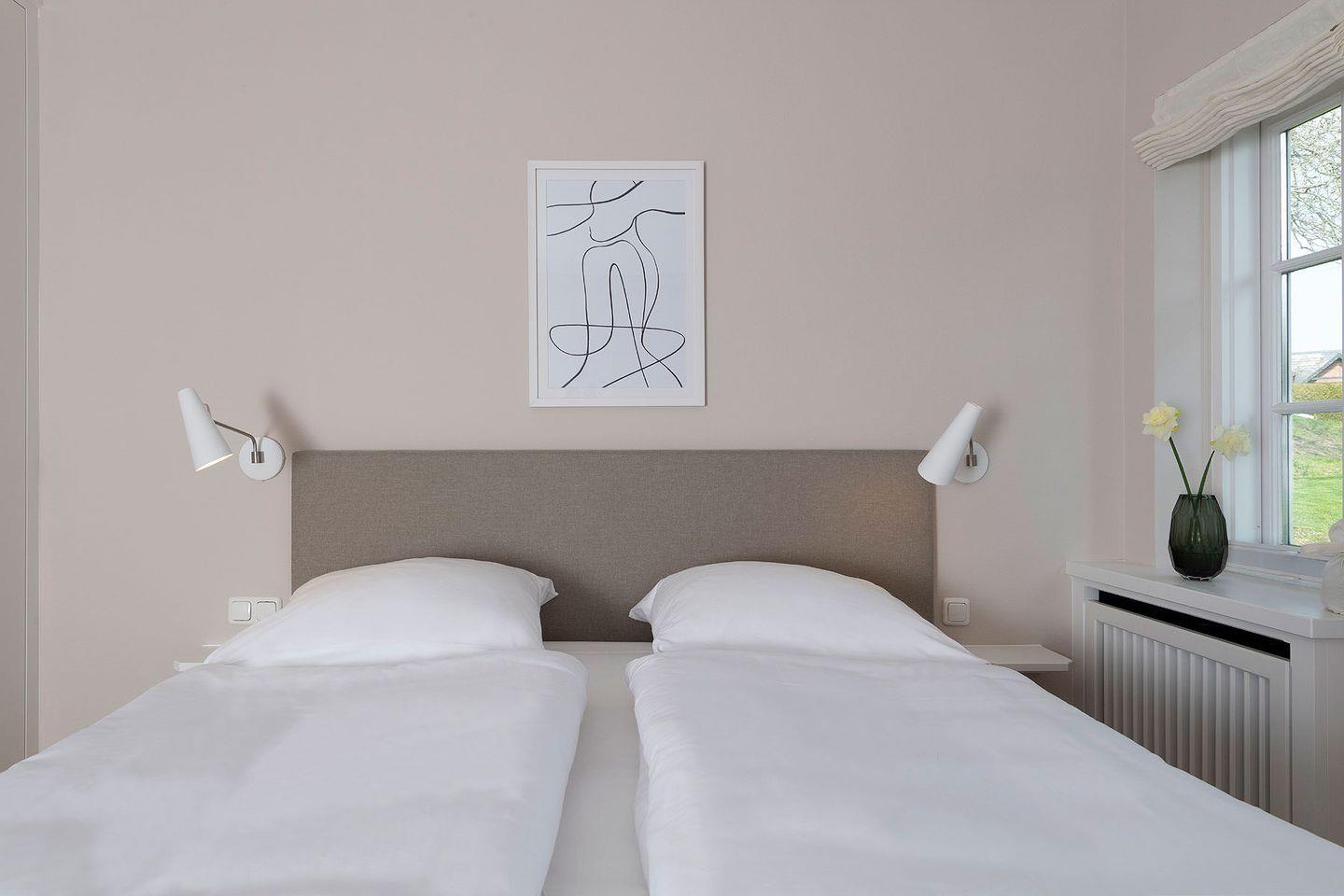 Das Ferien Domizil »Leichte Brise« befindet sich im Erdgeschoss des Groot's Hu¨s und bietet fu¨r maximal vier Personen ausreichend Platz, um gemeinsam auf zwei Ebenen und 112 m² entspannte Urlaubstage zu verbringen. Zwei jeweils an Wohn- und Schlafraum gelegene und nach Su¨den und Osten ausgerichtete Terrassen erweitern den Wohnbereich zum Gemeinschaftsgarten. Die Sonnenplätze sind jeweils mit Gartenmöbeln und Strandkorb ausgestattet.