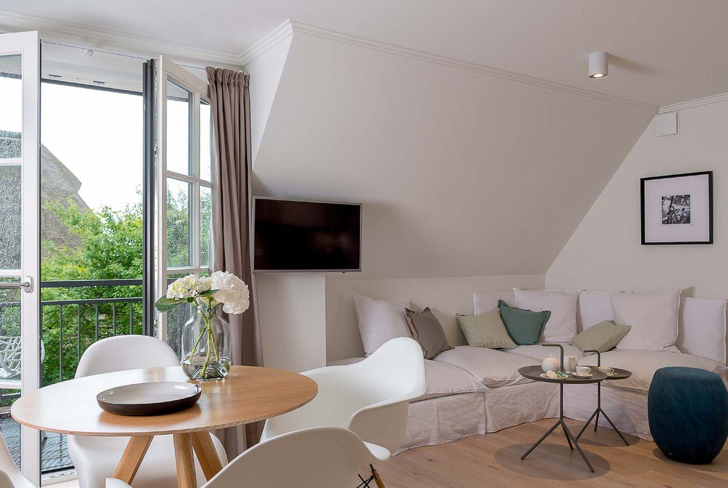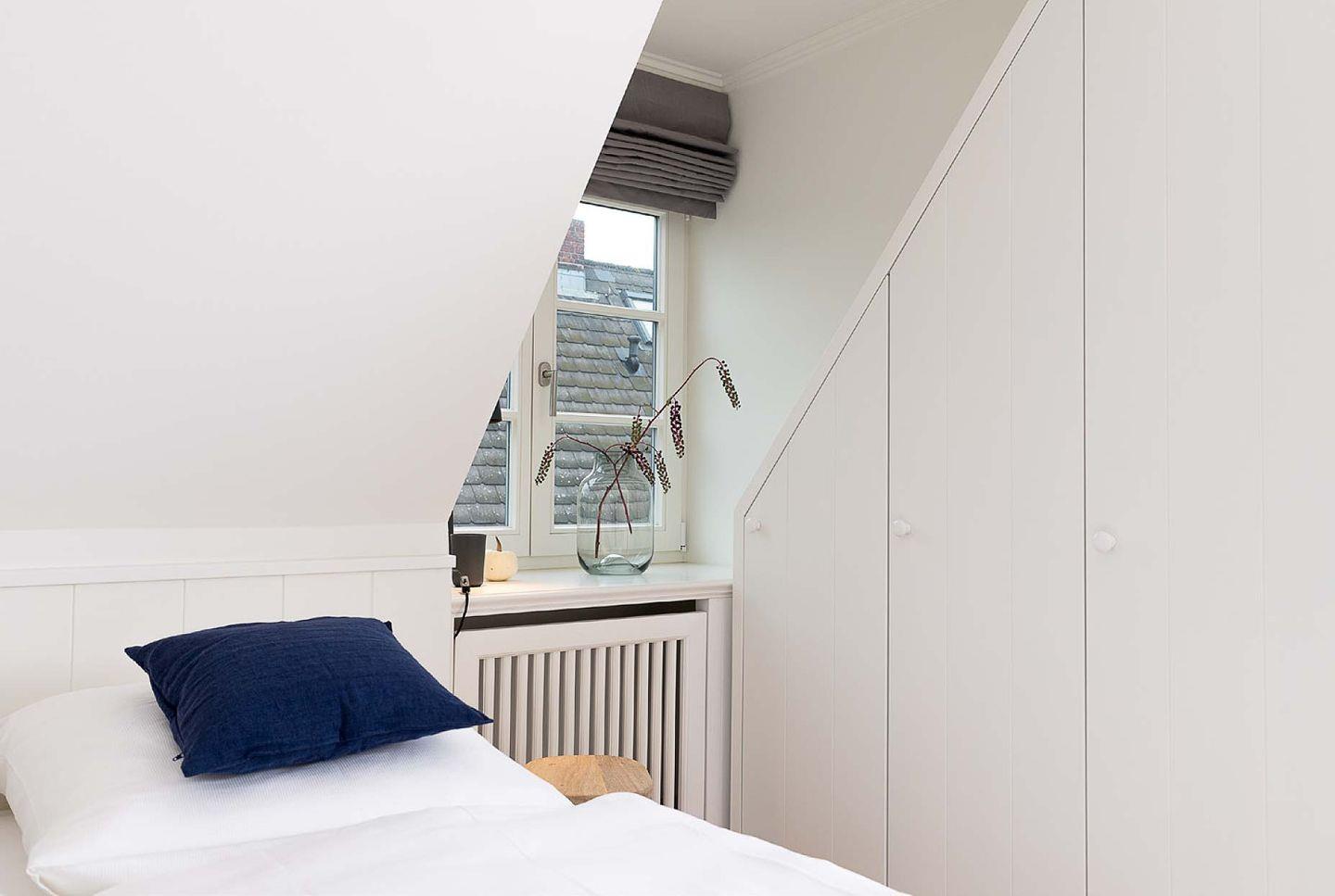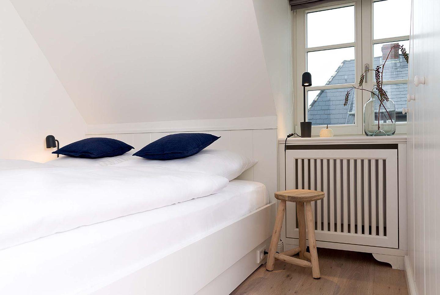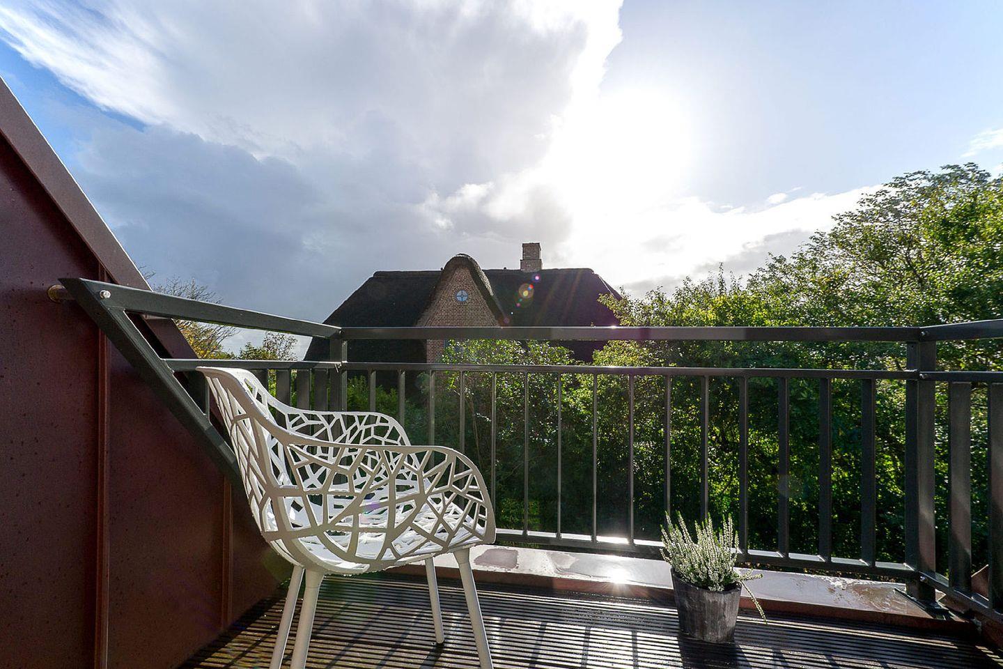 Das nicht erklärbare dänisch-behagliche »Hygge«-Gefühl kommt schon beim Eintritt auf, elegantes, modernes und warmes Interieur lässt eine harmonische, herrlich entspannte Atmosphäre entstehen. Unterschiedliche Farben grenzen einzelne Wohnzonen und Räume voneinander ab. Herzstück bildet der lichtdurchflutete Wohn- und Essbereich mit Sitzinsel, angrenzender südausgerichteter Loggia und einer offenen, voll ausgestatteten Küchenzeile. Von dem Wohnbereich mit angrenzendem gemütlichen Schlafzimmer und modernem Bad führt eine Innentreppe zu einem weiteren offenen Raum im Spitzgiebel – mit Weitblick bis zu den Dünen Westerlands.