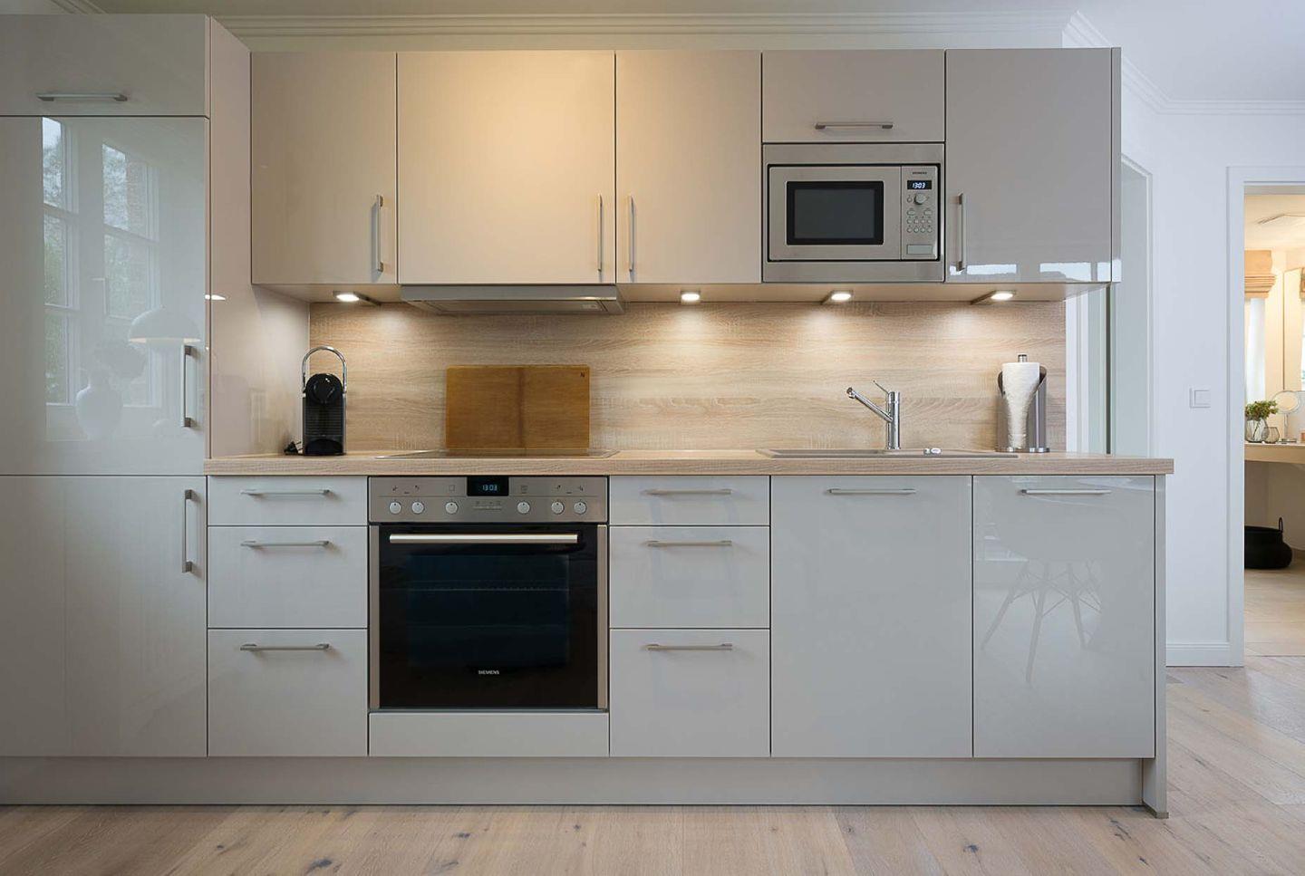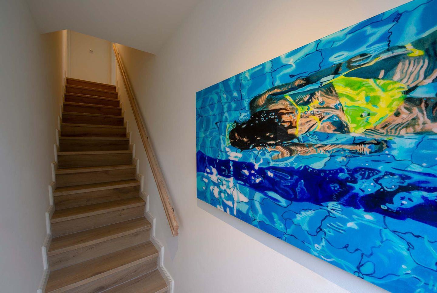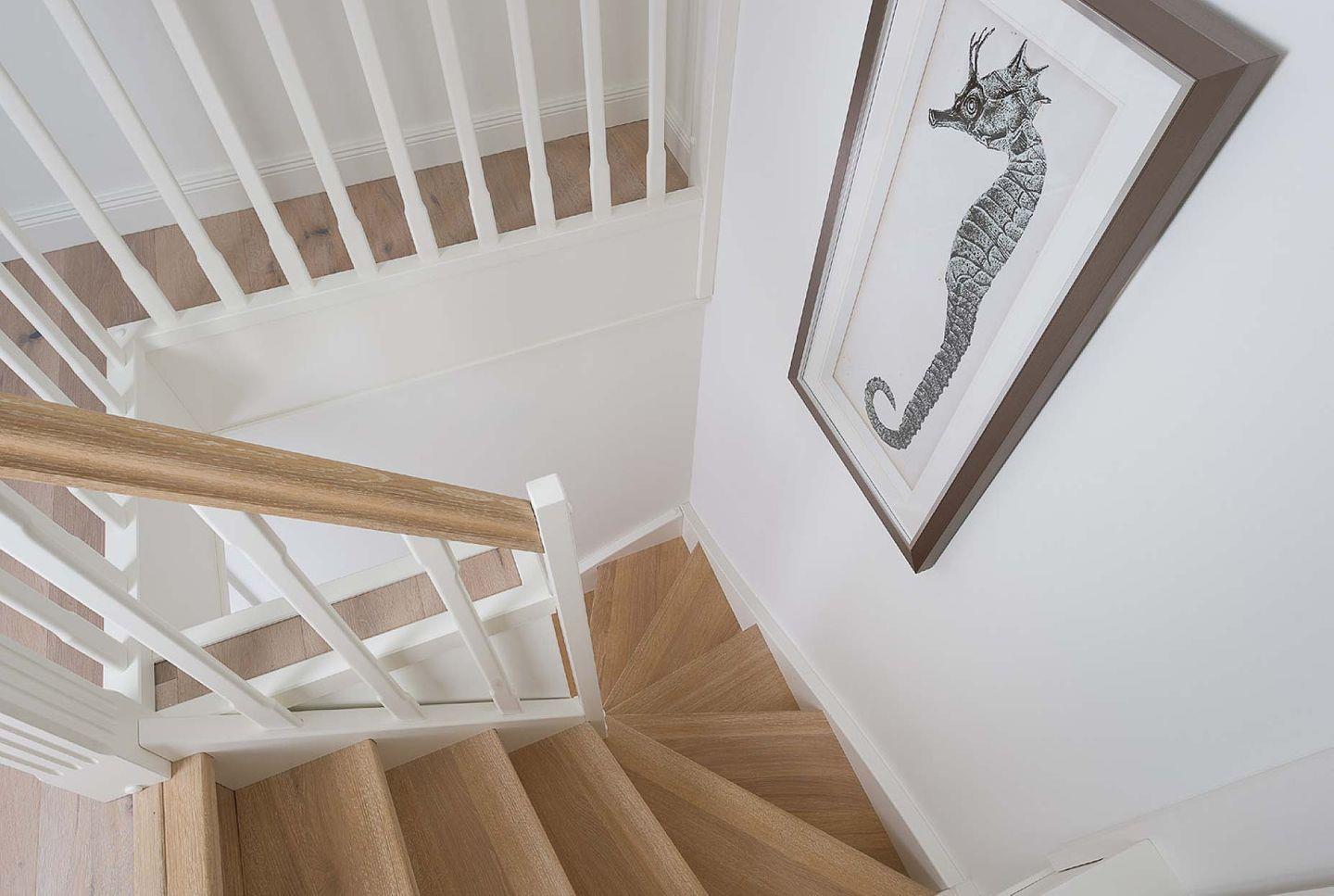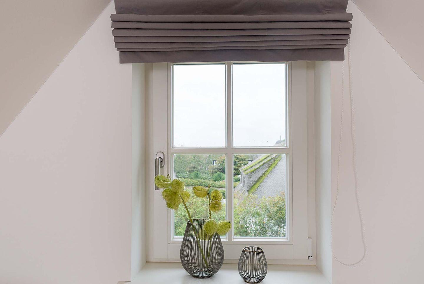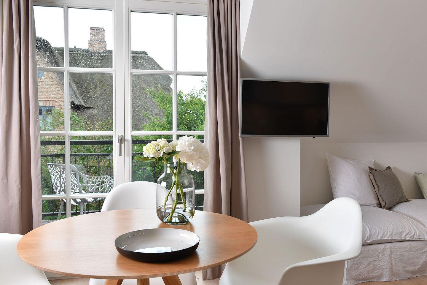 Das nicht erklärbare dänisch-behagliche »Hygge«-Gefühl kommt schon beim Eintritt auf, elegantes, modernes und warmes Interieur lässt eine harmonische, herrlich entspannte Atmosphäre entstehen. Unterschiedliche Farben grenzen einzelne Wohnzonen und Räume voneinander ab. Herzstück bildet der lichtdurchflutete Wohn- und Essbereich mit Sitzinsel, angrenzender südausgerichteter Loggia und einer offenen, voll ausgestatteten Küchenzeile. Von dem Wohnbereich mit angrenzendem gemütlichen Schlafzimmer und modernem Bad führt eine Innentreppe zu einem weiteren offenen Raum im Spitzgiebel – mit Weitblick bis zu den Dünen Westerlands.