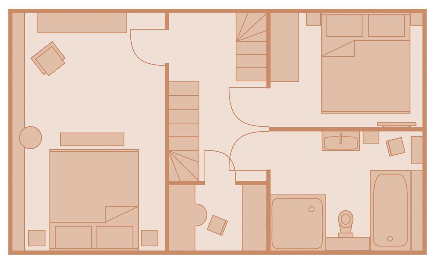 Obergeschoss: 1 Doppelzimmer, 1 Grandlitzimmer mit TV, Badezimmer mit Dusche, Badewanne und WC, kleines Arbeitszimmer