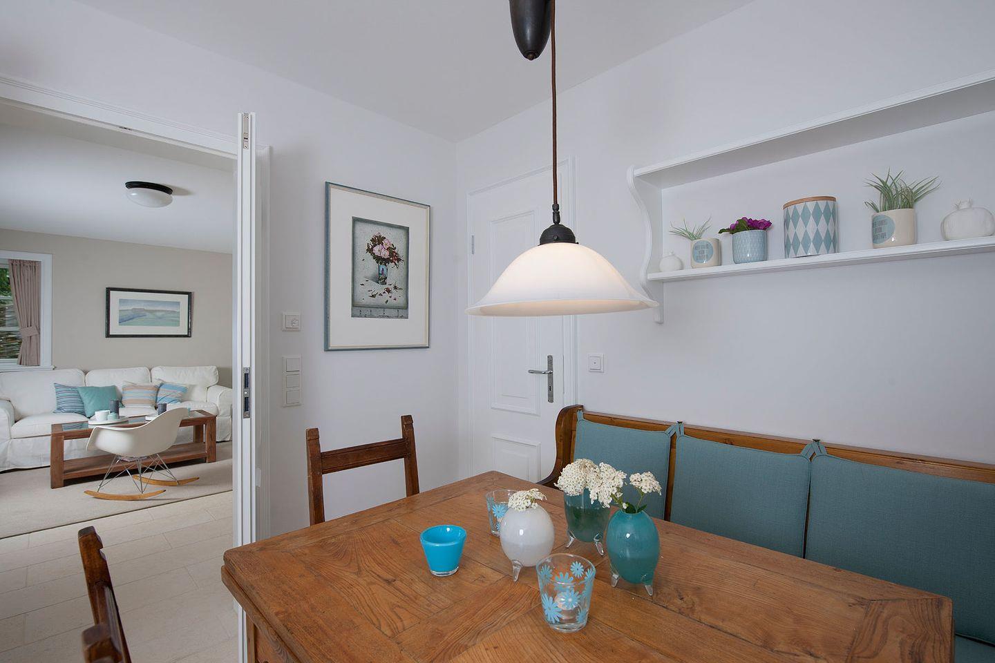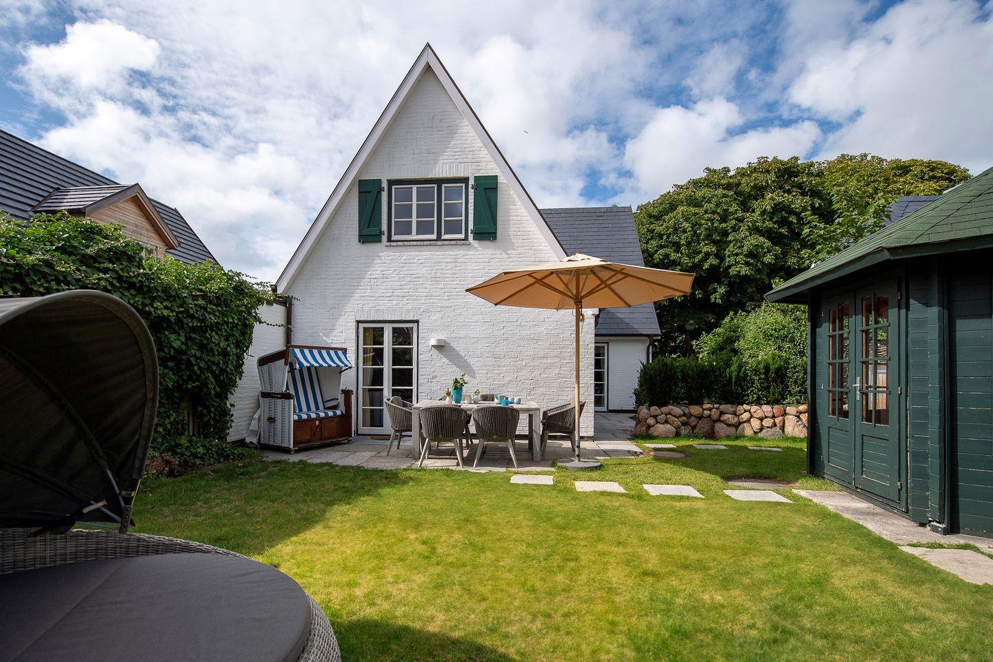 Erdgeschoss: Flur mit Garderobe, 1 Badezimmer mit Dusche und WC, komplett eingerichtete, separate Küche mit Essecke, Vorratsraum, Nespresso-Maschine und Waschmaschine mit Trockner, Wohnzimmer mit Kachelofen und Esstisch, Bibliothek mit TV, eingewachsener, ruhiger Garten, Süd-Terrasse mit Strandkorb, Gartenlaube mit Gartenmöbeln, Gartenbox für 2 Fahrräder