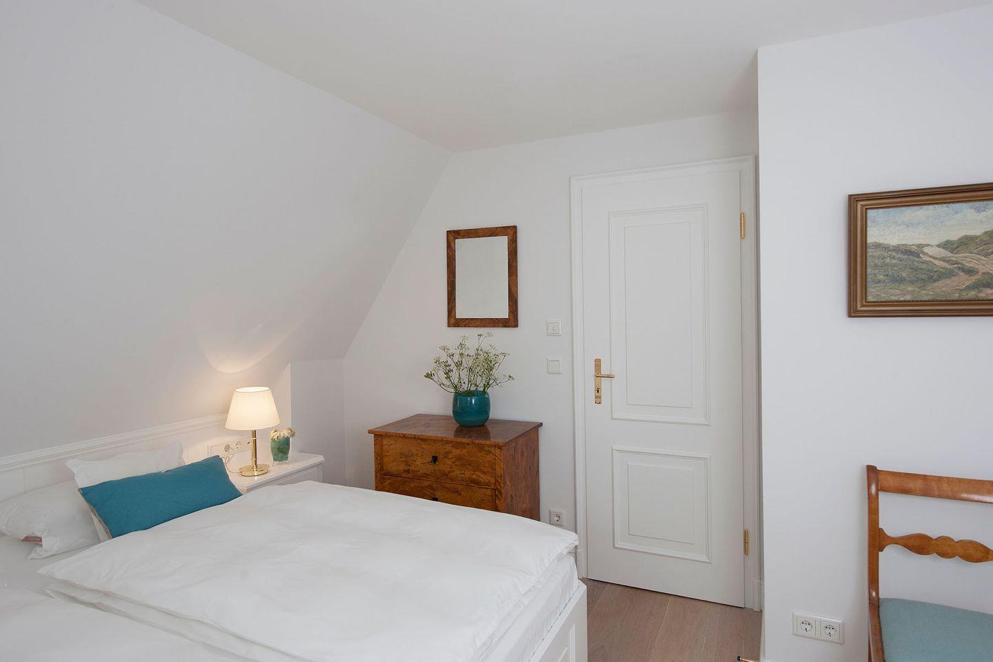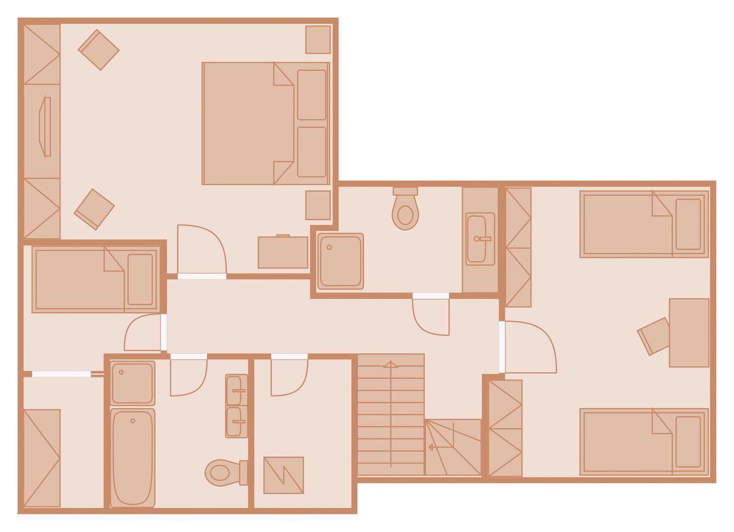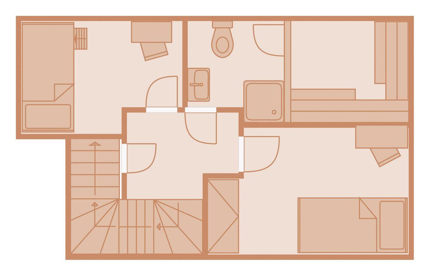 Obergeschoss: 1 Doppelzimmer mit TV, 1 Schlafzimmer mit 2 getrennt stehenden Einzelbetten und TV, 1 Schlafzimmer mit Bett 120 cm breit, 1 Badezimmer mit Badewanne, Dusche und WC, 1 Badezimmer mit Dusche und WC, Abstellraum