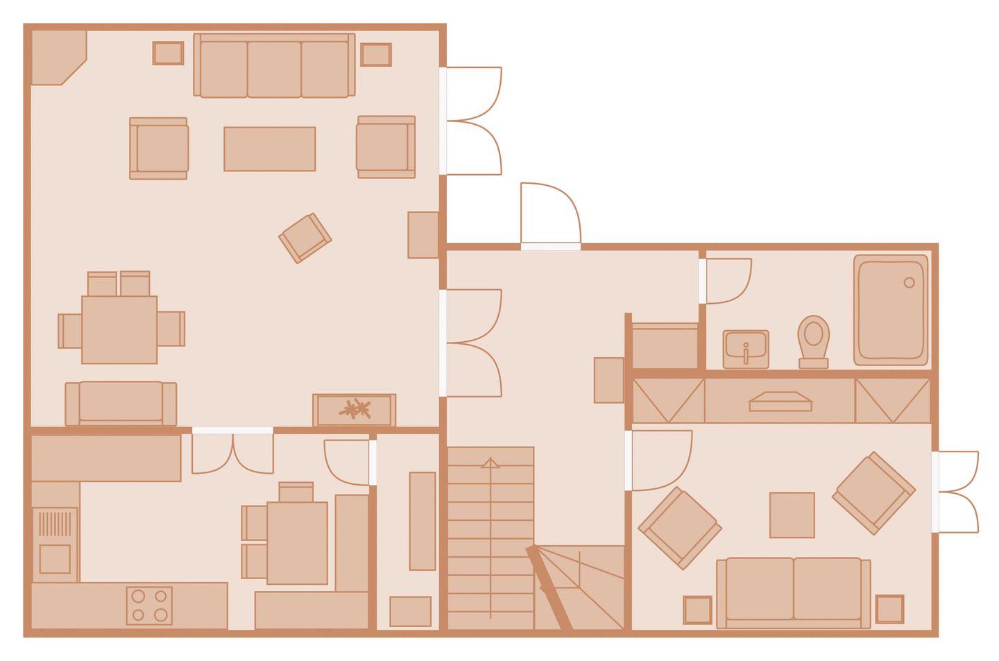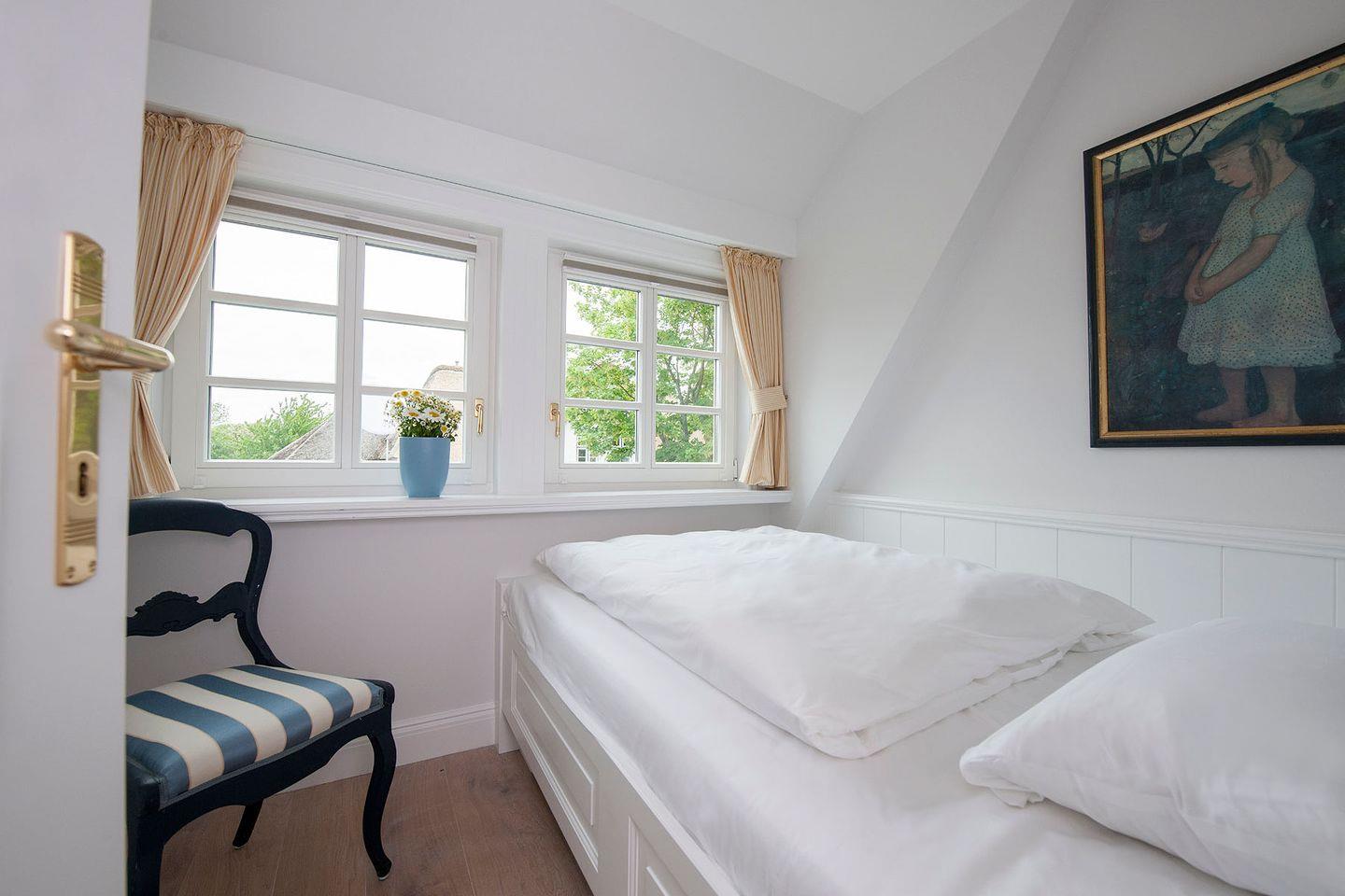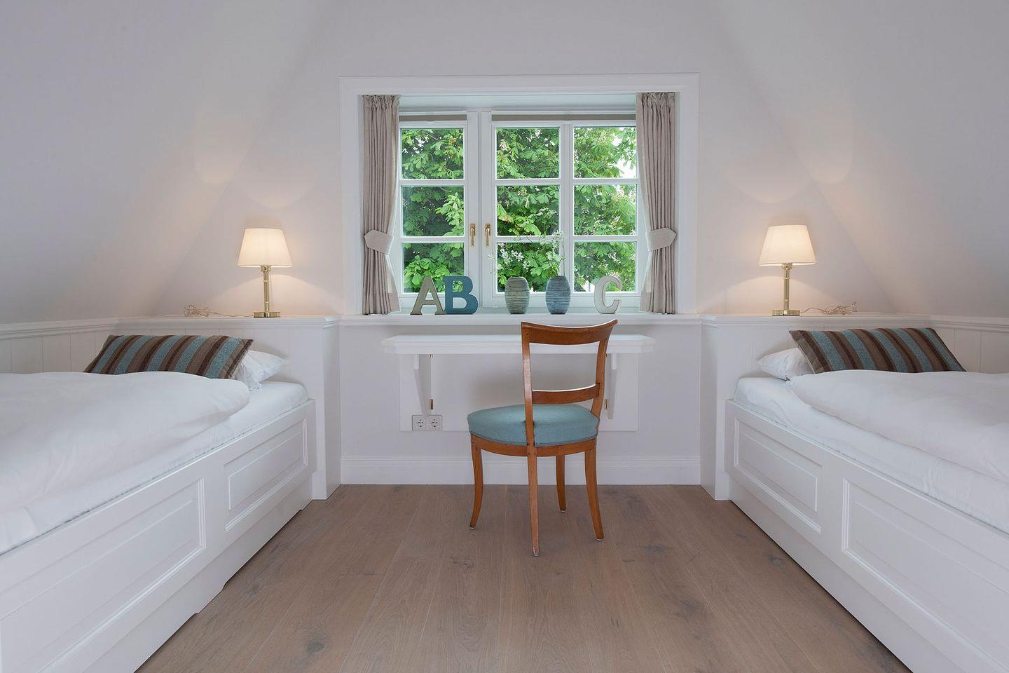 Obergeschoss: 1 Doppelzimmer mit TV, 1 Schlafzimmer mit 2 getrennt stehenden Einzelbetten und TV, 1 Schlafzimmer mit Bett 120 cm breit, 1 Badezimmer mit Badewanne, Dusche und WC, 1 Badezimmer mit Dusche und WC, Abstellraum