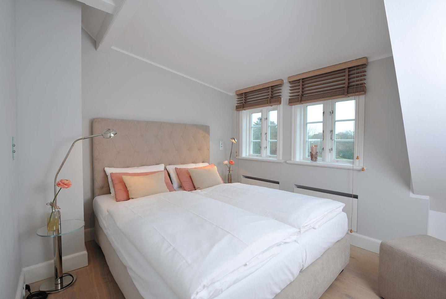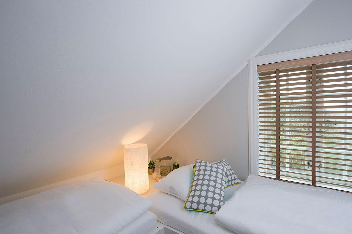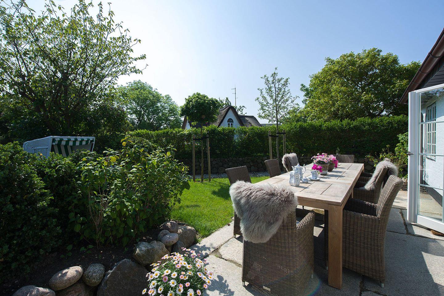 Obergeschoss: 1 Doppelzimmer, 2 Zimmer mit getrennt stehenden Betten, 1 Badezimmer mit Dusche und WC, Garten, Südost-Terrasse mit Gartenmöbeln und Strandkorb