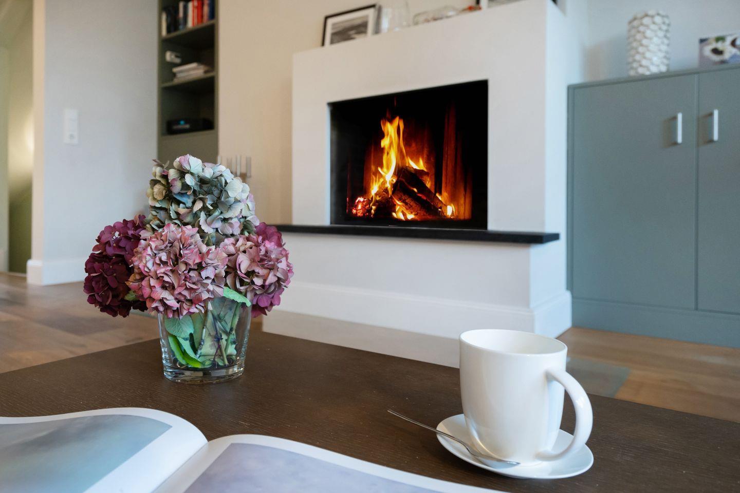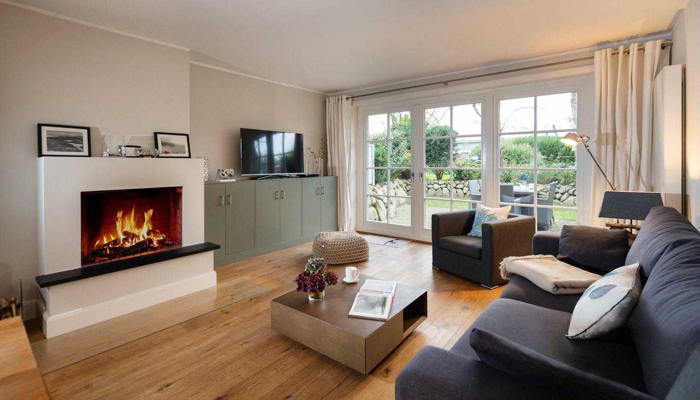 Erdgeschoss: Komplett eingerichtete offene Küche mit Nespresso-Maschine, Wohnzimmer mit Essbereich, offenem Kamin, und TV, ruhige Gartenterrasse zum Westen mit Gartenmöbeln