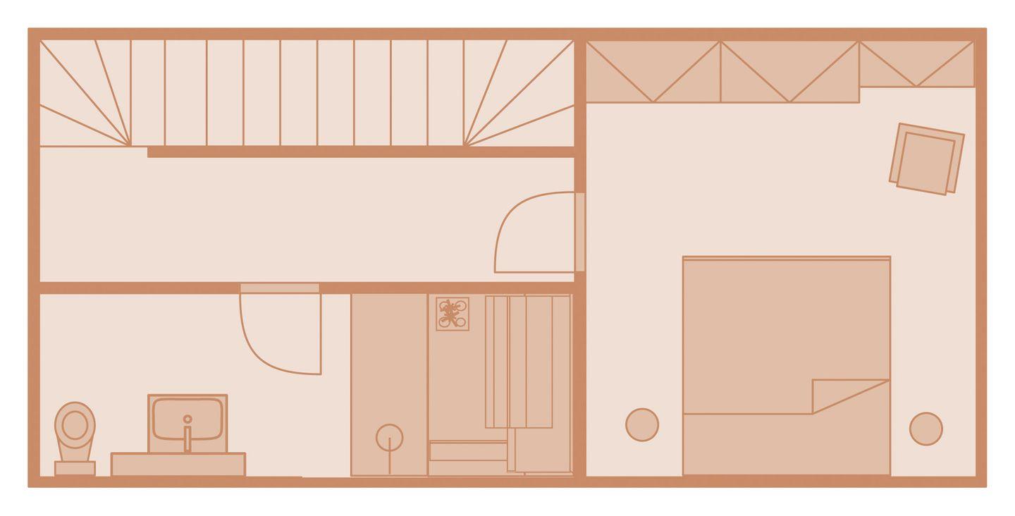 Obergeschoss: 1 Doppelzimmer mit TV, Badezimmer mit Badewanne, Dusche und WC