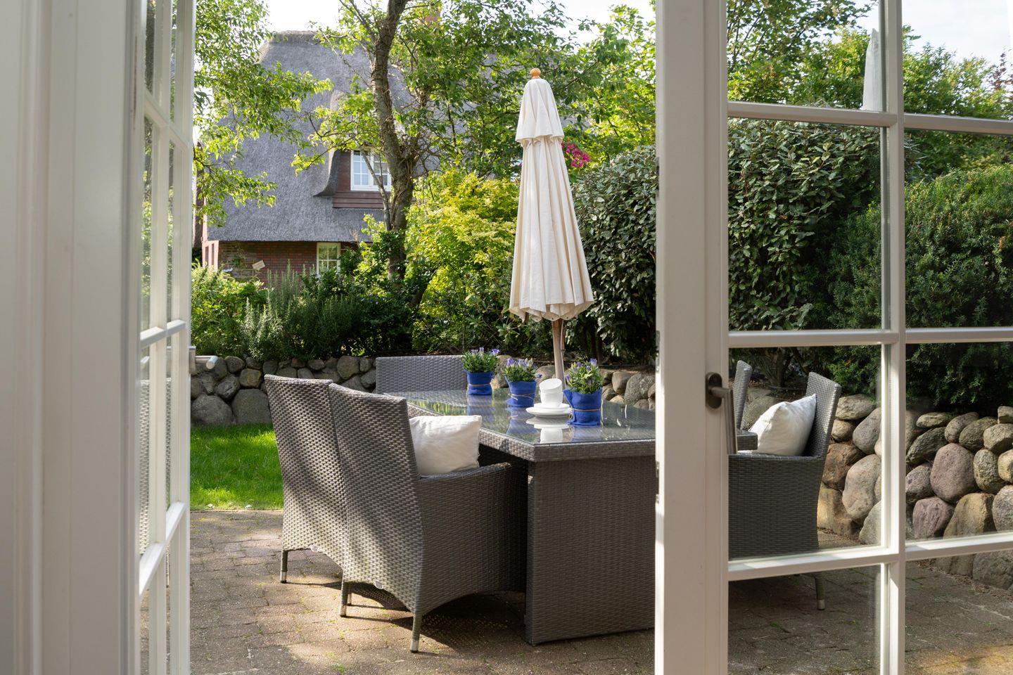 Die nach Westen ausgerichtete Terrasse erweitert den Wohnbereich zu den Sonnenplätzen im Garten. Geschmackvolle Gartenmöbel auf der in Naturstein ausgeführten Terrasse laden in aller Ruhe zum Wohlfühlen ein.