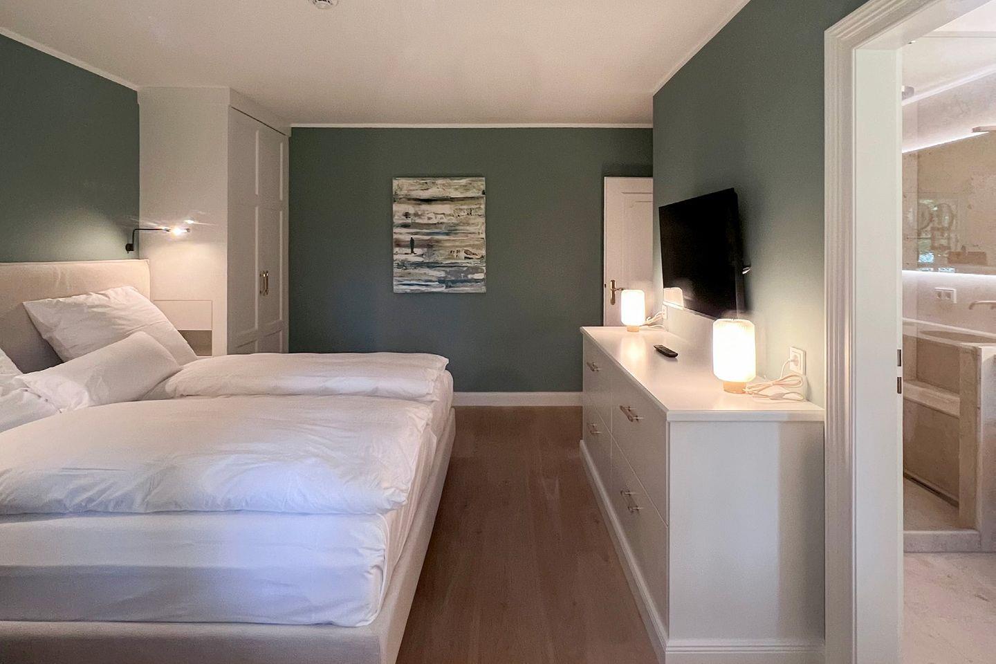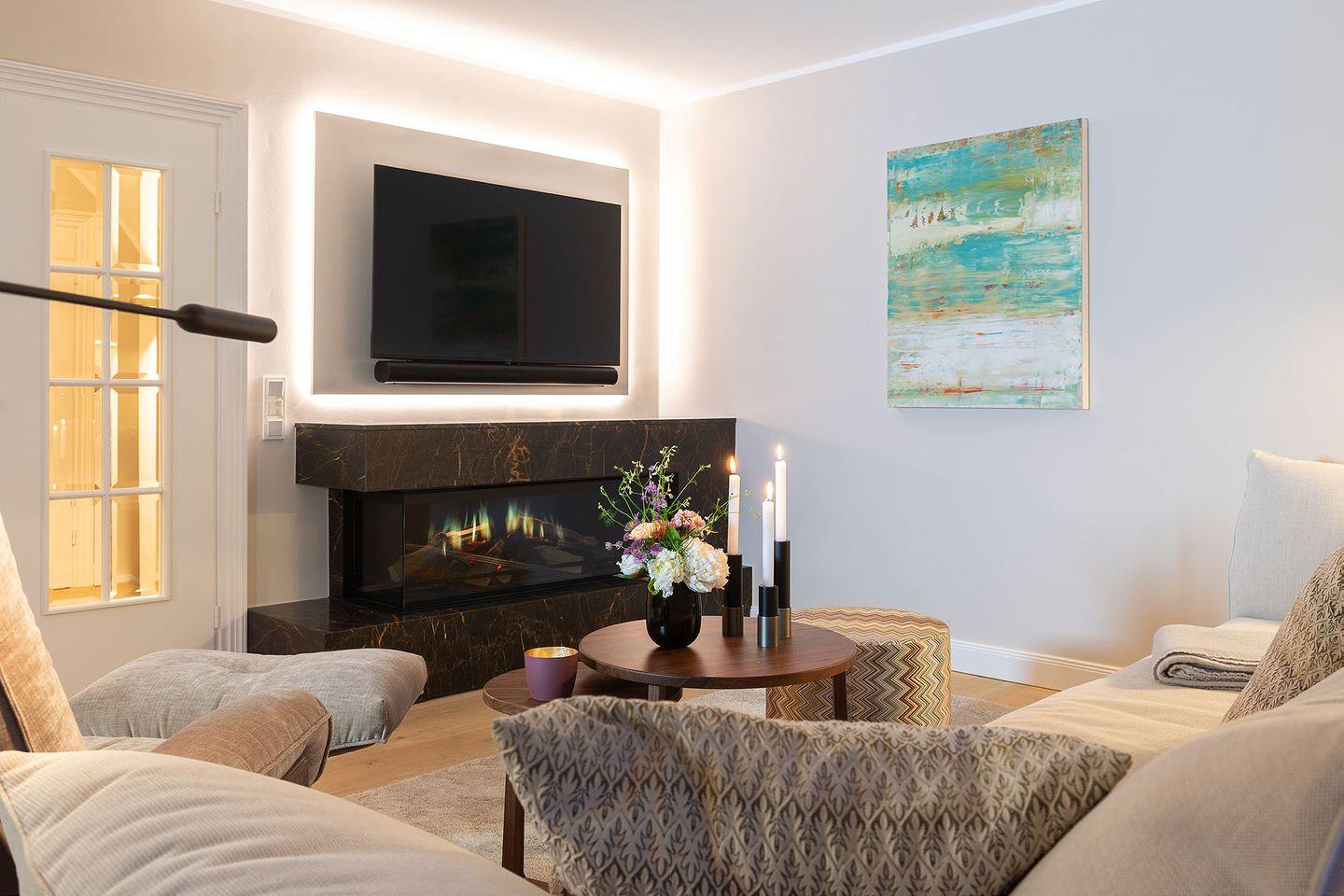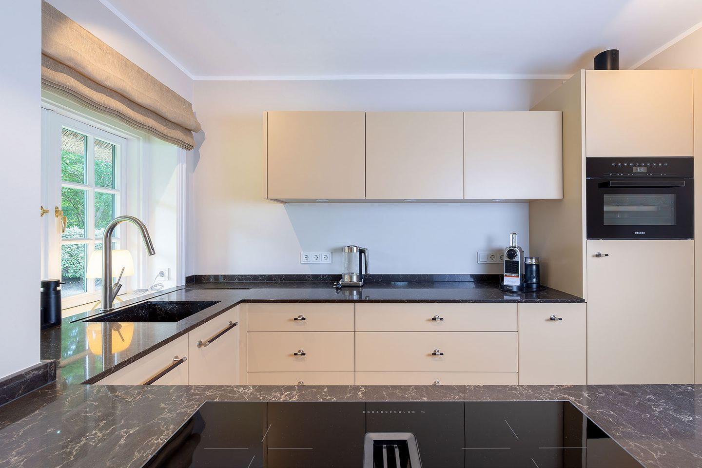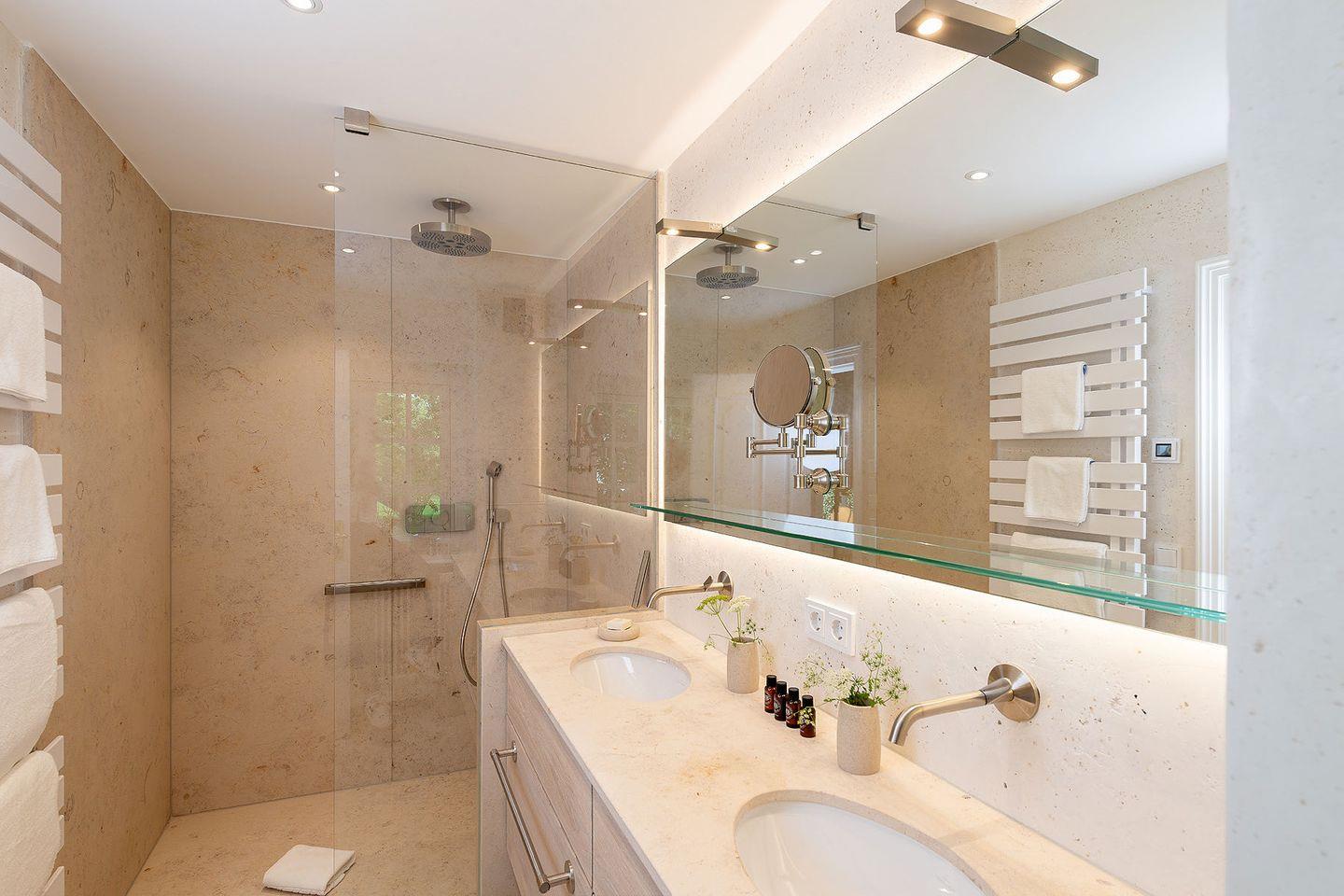 Erdgeschoss befindet sich ein offener Wohn- und Essbereich mit einer gemu¨tlichen Wohnlandschaft und einem runden Esstisch sowie ein Schlafzimmer mit angeschlossenem Bad. Warme Natur- und Blautöne schaffen ein sympathisches Wohnambiente. Die moderne, offene Ku¨che ist mit hochwertigen Miele-Geräten wie z.B. einem Dampfbackofen ausgestattet, u¨ber den sich kochbegeisterte Gäste freuen werden. An ku¨hleren Tagen sorgt ein Elektro-Kamin fu¨r wohlige Wärme; eine Sonos-Musikanlage erlaubt eine individuelle musikalische Untermalung in allen Räumen. Im Souterrain des Hauses befindet sich ein Schlafzimmer mit Doppelbett und Chaiselongue, erweitert um ein Private SPA mit Sauna und großer Dusche. Hier können sich die Bewohner in ihre eigene kleine Wellness- Oase zuru¨ckziehen, Ruhe und Entspannung genießen und neue Energie tanken.