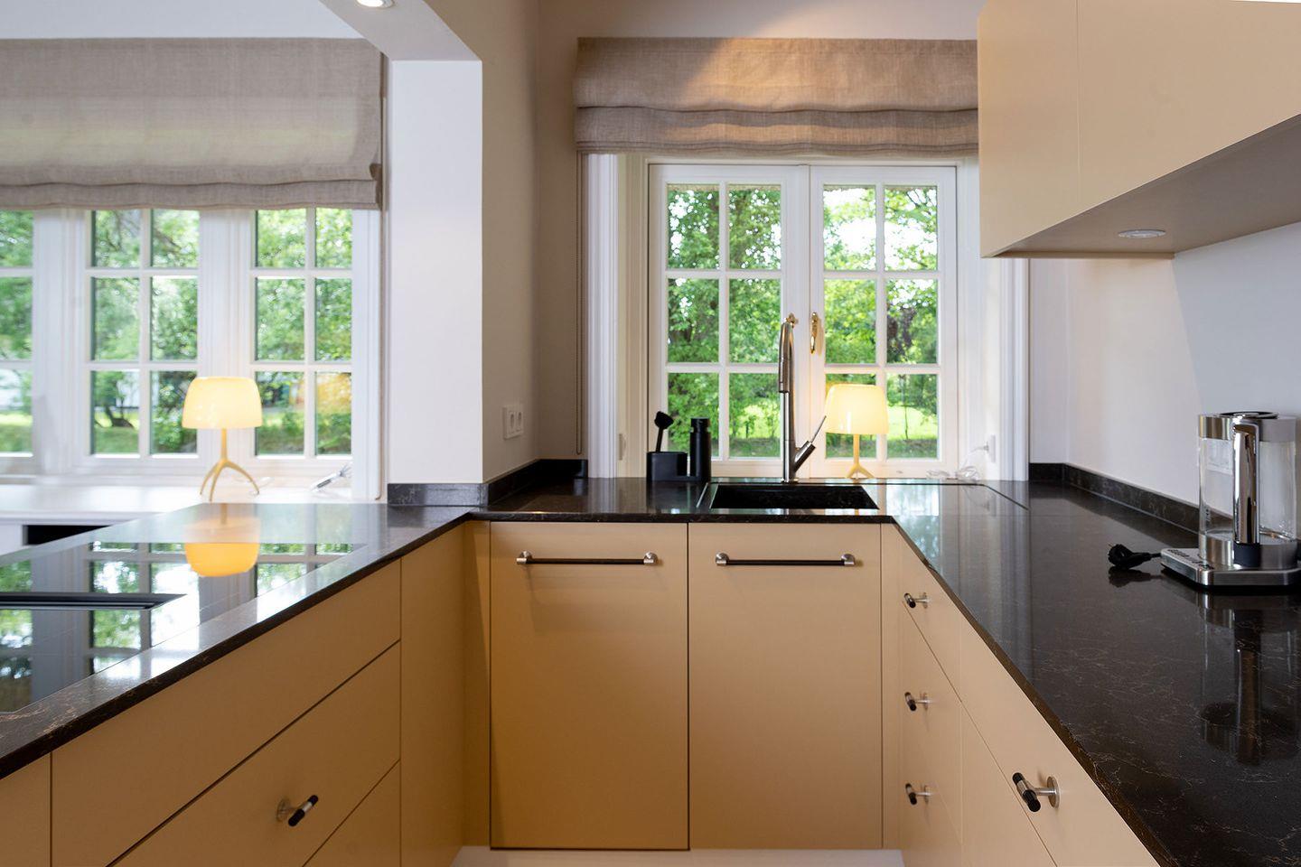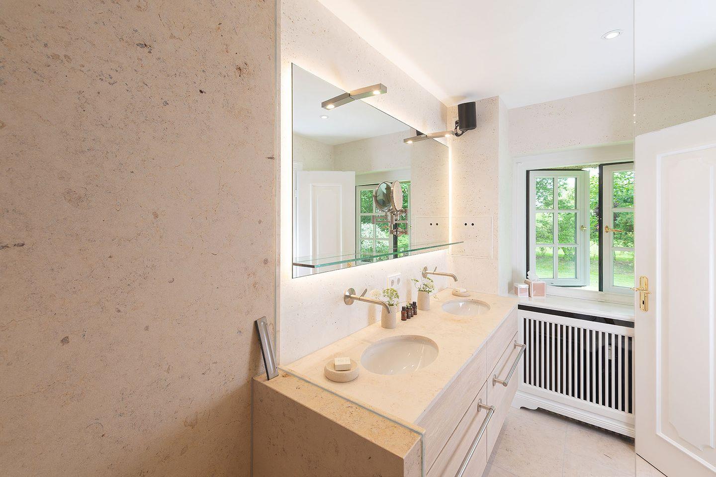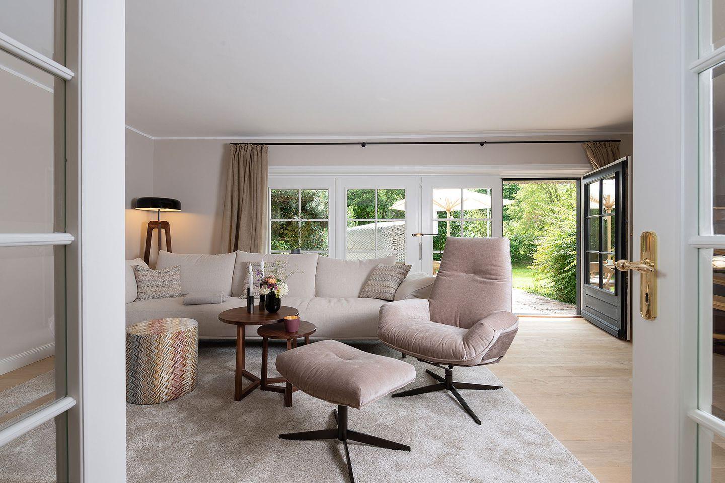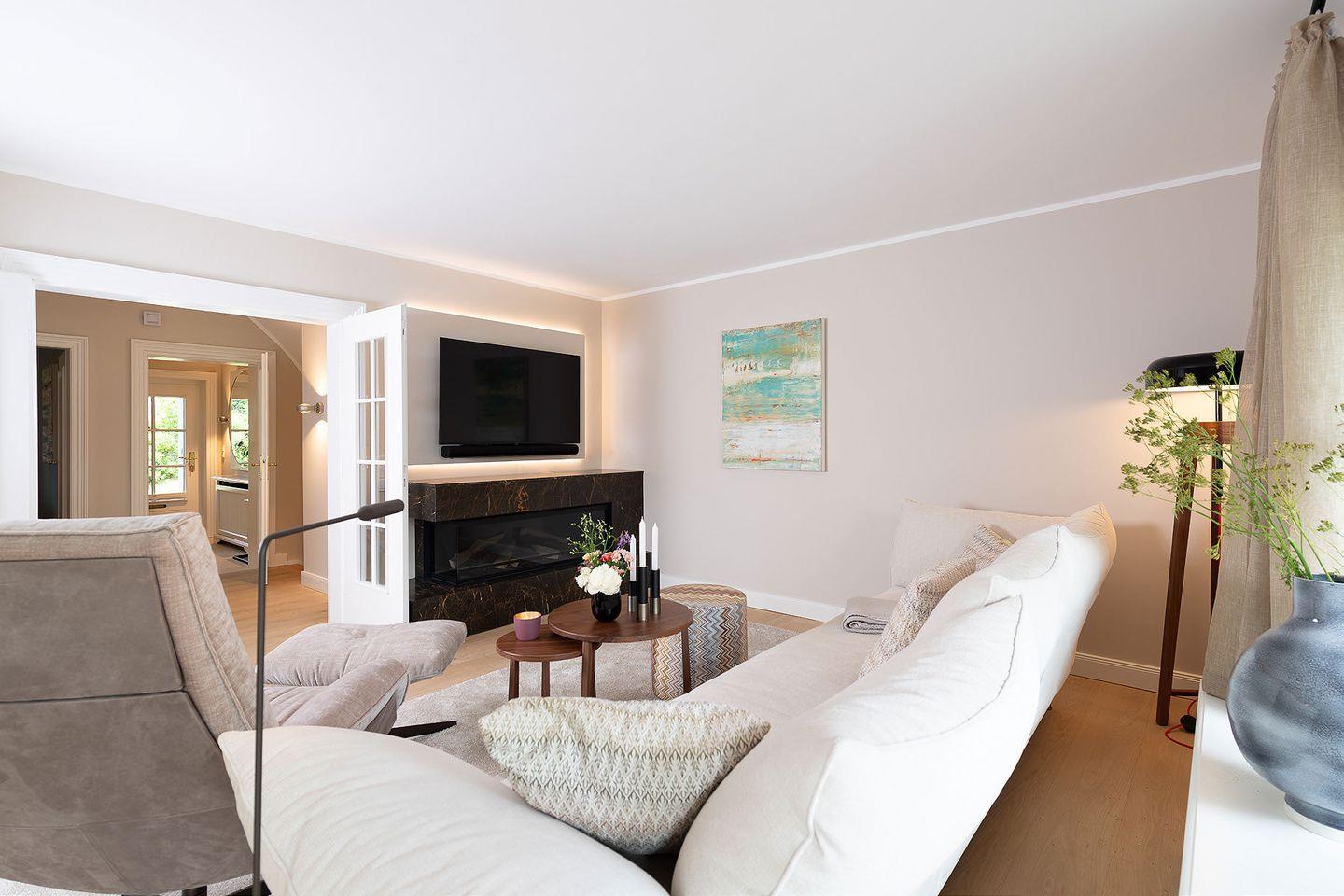 Erdgeschoss befindet sich ein offener Wohn- und Essbereich mit einer gemu¨tlichen Wohnlandschaft und einem runden Esstisch sowie ein Schlafzimmer mit angeschlossenem Bad. Warme Natur- und Blautöne schaffen ein sympathisches Wohnambiente. Die moderne, offene Ku¨che ist mit hochwertigen Miele-Geräten wie z.B. einem Dampfbackofen ausgestattet, u¨ber den sich kochbegeisterte Gäste freuen werden. An ku¨hleren Tagen sorgt ein Elektro-Kamin fu¨r wohlige Wärme; eine Sonos-Musikanlage erlaubt eine individuelle musikalische Untermalung in allen Räumen. Im Souterrain des Hauses befindet sich ein Schlafzimmer mit Doppelbett und Chaiselongue, erweitert um ein Private SPA mit Sauna und großer Dusche. Hier können sich die Bewohner in ihre eigene kleine Wellness- Oase zuru¨ckziehen, Ruhe und Entspannung genießen und neue Energie tanken.
