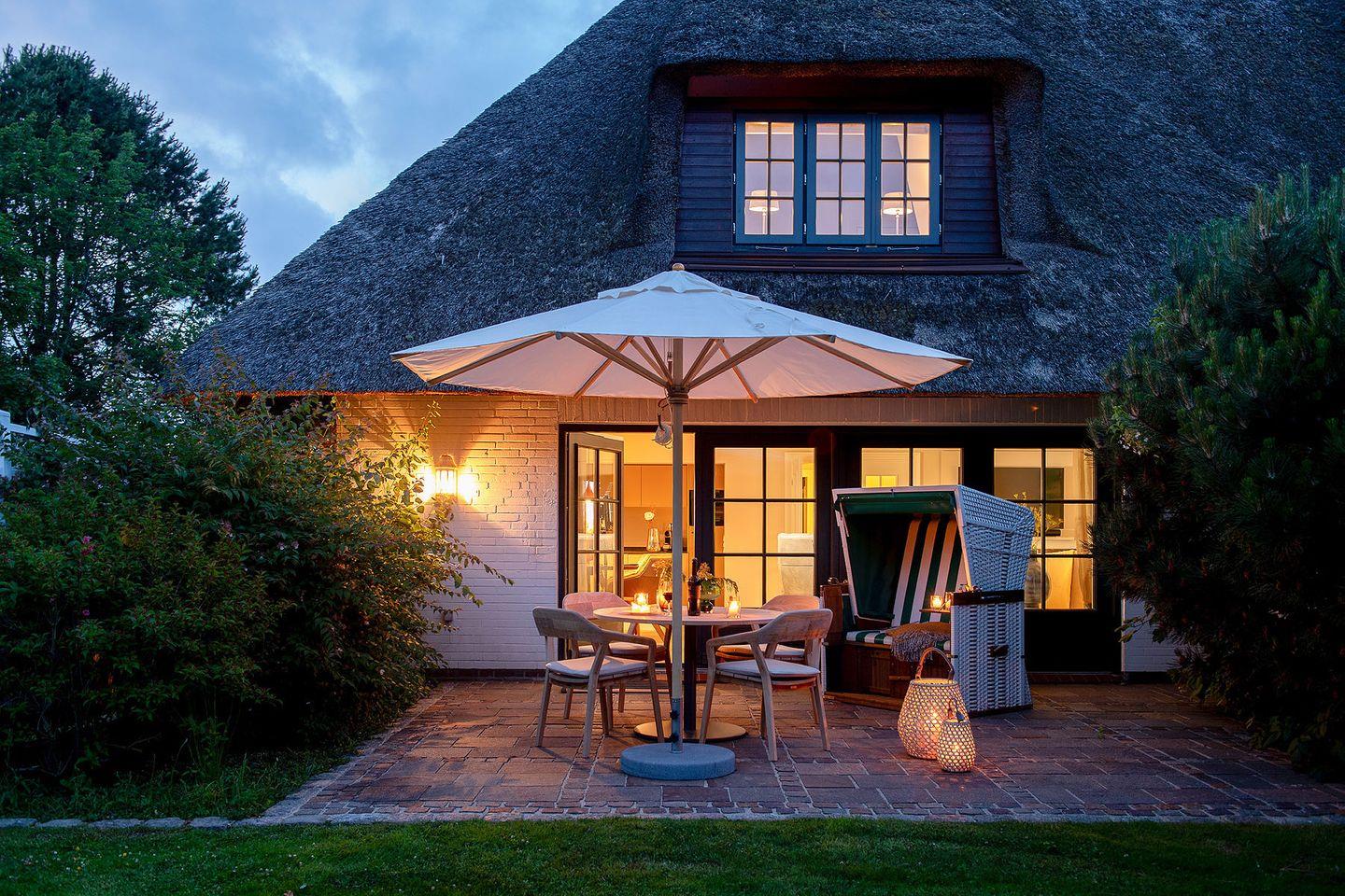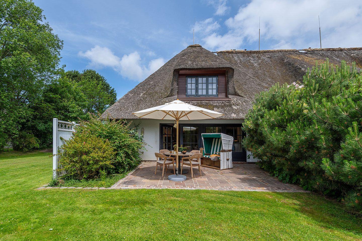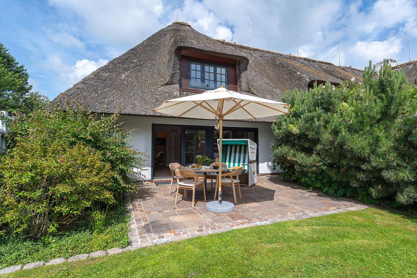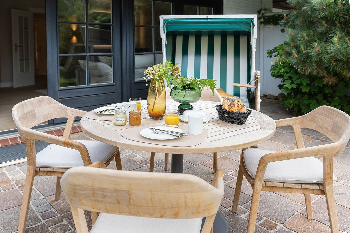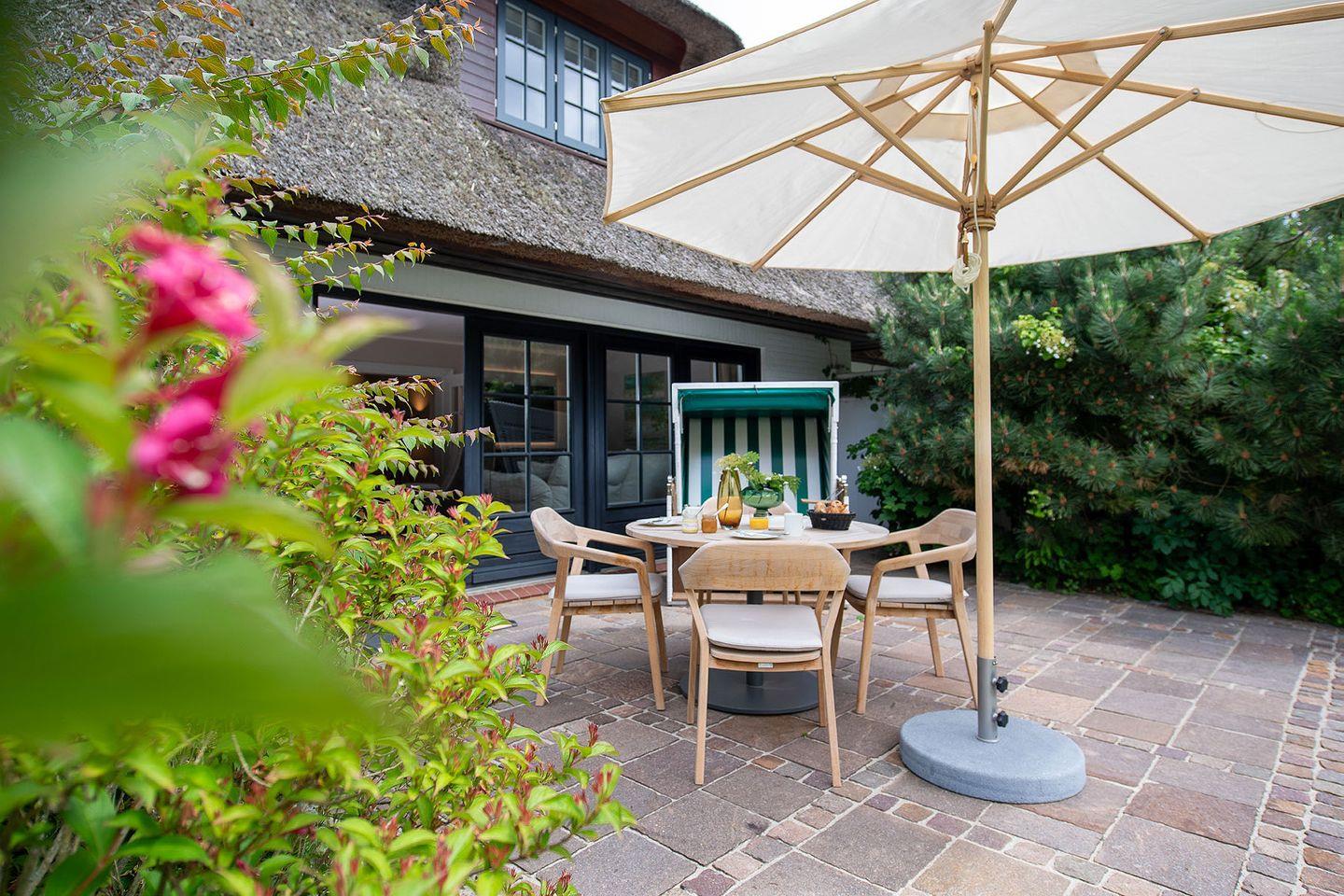 Die nach Su¨den ausgerichtete Terrasse aus Naturstein ist mit Gartenmöbeln und einem Strandkorb ausgestattet. Sie öffnet den Wohnbereich zu den sonnigen Plätzen der großzu¨gigen 1.890 m² großen Gemeinschaftsgartenanlage, die den ganzen Tag u¨ber Sonne bietet.