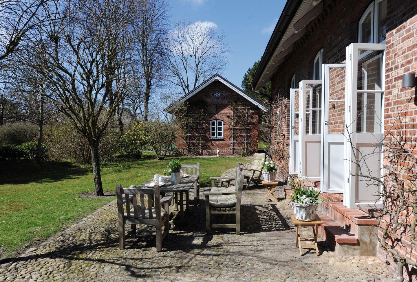 Flur, komplett eingerichtete separate Küche mit Essbereich und Nespresso-Maschine, Gäste-WC, 1 Doppelzimmer mit TV und ensuite Badezimmer mit Dusche und WC, Wohnzimmer mit TV, 1 Doppelzimmer mit TV, 1 Doppelzimmer, Badezimmer mit Badewanne und WC, großer eingewachsener Garten, Südwest-Terrasse mit Gartenmöbeln