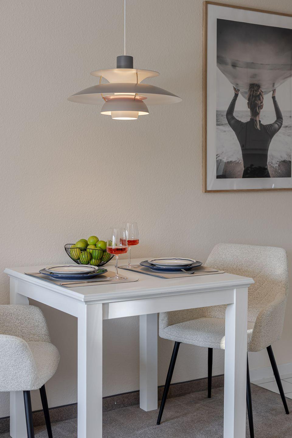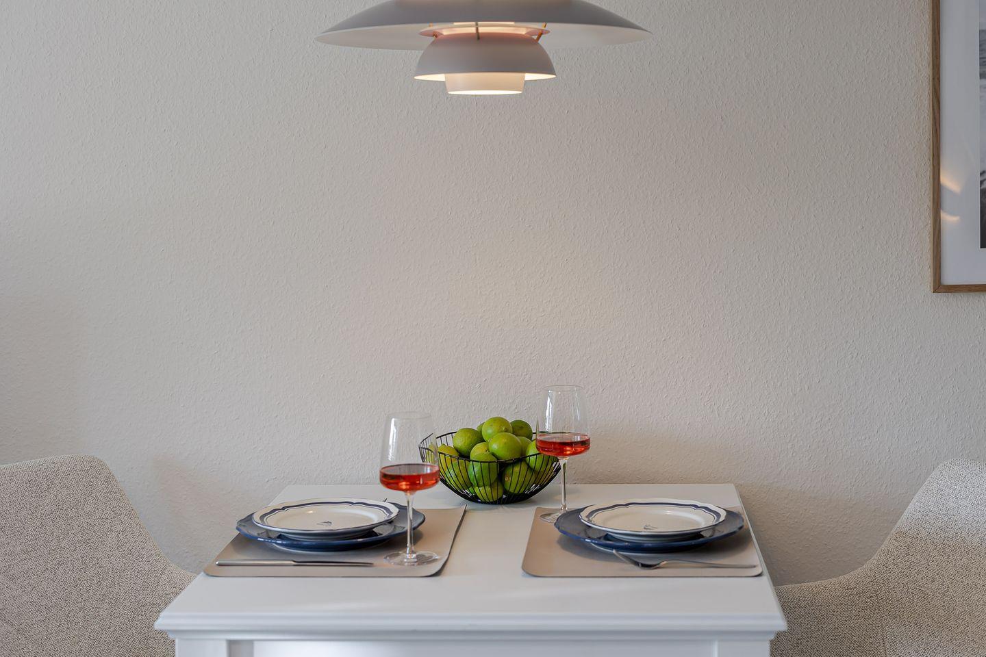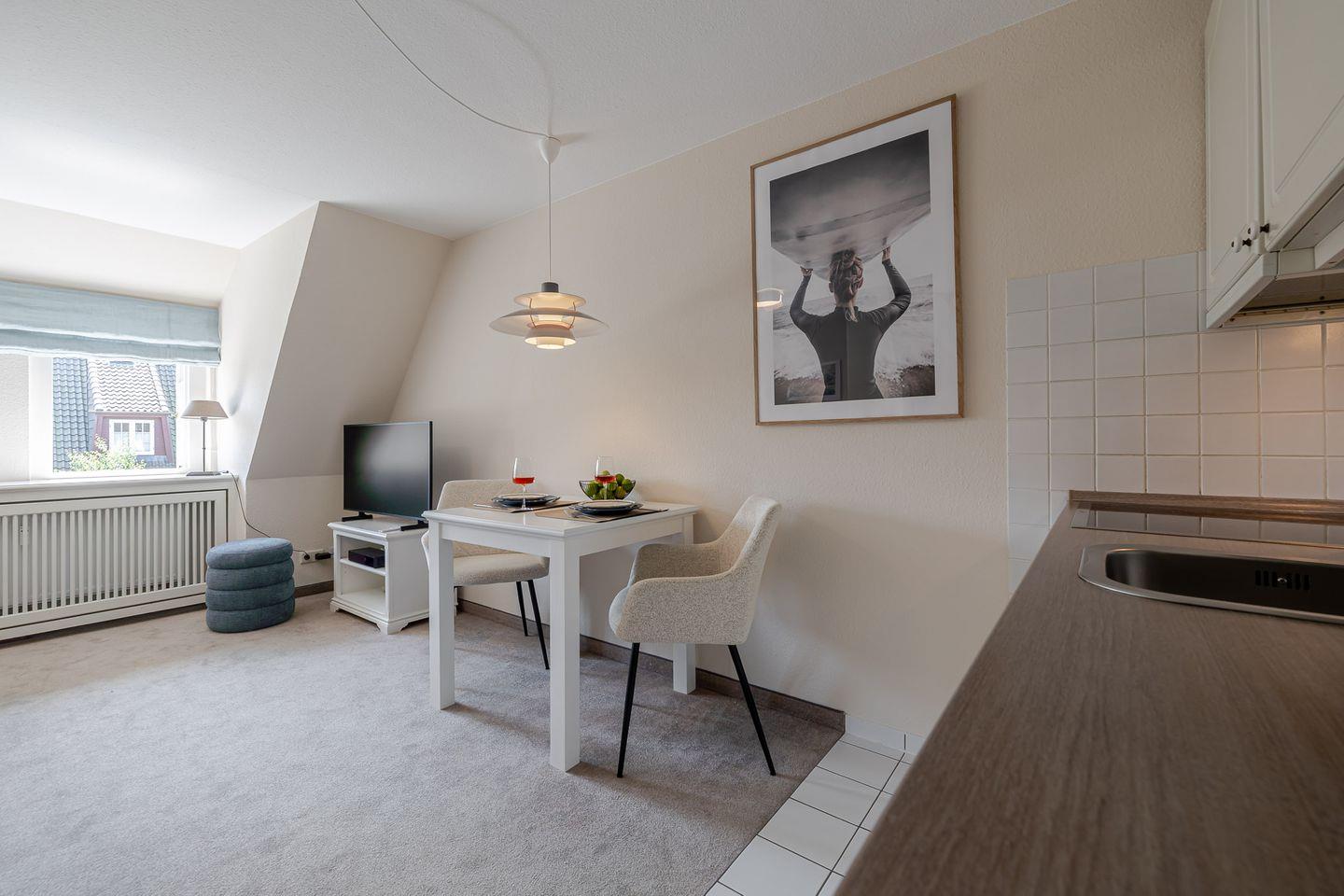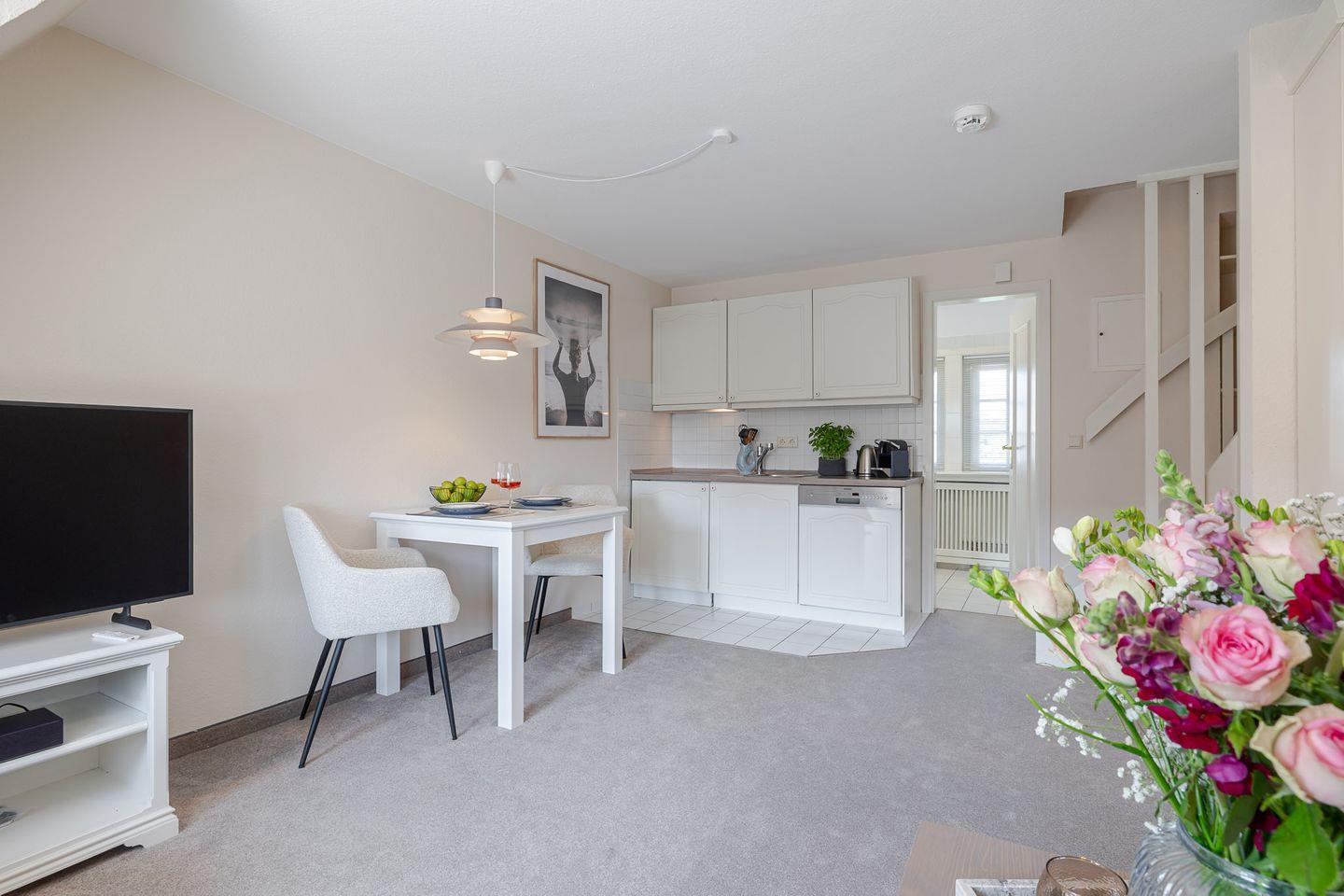Die offene Küche mit Essbereich fügt sich harmonisch in den Raum ein und ist bestens für kleine Mahlzeiten ausgestattet – auch ohne Backofen oder Mikrowelle finden Sie hier alles, um sich zwischendurch etwas Leckeres zu zaubern.