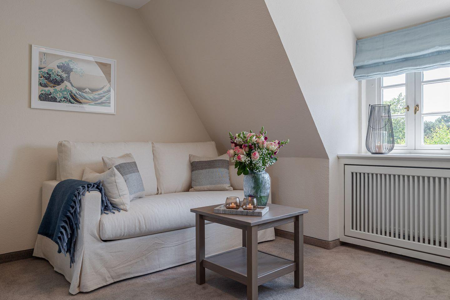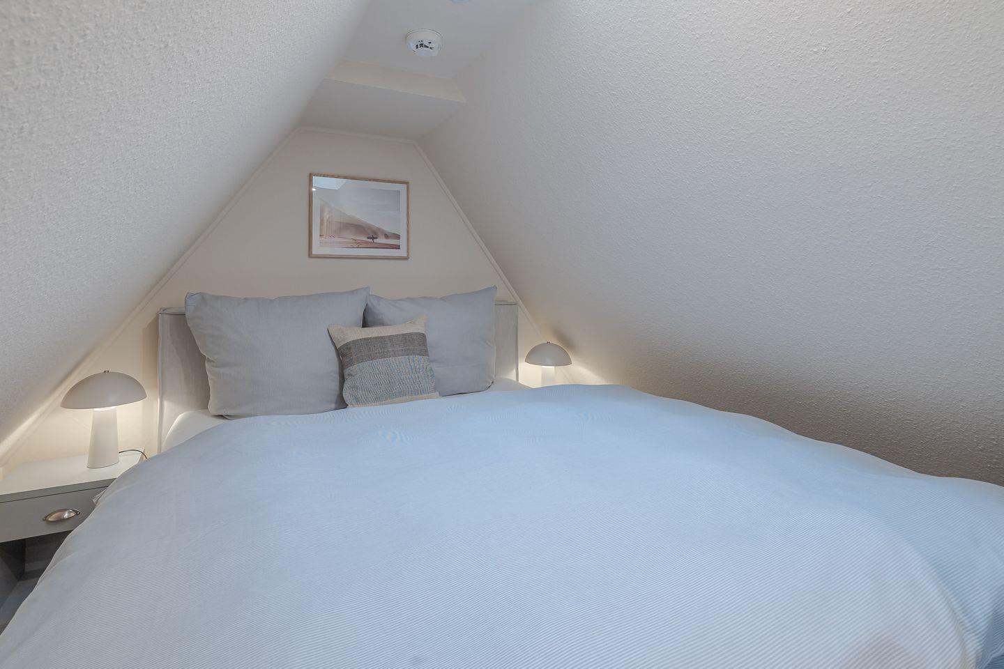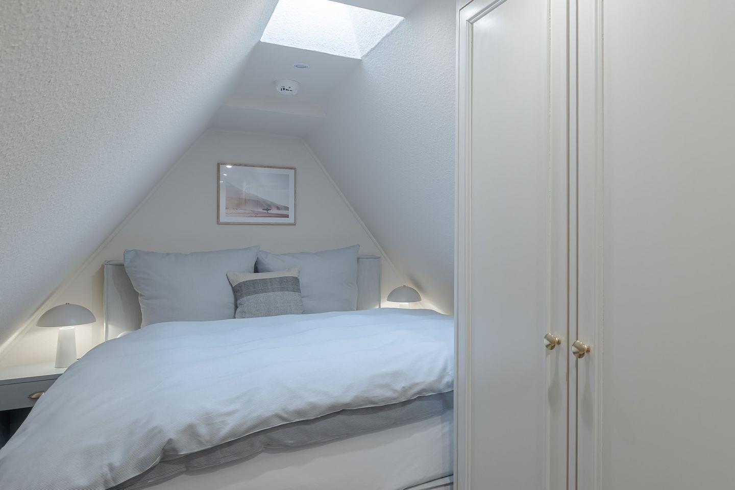 Über eine Treppe gelangen Sie ins behagliche Schlafzimmer im Dachgeschoss. Mit seinen schrägen Wänden, der niedrigen Decke und dem Dachfenster wirkt es fast wie eine kleine Kajüte – ein Platz zum Entspannen, Lesen und Ausschlafen.