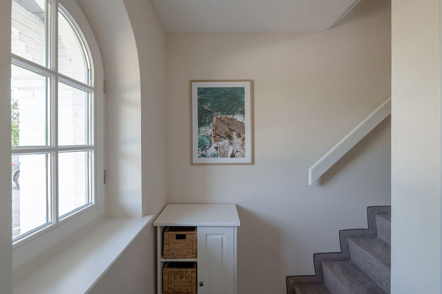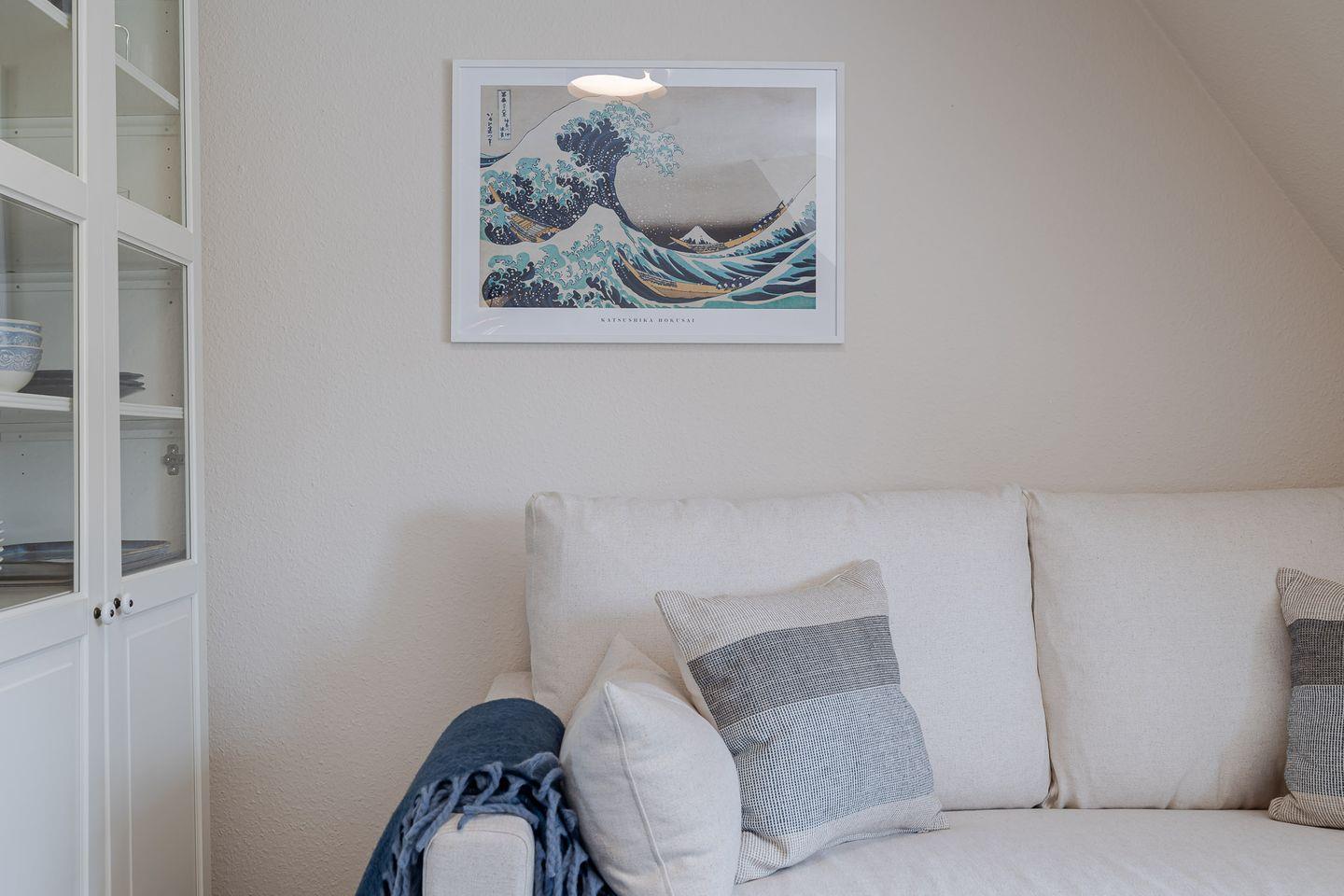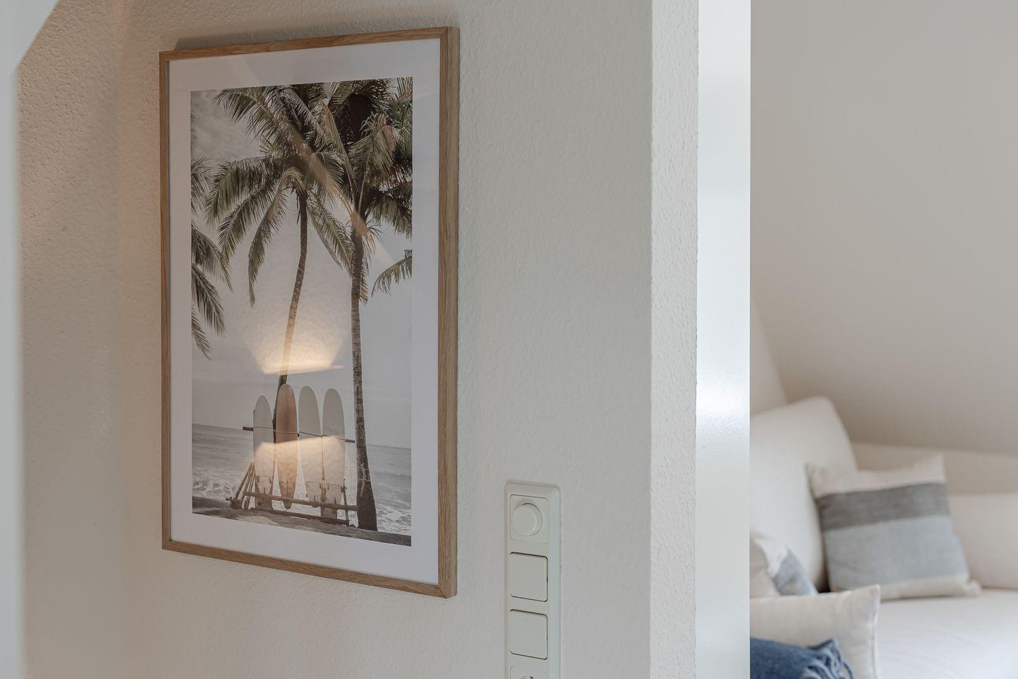 Über eine Treppe gelangen Sie ins behagliche Schlafzimmer im Dachgeschoss. Mit seinen schrägen Wänden, der niedrigen Decke und dem Dachfenster wirkt es fast wie eine kleine Kajüte – ein Platz zum Entspannen, Lesen und Ausschlafen.