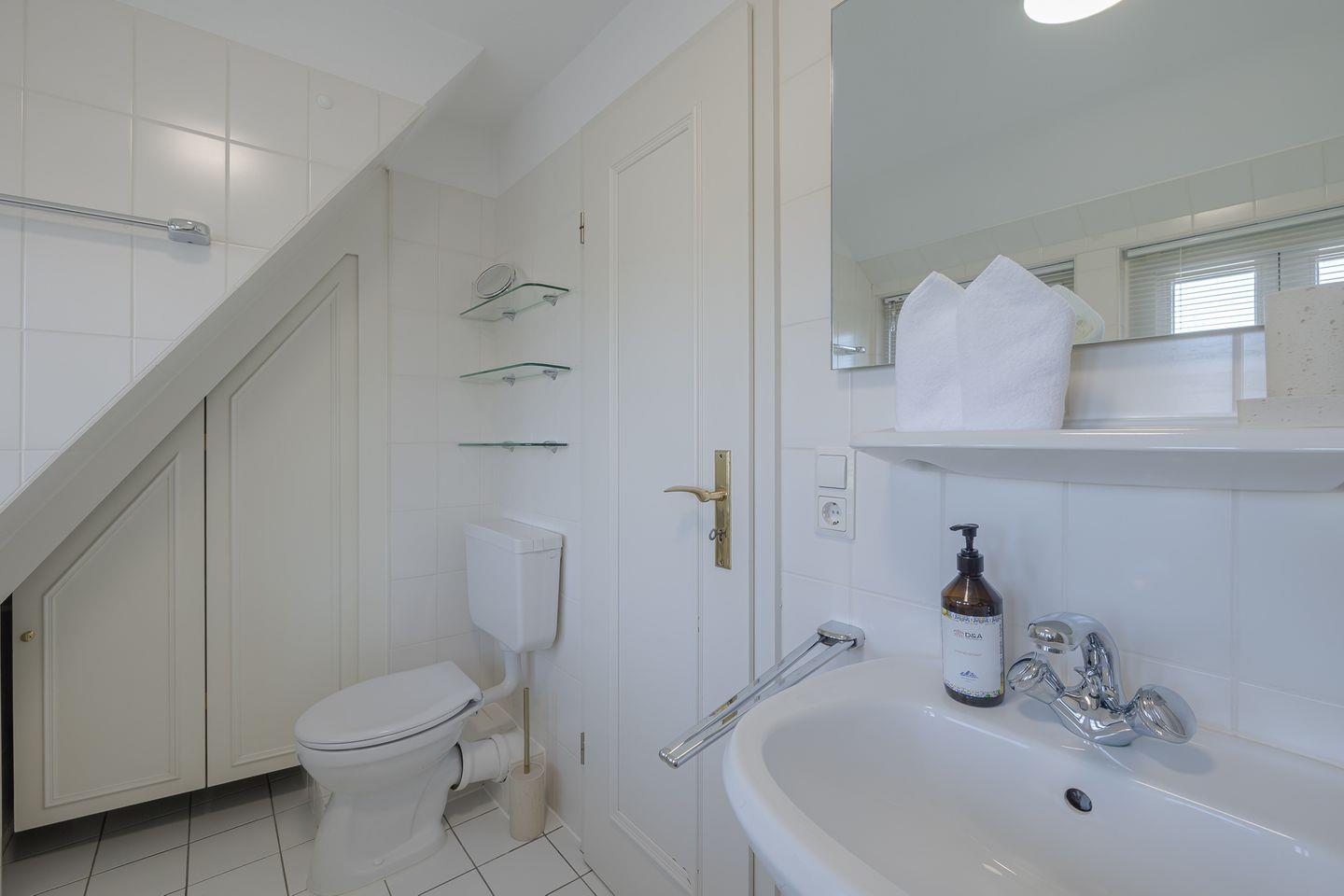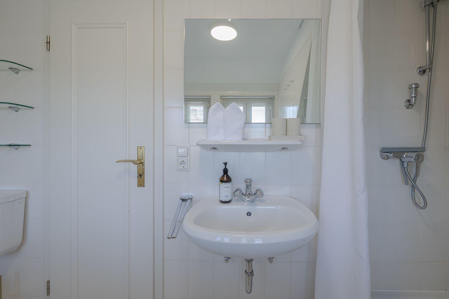 Das kompakte Tageslichtbad ist hell und freundlich gestaltet und bietet eine erfrischende Dusche.