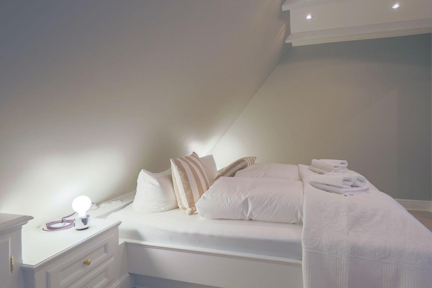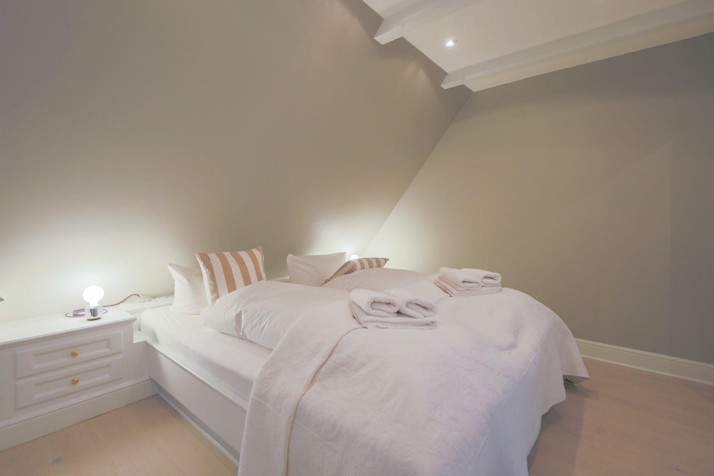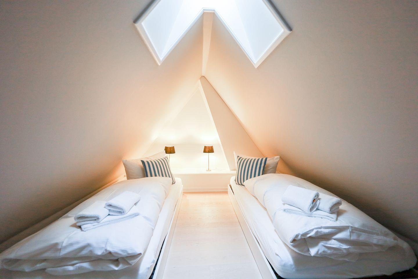 Das Obergeschoss beherbergt ein Schlafzimmer mit bequemem Doppelbett sowie ein kleineres Zimmer mit einem Einbaubett (nur für Kinder geeignet). Im Erd- sowie im Obergeschoss befindet sich je ein helles Duschbad im traditionellen Sylter-Stil. Eine weitere Treppe führt auf den ausgebauten Spitzboden, wo zwei zusammenschiebbare Einzelbetten kuschelige weitere Schlafgelegenheiten bieten.