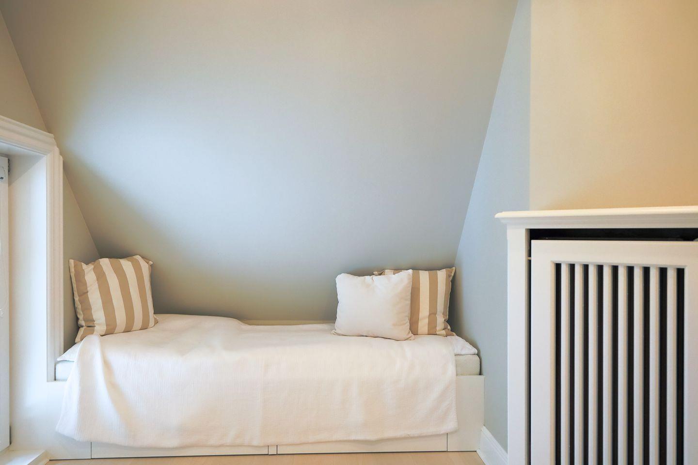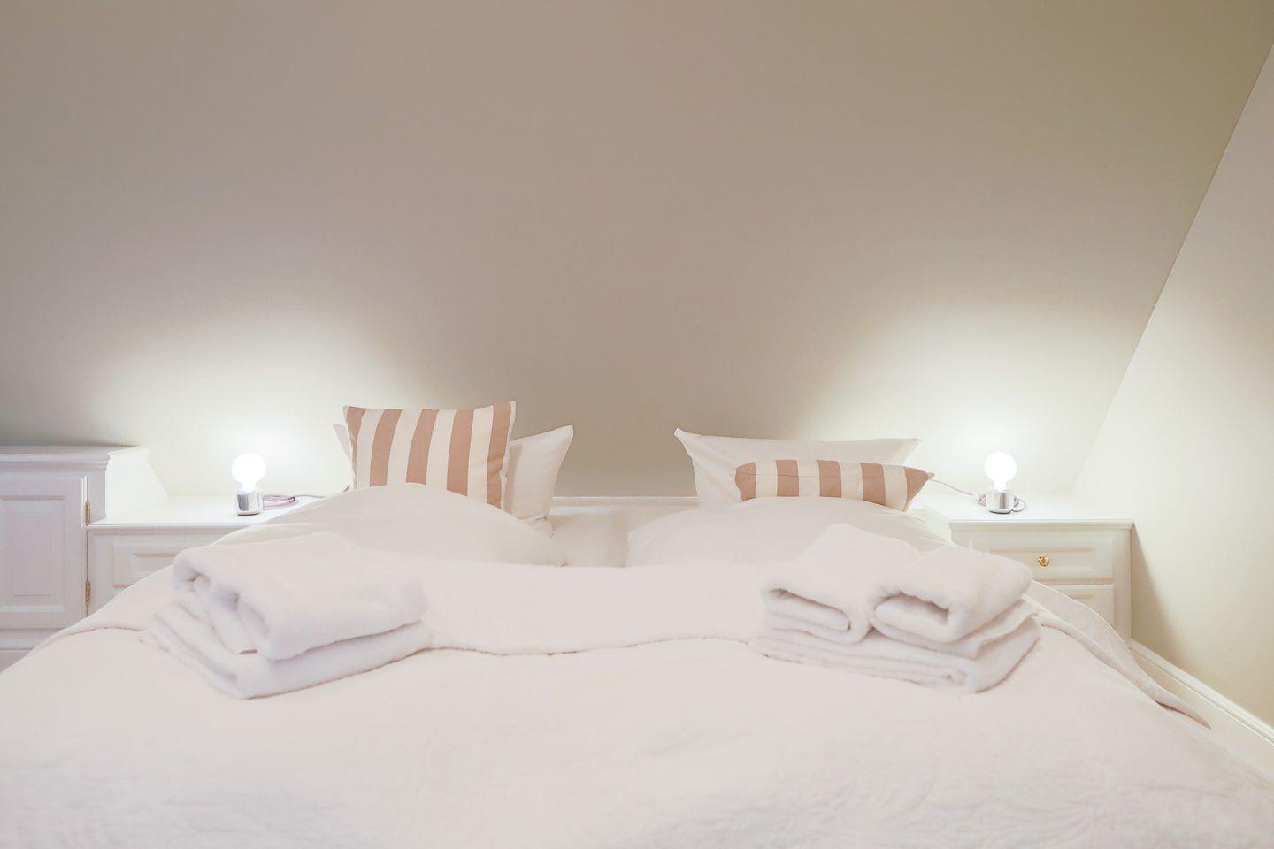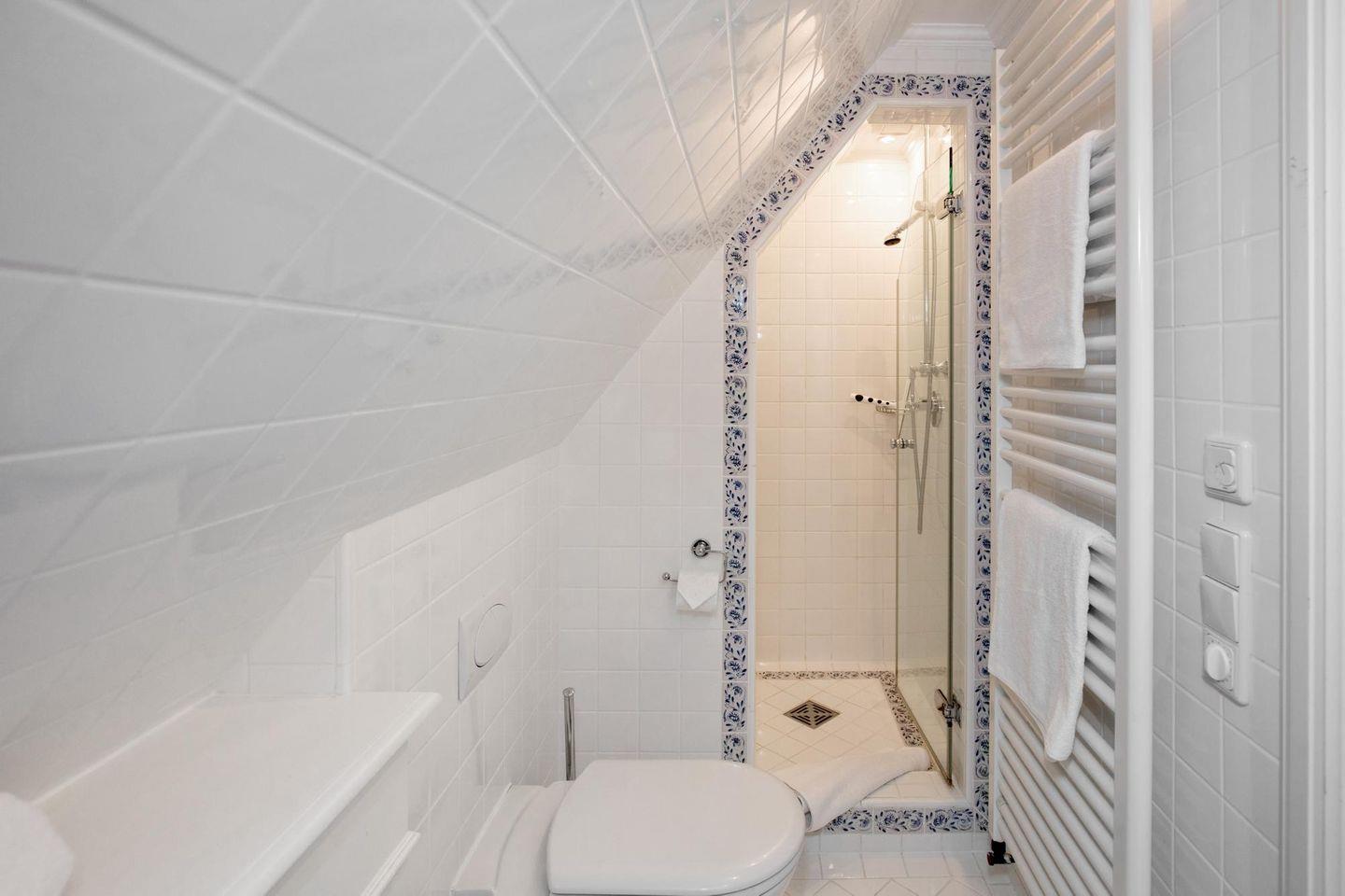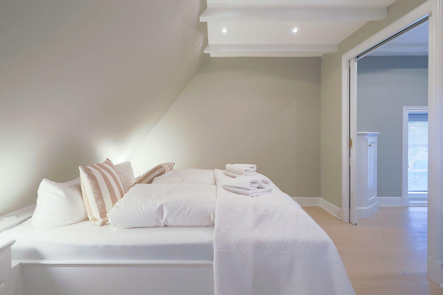 Das Obergeschoss beherbergt ein Schlafzimmer mit bequemem Doppelbett sowie ein kleineres Zimmer mit einem Einbaubett (nur für Kinder geeignet). Im Erd- sowie im Obergeschoss befindet sich je ein helles Duschbad im traditionellen Sylter-Stil. Eine weitere Treppe führt auf den ausgebauten Spitzboden, wo zwei zusammenschiebbare Einzelbetten kuschelige weitere Schlafgelegenheiten bieten.