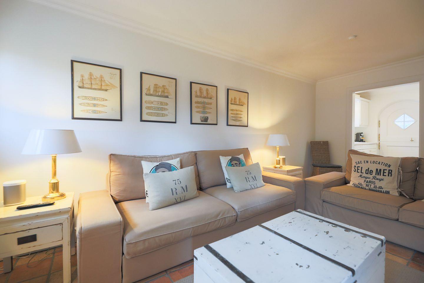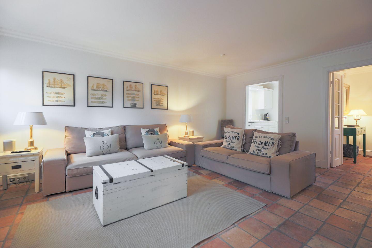 Im Erdgeschoss befindet sich der Wohnbereich mit hübschen Terrakottafliesen, gemütlichen Sofas und einem großen Esstisch. Helle Naturtöne und liebevoll ausgesuchte Accessoires sorgen hier für eine heimelige Wohlfühlatmosphäre. Bei schönem Wetter lädt die hübsche Gartenterrasse zum gemütlichen Beisammensein ein.