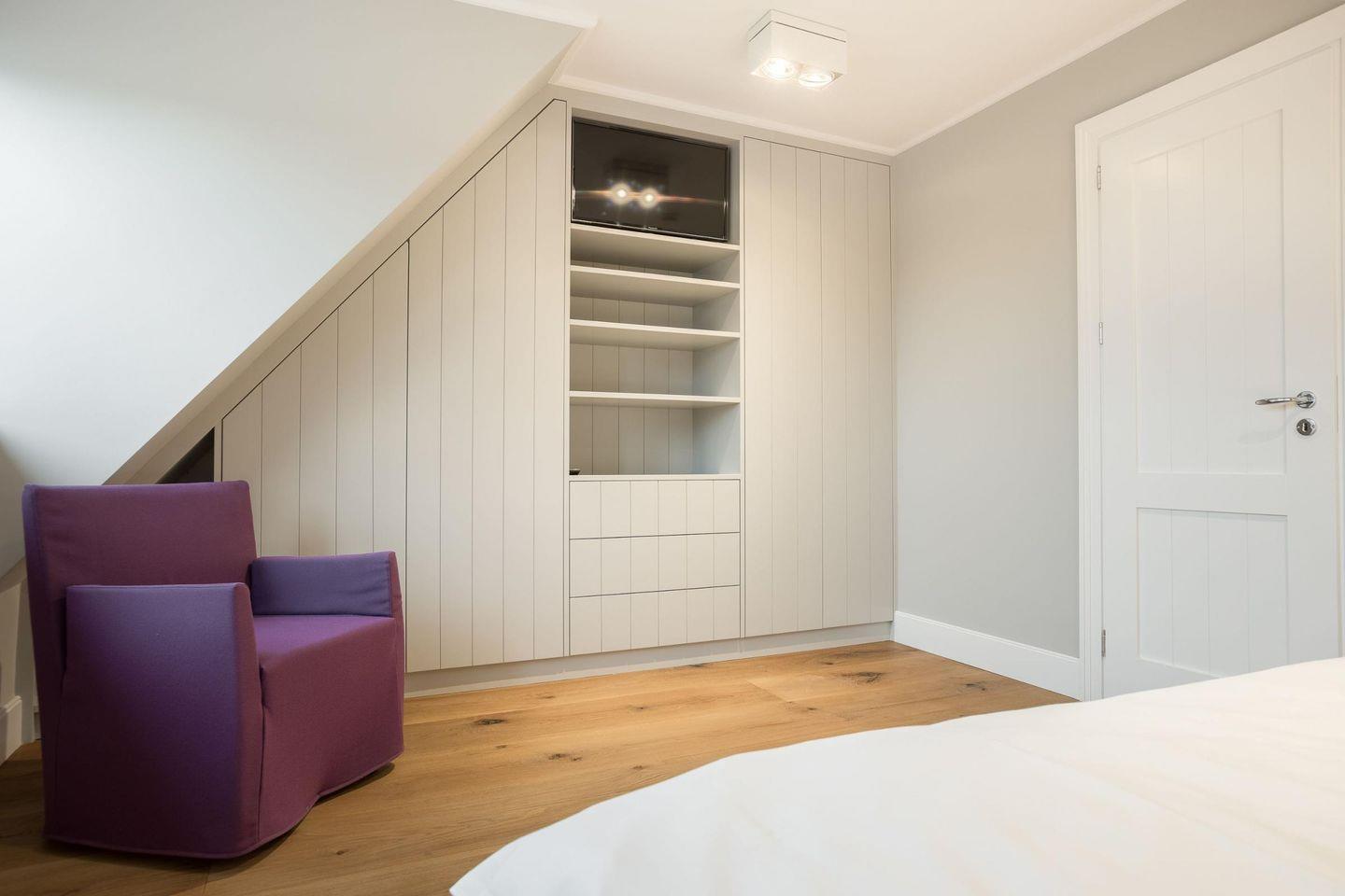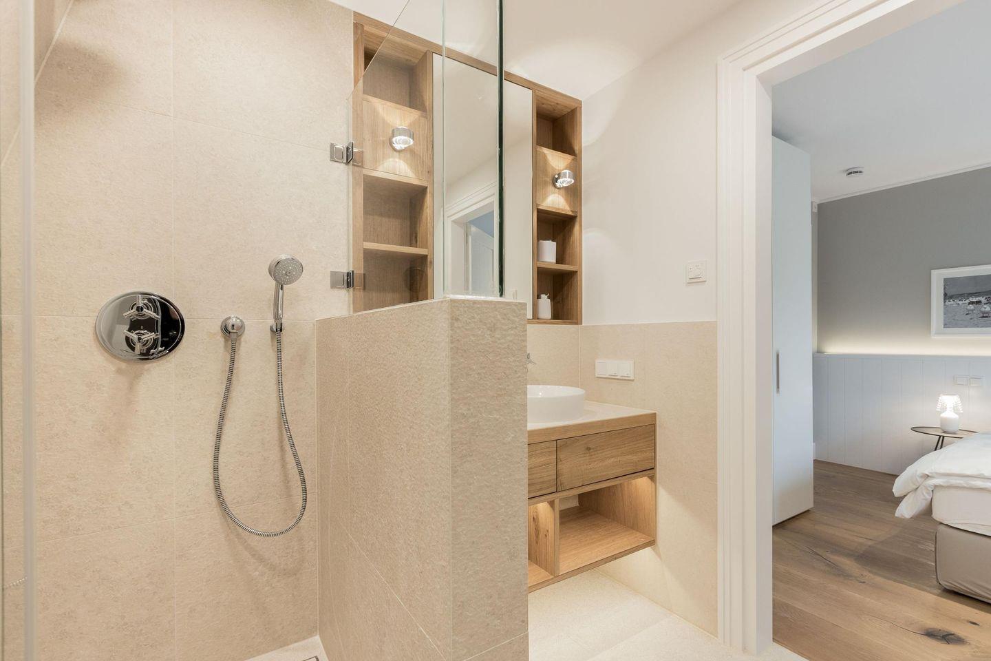 Die drei stilvoll eingerichteten Schlafzimmer sind mit Doppelbetten (je 180x200 cm) und TVs ausgestattet. Ein Schlafzimmer bietet direkten Zugang zum zweiten Badezimmer, welches mit einer bodengleichen Dusche, Fußbodenheizung und Tageslicht punktet. Die ruhige Atmosphäre der Zimmer sorgt für erholsamen Schlaf und Entspannung.