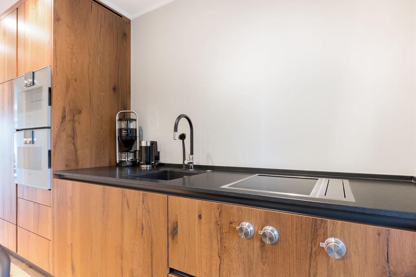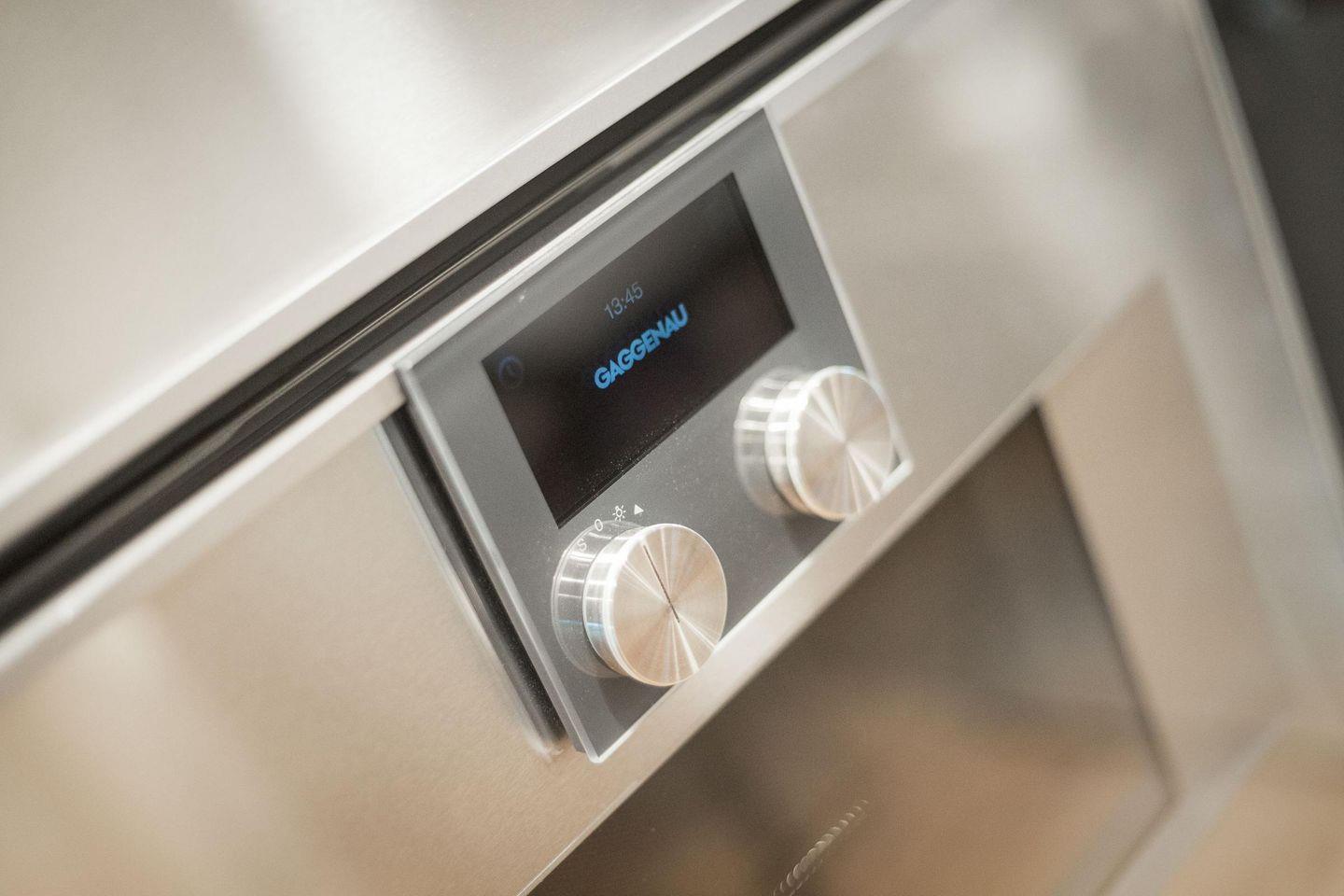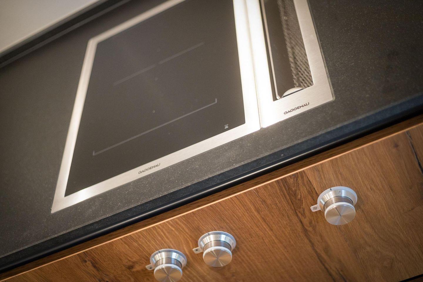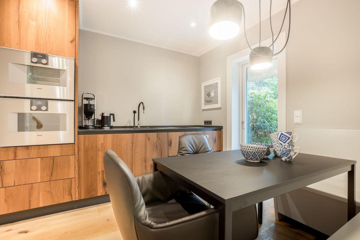 Die halb offene Küche besticht durch ihre maßgeschneiderte Sitzecke und hochwertige Gaggenau-Geräte. Diese Ausstattung lässt keine Wünsche offen und macht das Kochen zu einem echten Genuss. Die offene Gestaltung schafft einen fließenden Übergang zum Essbereich und lädt zum gemeinsamen Kochen und Genießen ein.