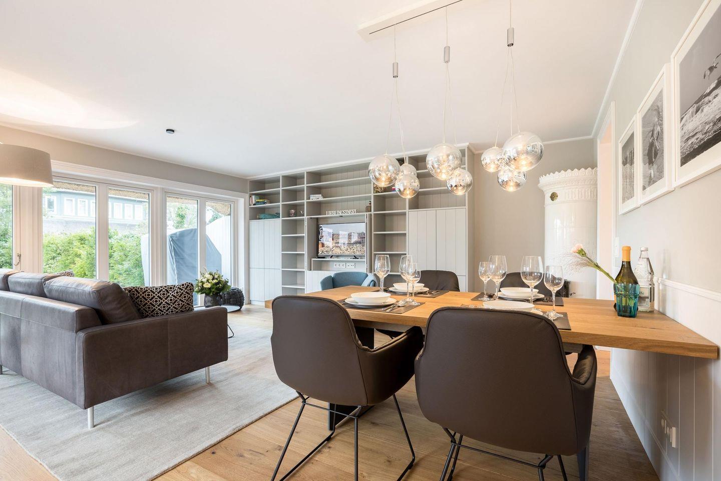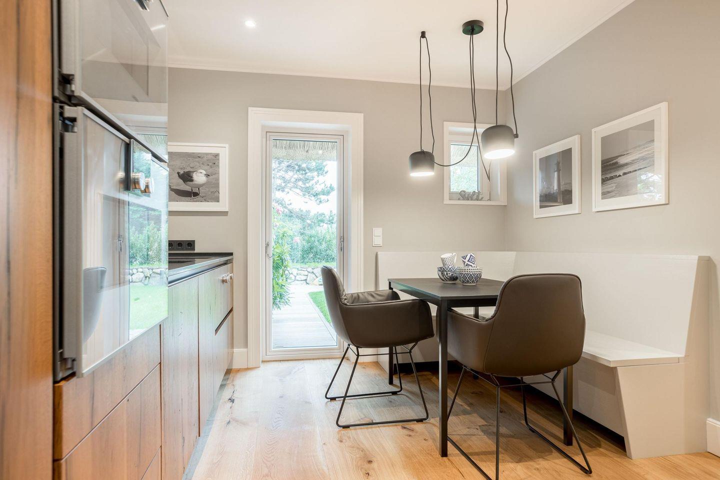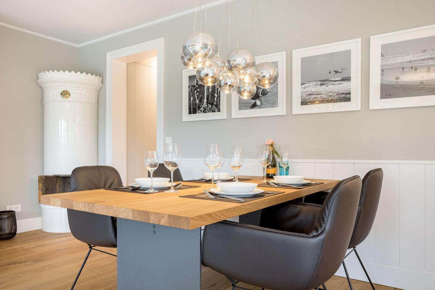 Das geräumige Wohnzimmer lädt mit einem modernen Ecksofa und hochwertigen Tischlereinbauten zum Entspannen ein. Der Mylin Kachelofen spendet wohlige Wärme. Vom Wohnzimmer aus haben Sie direkten Zugang zur sonnigen Südterrasse, die mit einem eigenen Strandkorb und Sitzgelegenheiten ausgestattet ist – der perfekte Ort für erholsame Stunden an der frischen Luft. Die Essecke, harmonisch in den Wohnbereich integriert, bietet Platz für gesellige Abende.