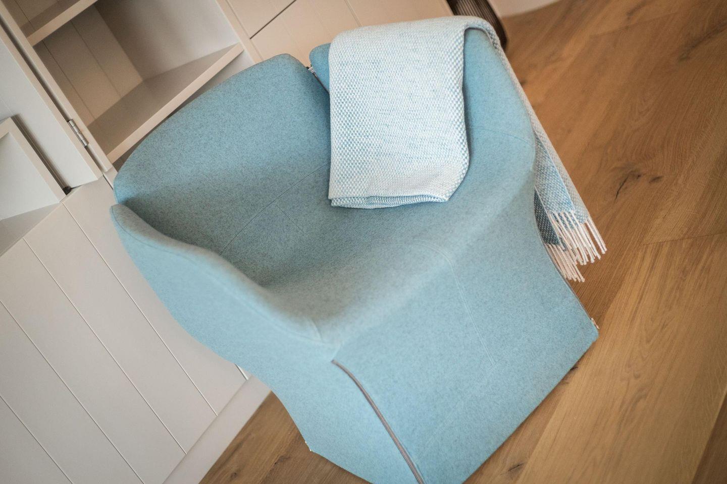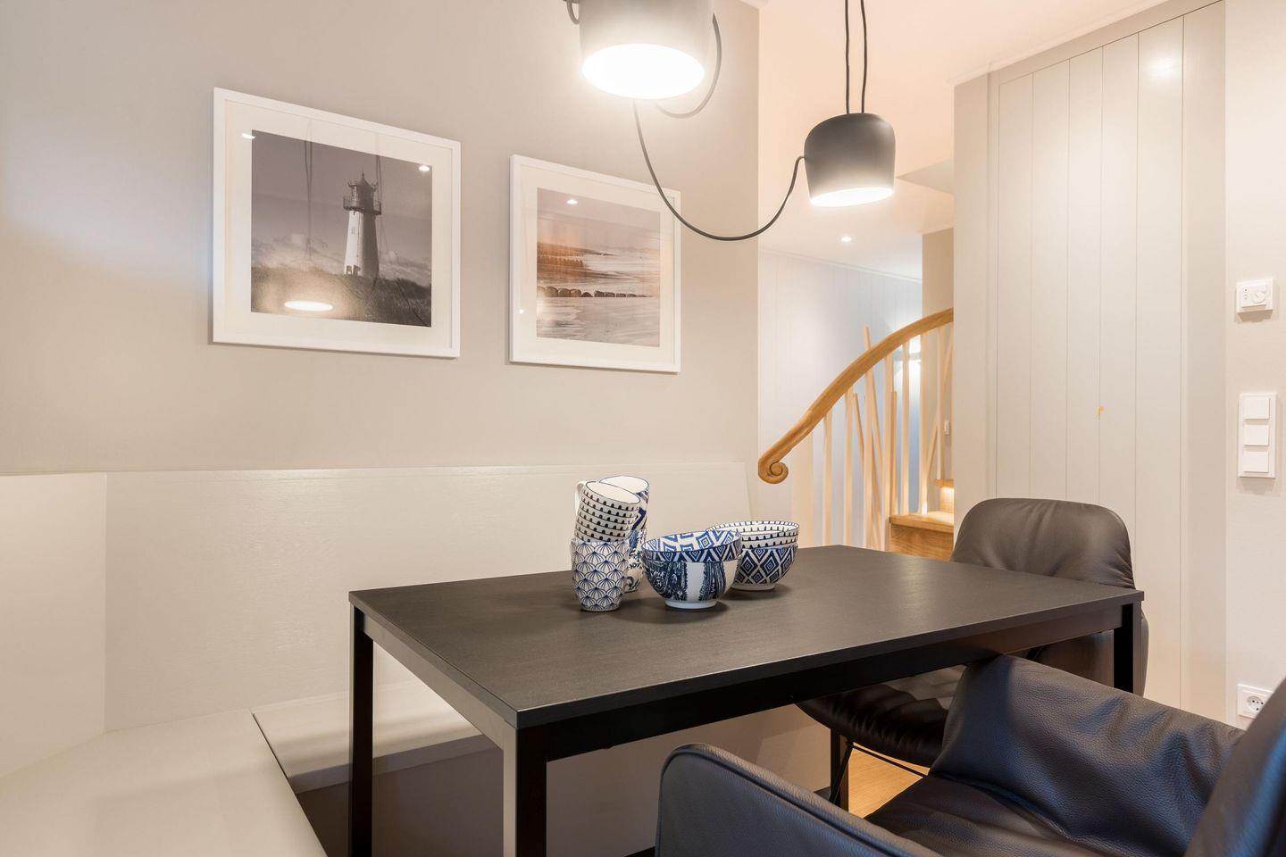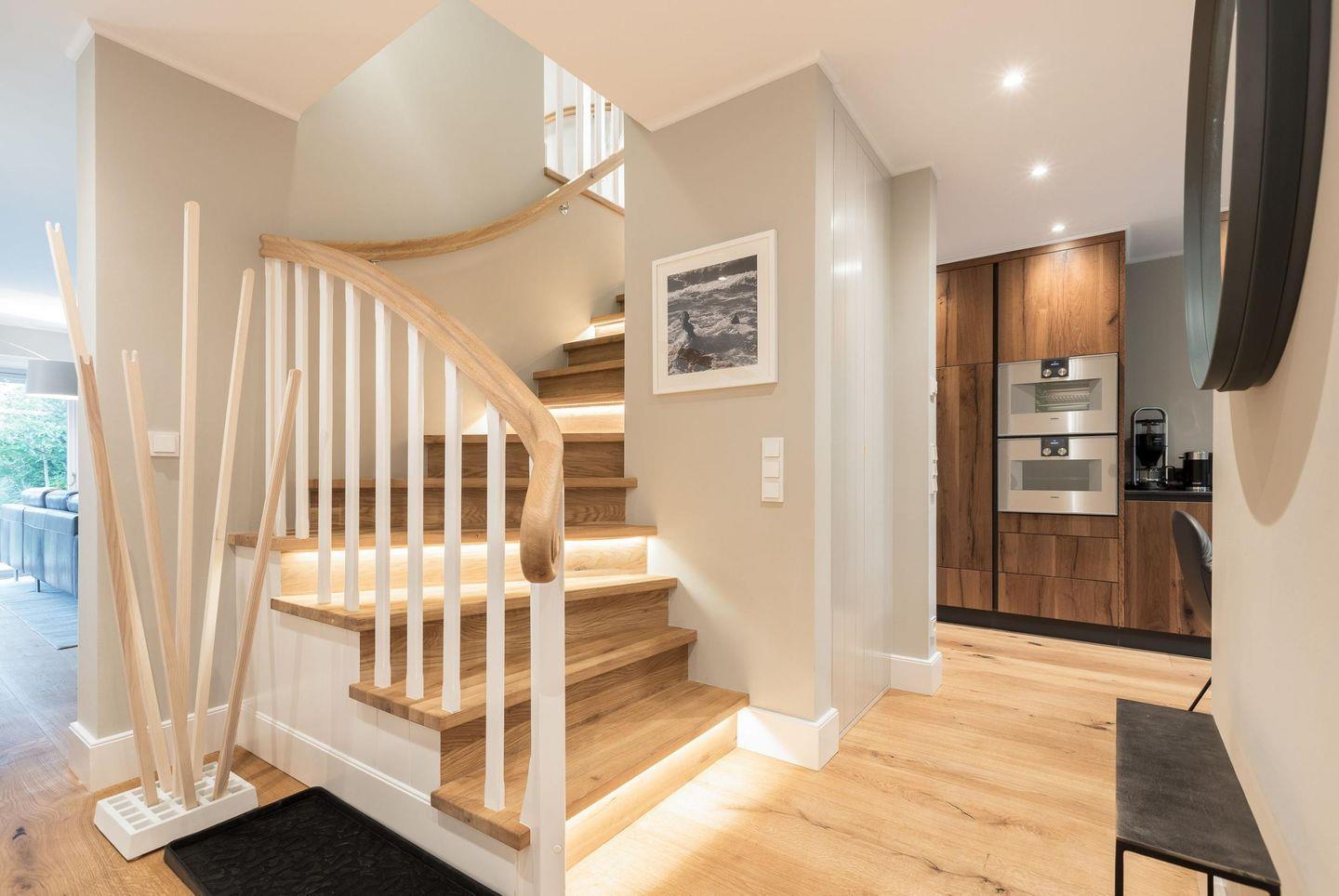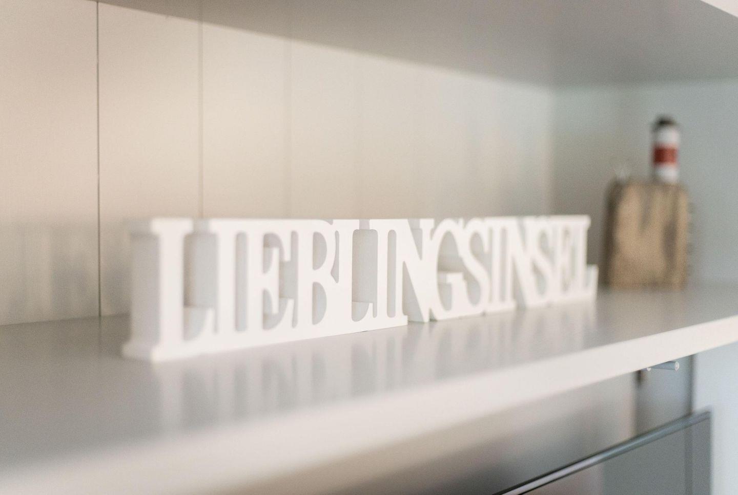 Das geräumige Wohnzimmer lädt mit einem modernen Ecksofa und hochwertigen Tischlereinbauten zum Entspannen ein. Der Mylin Kachelofen spendet wohlige Wärme. Vom Wohnzimmer aus haben Sie direkten Zugang zur sonnigen Südterrasse, die mit einem eigenen Strandkorb und Sitzgelegenheiten ausgestattet ist – der perfekte Ort für erholsame Stunden an der frischen Luft. Die Essecke, harmonisch in den Wohnbereich integriert, bietet Platz für gesellige Abende.