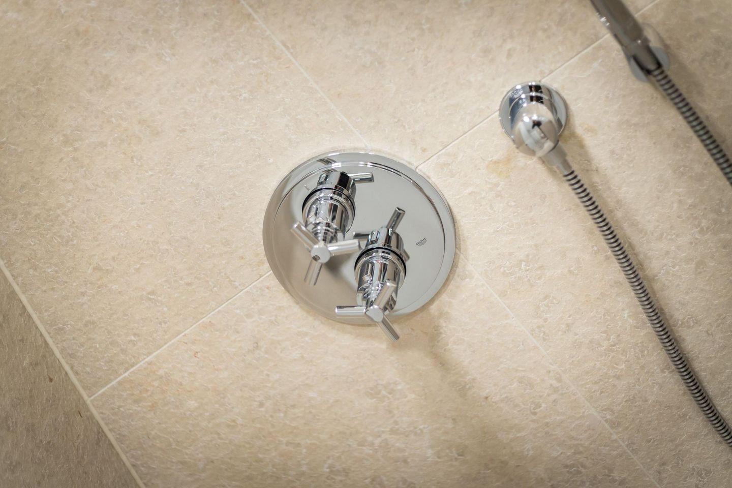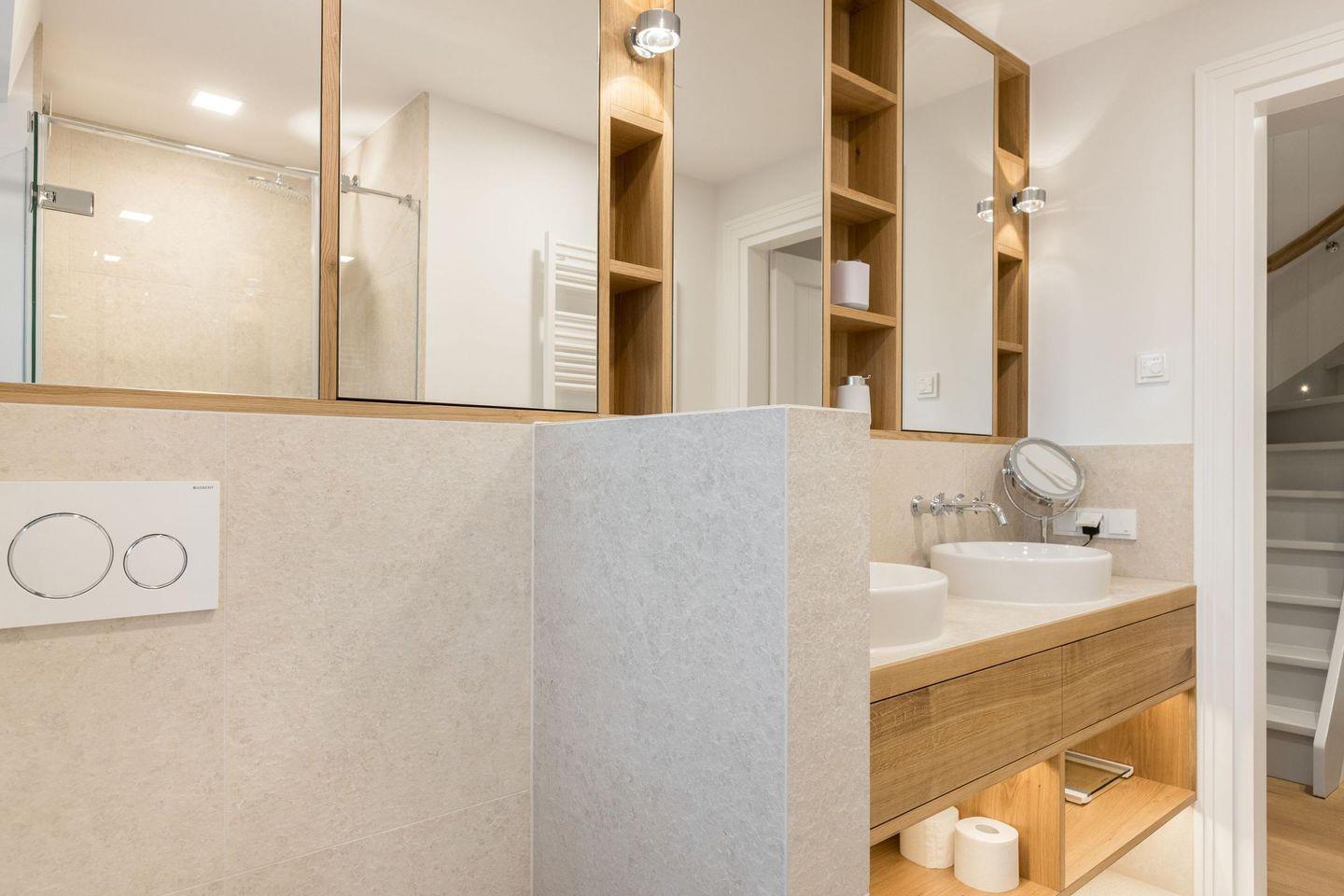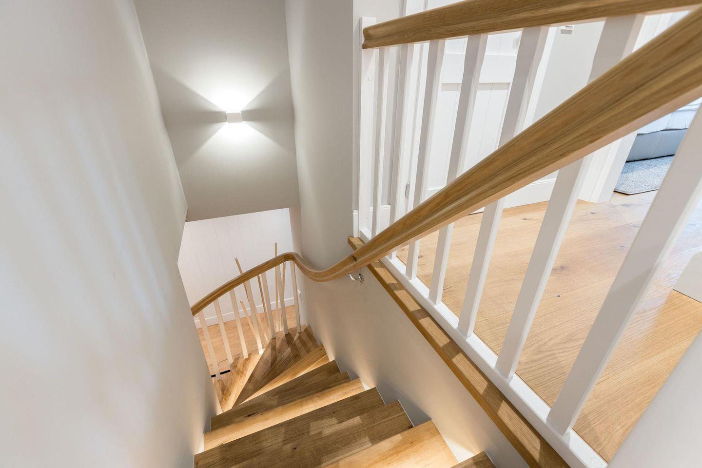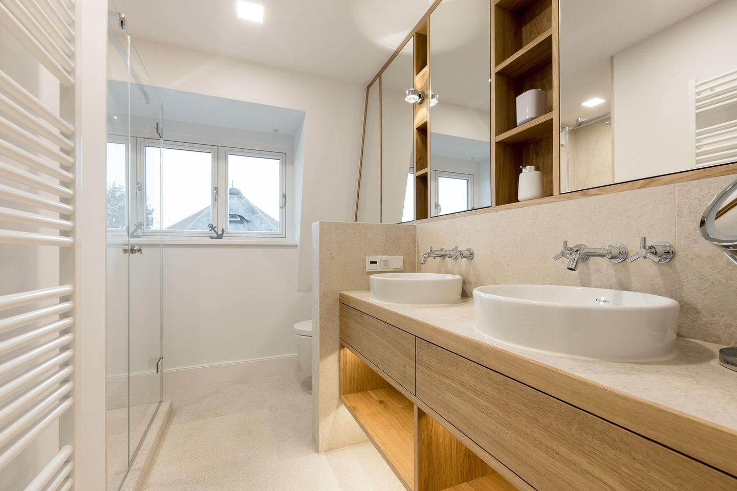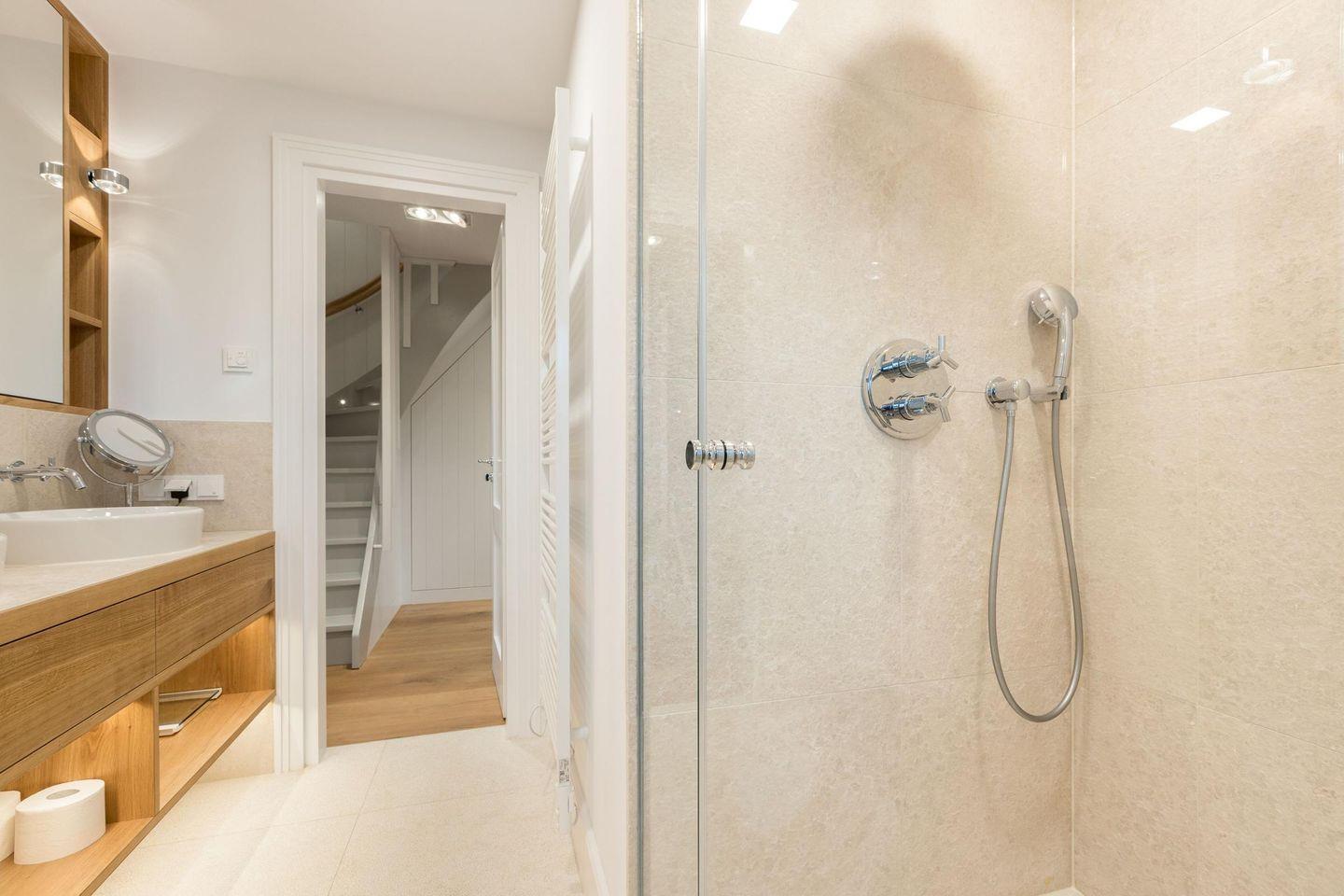 Das erste Badezimmer ist mit einer bodengleichen Dusche, Fußbodenheizung, Fön und Tageslicht ausgestattet und schafft eine entspannende Wellness-Oase. Ein separates Gäste-WC im Erdgeschoss sorgt für zusätzlichen Komfort.