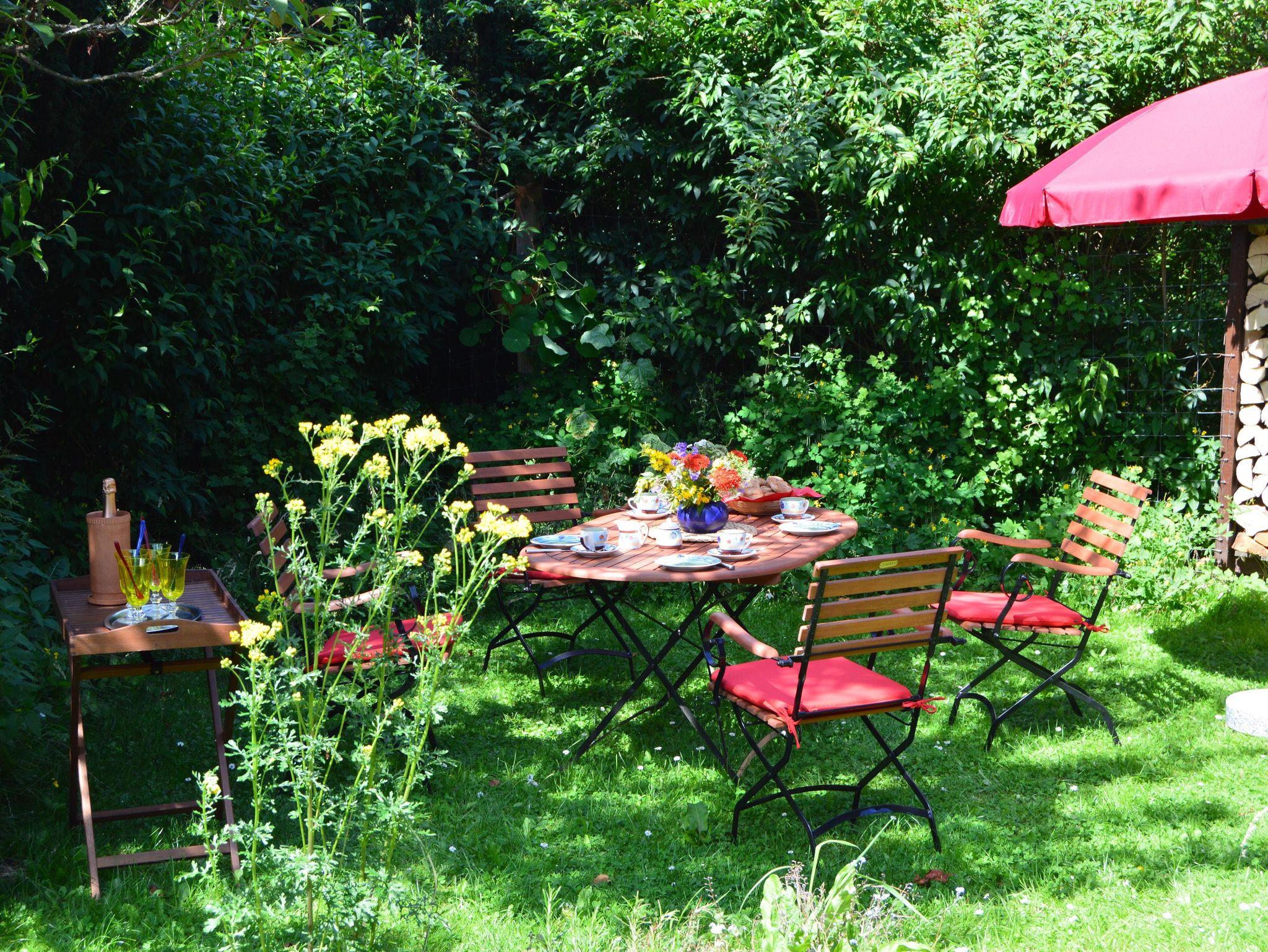 • Garten mit beleuchteter Terrasse: Grillkamin, Gartentisch mit Stühlen, zus. Sitzbank, Sonnenschirm und Liegen, Wasserstelle, Beet mit Küchenkräutern