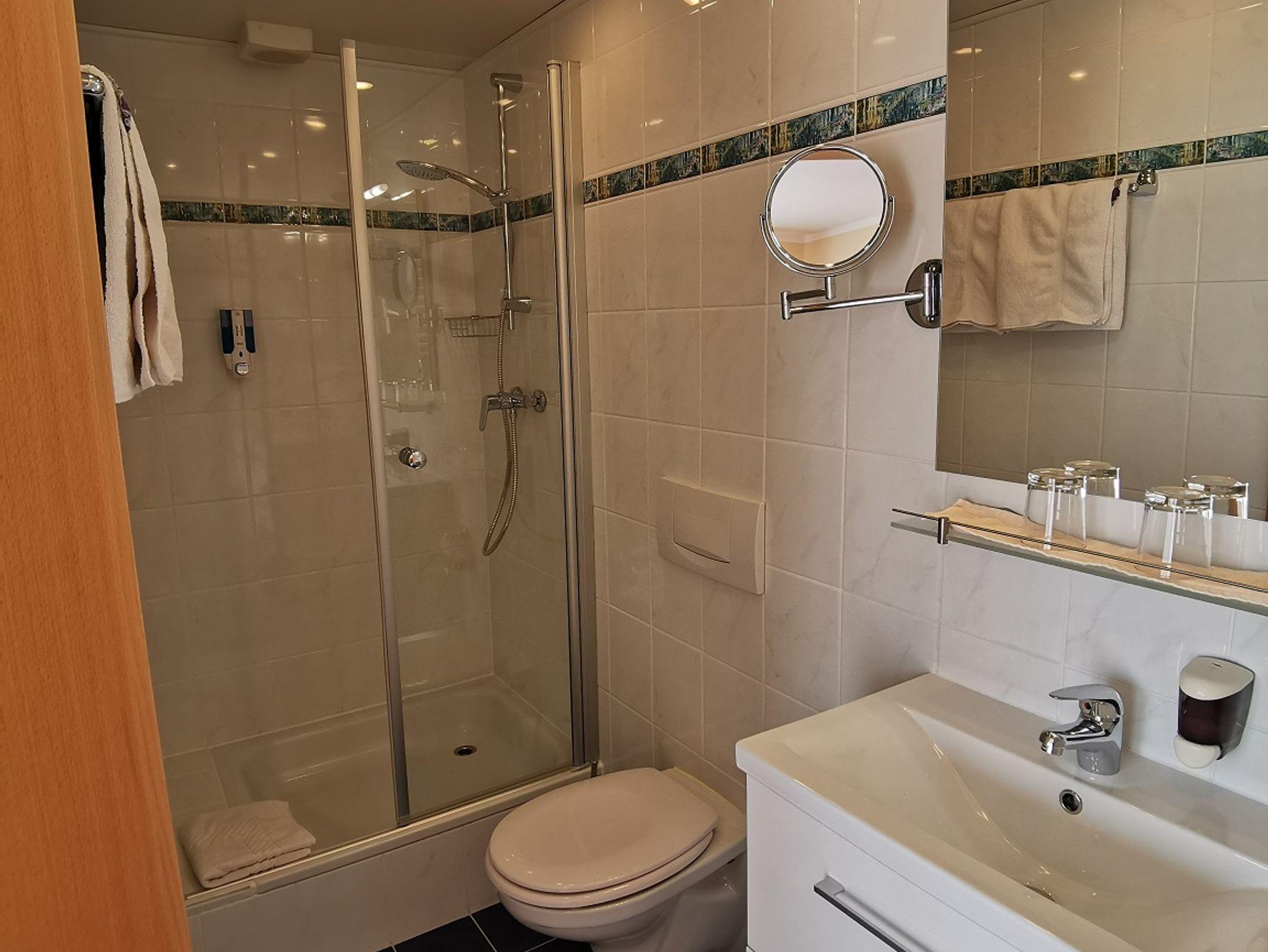 Das Doppelzimmer hat eine große Terrasse nach Süden mit Zugang zum Garten. Doppelbett ohne Fußteil, getrennte Betten möglich, Schreibtisch und Sitzgelegenheit für 2 Personen, TV und WLAN. Das Badezimmer ist mit Dusche, WC, Fön und Handtüchern ausgestattet.