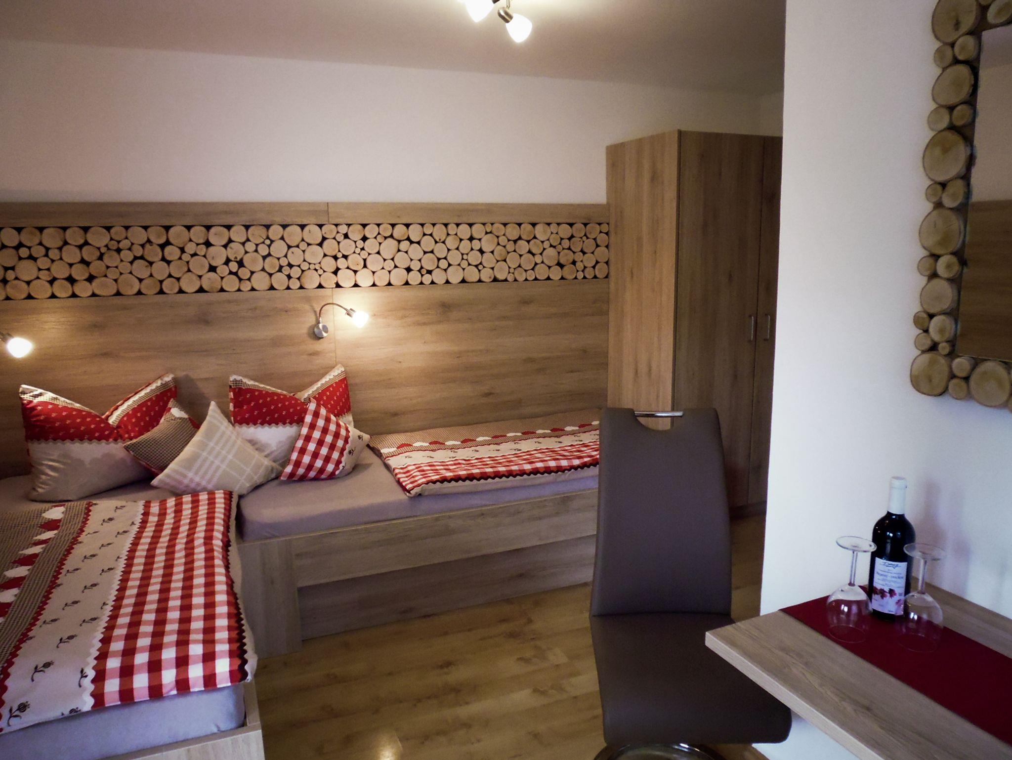 Zweibettzimmer ca. 13 m², bietet Platz für 1- 2 Personen. Das Zimmer hat zwei auseinander stehende Betten, Kühlschrank, einen kleinen Schreibtisch mit Stühlen, sowie ein Flachbild-TV und WLAN. Bettwäsche, Fön sowie Handtücher vorhanden.