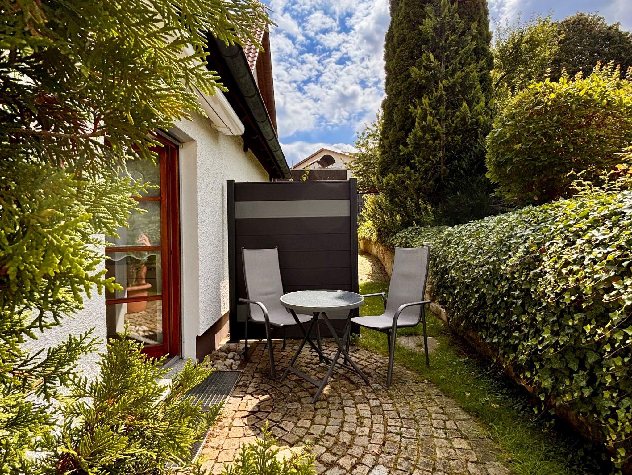 Komfortabel ausgestattete Fewo für 1 - 2 Personen mit ca. 65 qm Wohnfläche in ruhiger Lage in einem herrlichen Garten gelegen. Die Fewo verfügt über - eine Küche mit moderner Ausstattung, ein großes Wohnzimmer mit Kachelofen, ein schönes Schlafzimmer, ein hochwertig ausgestattetes Bad/WC und eine Südterrasse mit Markise. Parkplatz für Ihr Auto direkt vor dem Haus. Sichere Fahrradabstellmöglichkeit vorhanden. 4 Sterne Wohnung