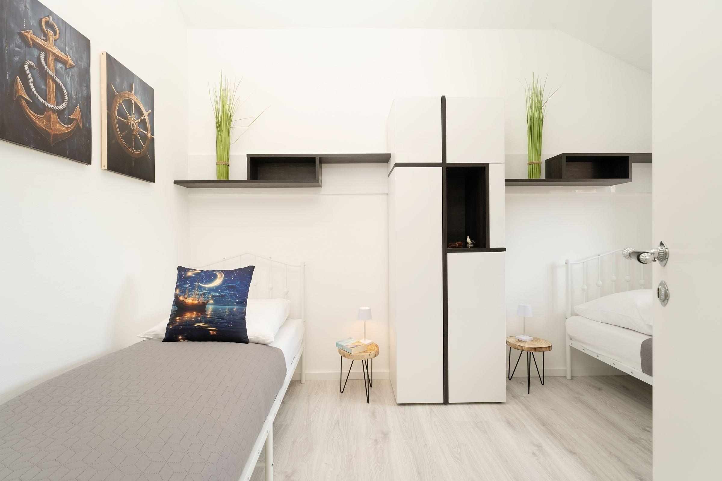 Schlafzimmer 2 (1.OG): 2 Einzelbetten (je 80x200 cm), Kleiderschrank, Verdunkelung: Vorhänge, Platz für Babybett vorhanden