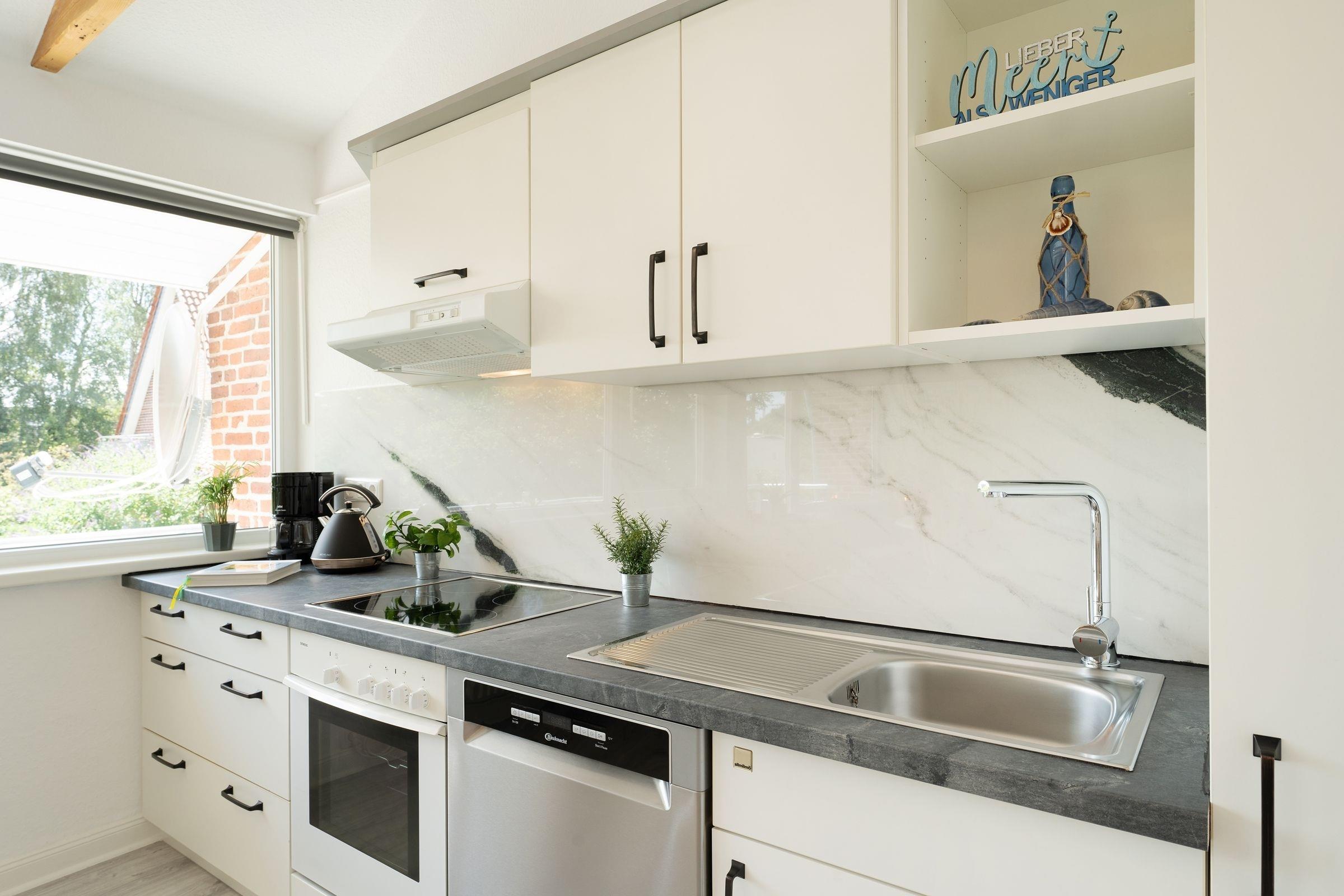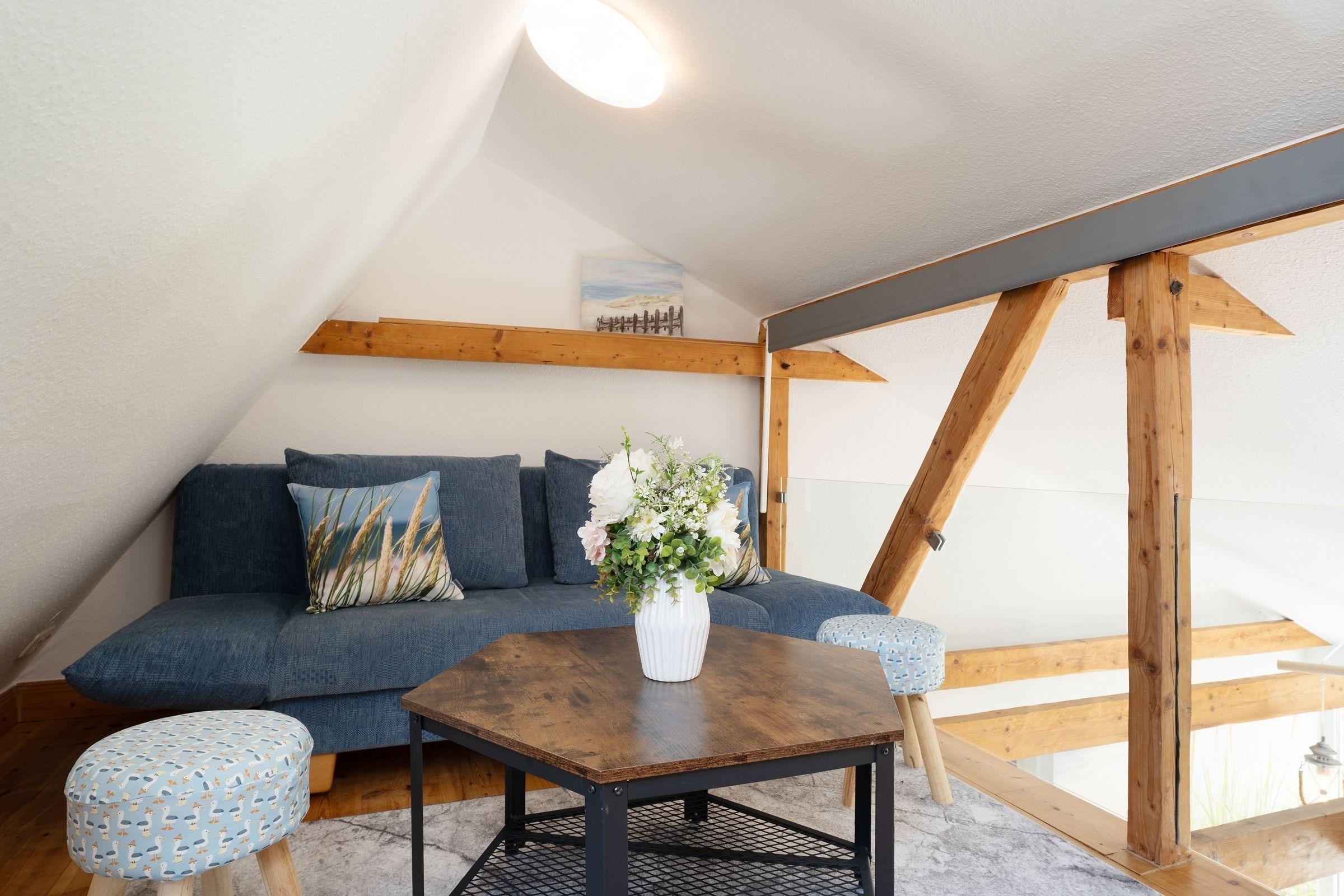 Offen und modern präsentiert sich die Ferienwohnung Ost. Die Galerie im hellen Wohnbereich sorgt für eine angenehme Atmosphäre. Auf beiden Ebenen haben Sie die Möglichkeit, vor dem TV-Gerät zu entspannen. Oben befindet sich dafür eine kuschelige Sofaecke, unten eine schicke Essecke. Die offene Küche mit Spülmaschine ist modern ausgestattet und macht eine Selbstverpflegung angenehm. Von der nahen Ostsee werden Sie sicher in einem der beiden Schlafzimmer träumen, in einem stehen ein Doppelbett (2x 90x200 cm) mit TV-Gerät, in dem anderen 2 Einzelbetten (je 80x200 cm). Auch das Sofa oben bietet einen Schlafplatz (140x200 cm). Entspannt in den neuen Tag bringt Sie das tageslichthelle Duschbad. Im Gemeinschaftsgarten warten eine Grillecke sowie für die kleinen Gäste ein Spielplatz mit Sandkasten und Schaukel. Ein Kinderhochstuhl gehört zum Objekt dazu.