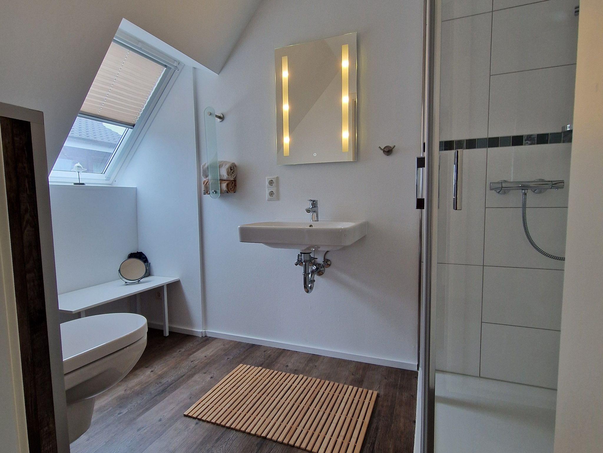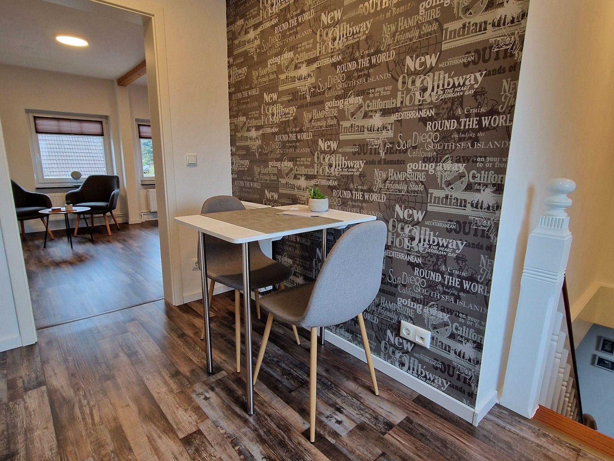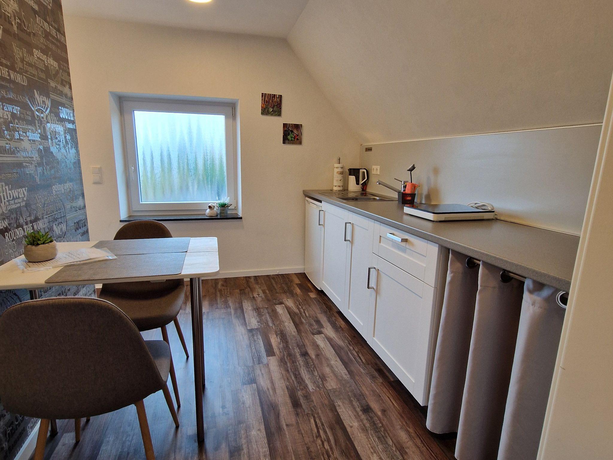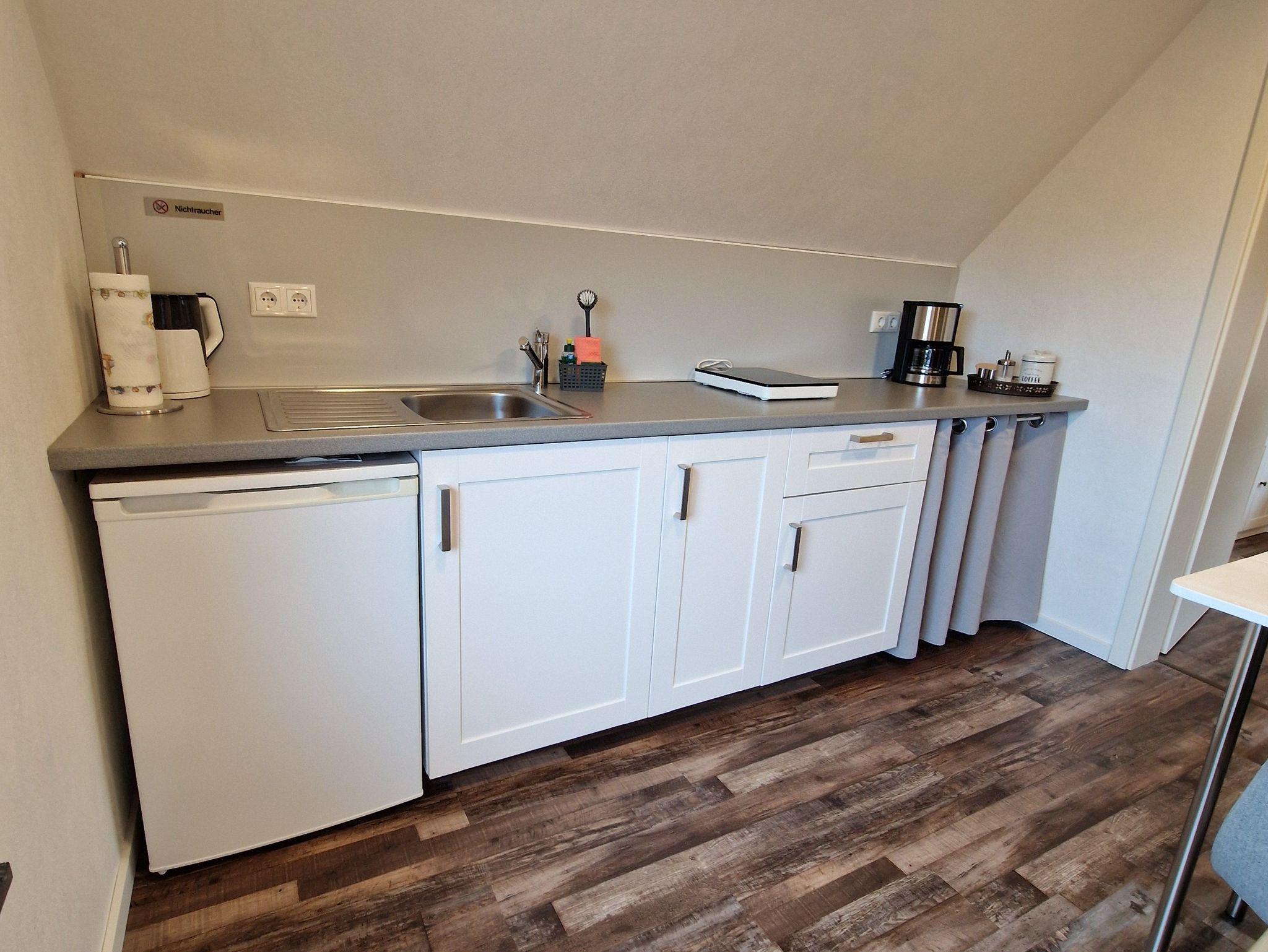 Durch den Hauseingang gelangen Sie in den großen Flur. Von hier aus führt die Treppe ins Obergeschoss in die kleine Küche, ausgestattet mit Kühlschrank, Kaffeemaschine, Wasserkocher und Induktionsplatte. Voin der Küche gelangt man in das Hauptzimmer, eine Kombination aus Wohn- und Schlafraum. Ein Doppelbett, Sitzgelegenheit und Flachbild-TV laden zum verweilen ein. Vom Schlafzimmer geht es direkt ins Badezimmer mit Dusche. Die Wochnung ist ausgelegt für 2 Personen. Es ist aber genügend Platz für ein Baby- oder Kleinkindreisebett vorhanden. Auch kleine Hunde bis 8 kg sind willkommen.