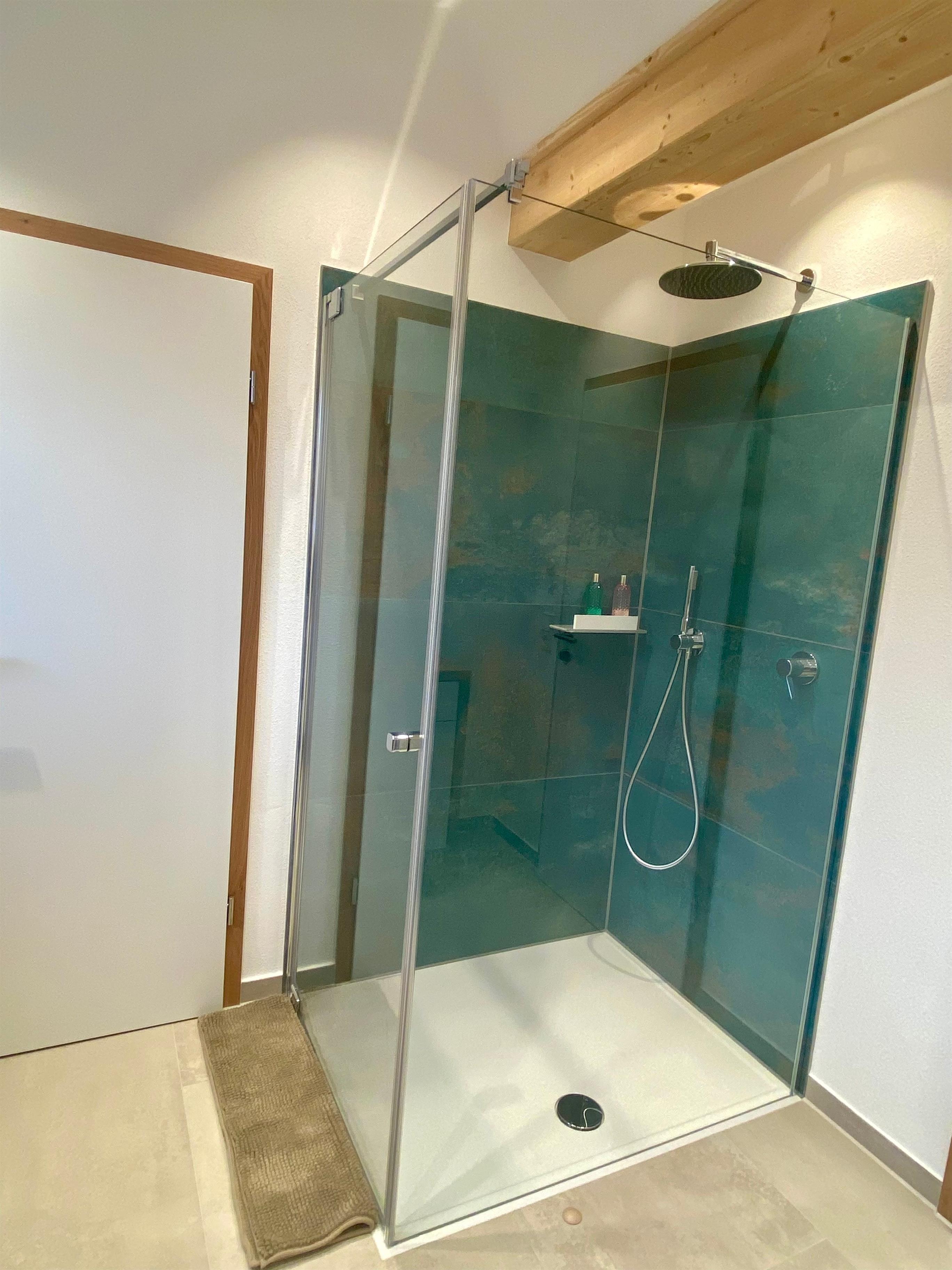 Eine große begehbare Dusche mit Regenbrause erwartet Sie im Badezimmer.