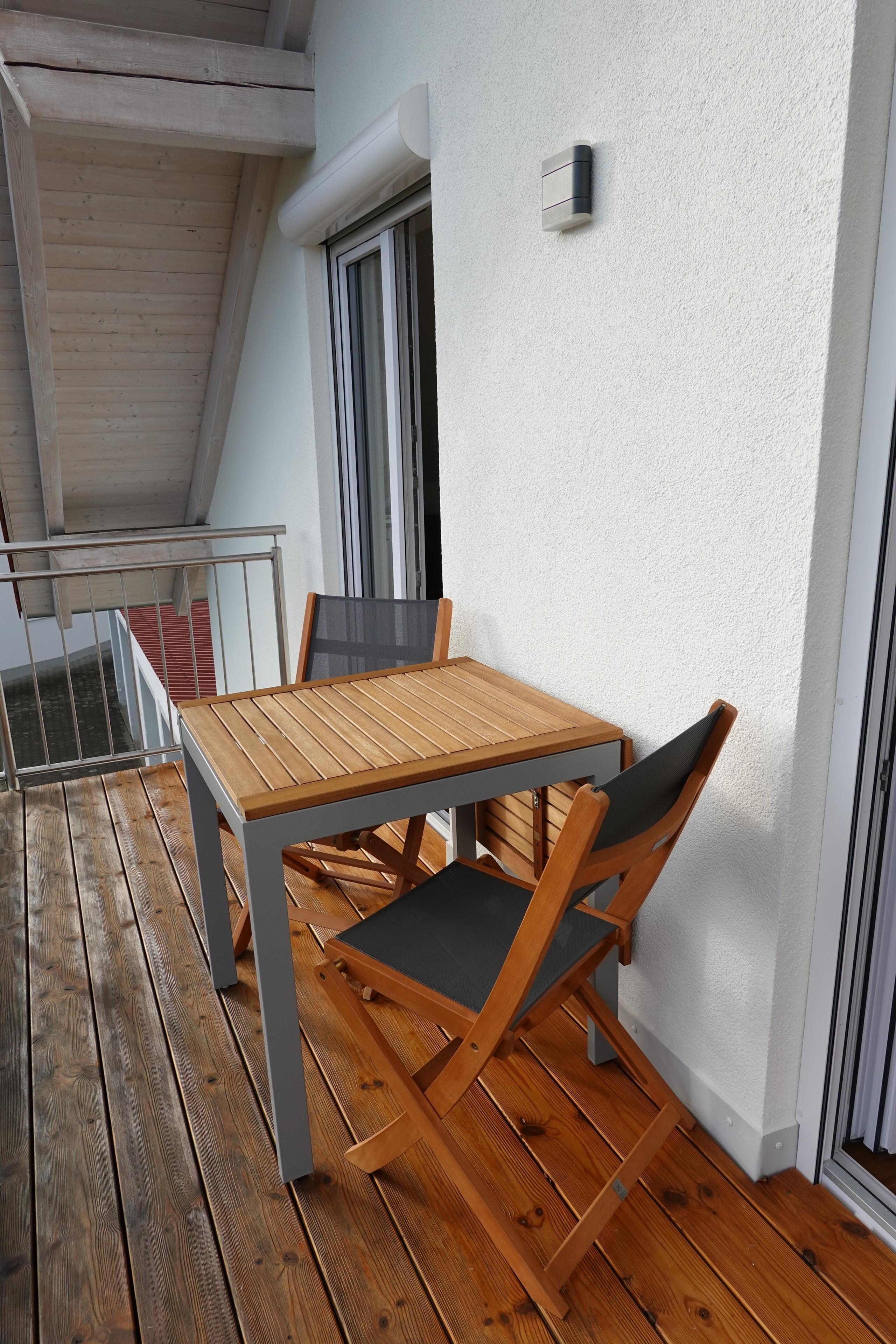 Der Balkon, kann über Wohnzimmer und Schlafzimmer begangen werden. Dort steht ein Gartentisch, der ausgezogen werden kann und somit bis zu vier Personen Platz bietet.