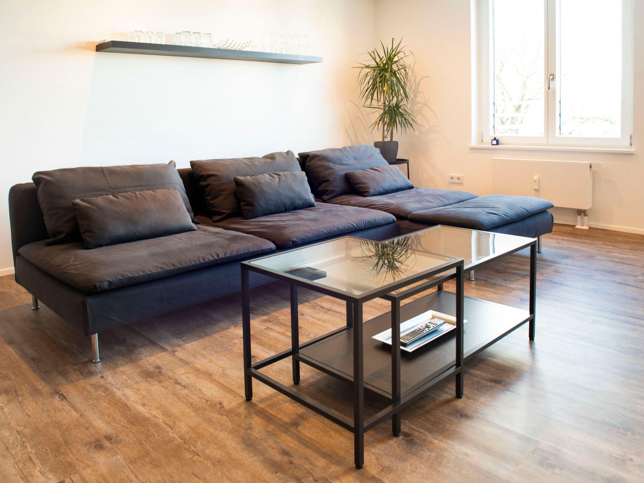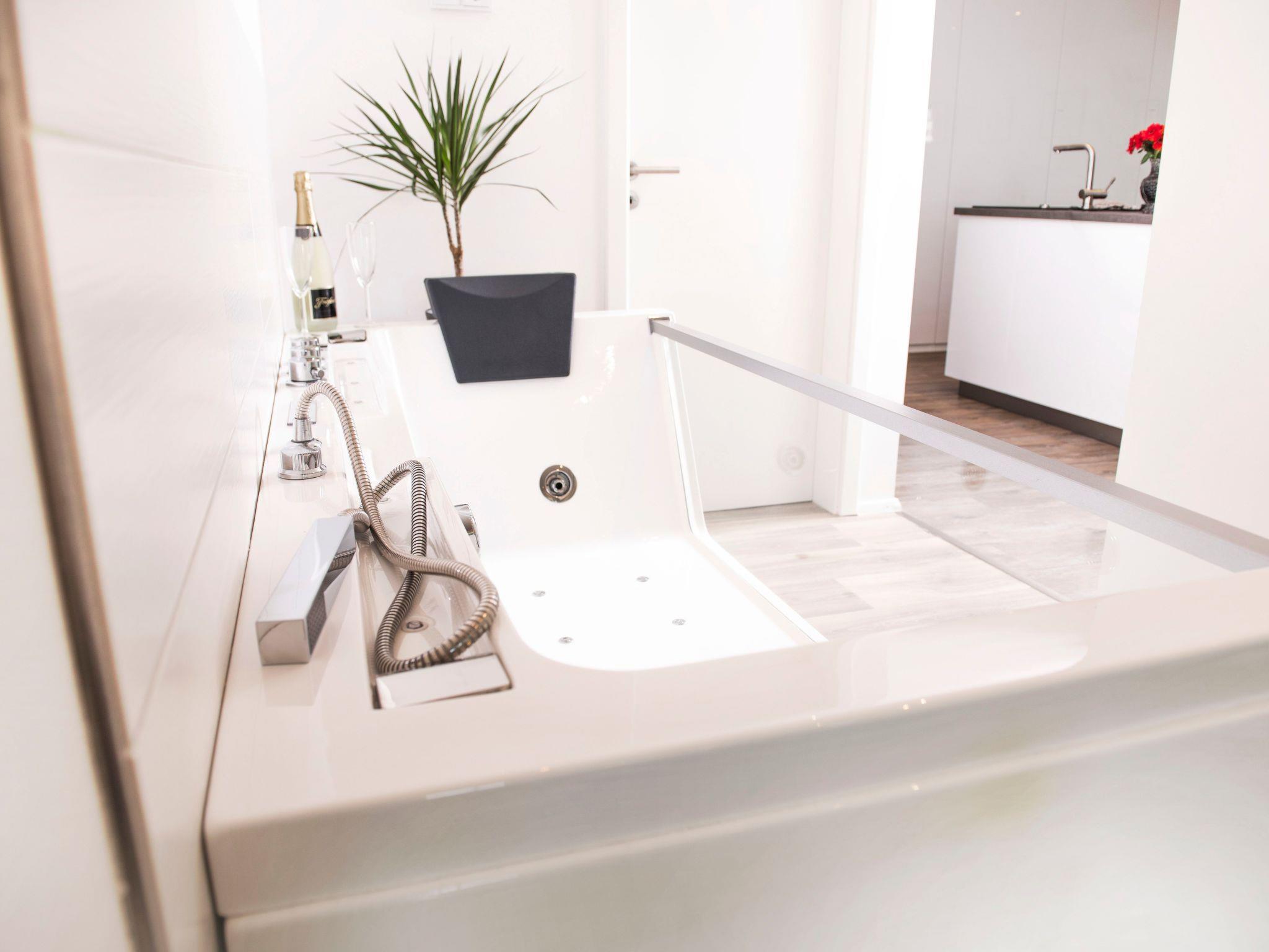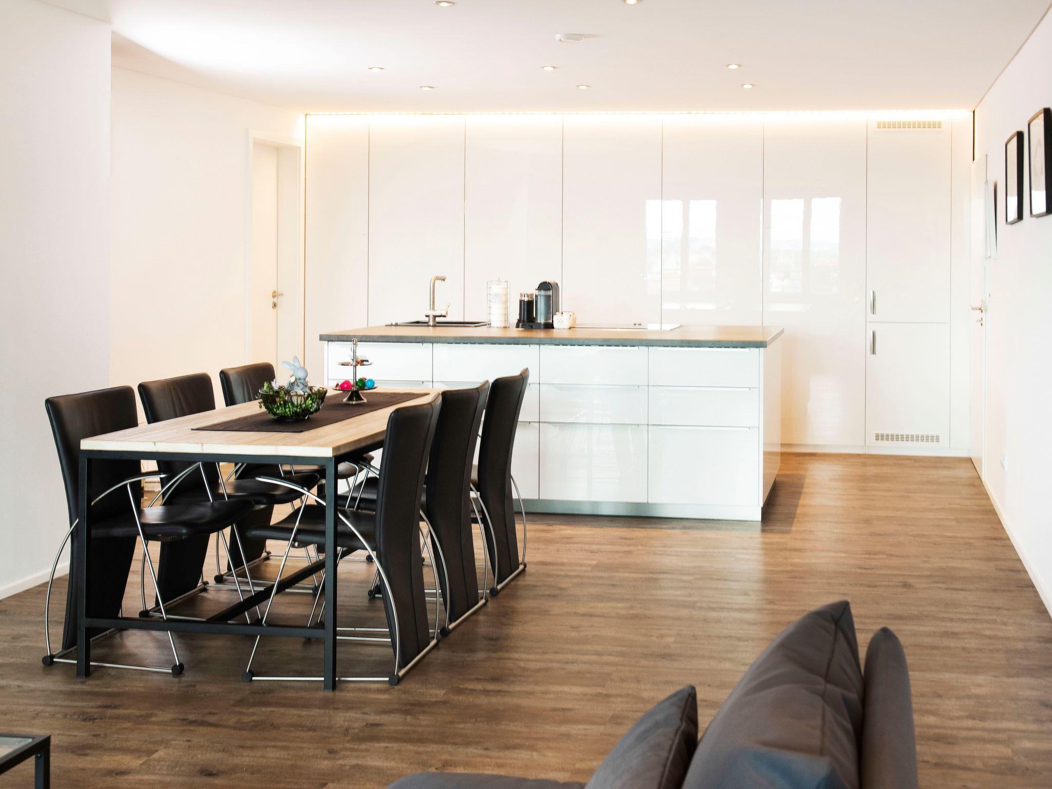 The flat has been newly renovated and welcomes you in a high, modern standard. The furnishings are clearly laid out and offer everything you need for a cosy and relaxing stay. The room layout consists of an open-plan dining and living area with a spacious kitchen island, cosy couch with large LCD TV and access to the guest toilet. A whirlpool bath awaits you in the open passageway to the bedroom. The bedroom welcomes you with a 180x200cm double bed and access to the bathroom. The lighting and heating in the entire flat is controlled via a smart home system, allowing you to conveniently adjust the colour tone and light intensity to suit your mood. In addition, the flat offers broadband Internet WLAN The flat has been newly renovated and welcomes you in a high, modern standard. The furnishings are clearly laid out and offer everything you need for a cosy and relaxing stay. The room layout consists of an open-plan dining and living area with a spacious kitchen island, cosy couch with large LCD TV and access to the guest toilet. A whirlpool bath awaits you in the open passageway to the bedroom. The bedroom welcomes you with a 180x200cm double bed and access to the bathroom. The lighting and heating in the entire flat is controlled via a smart home system, allowing you to conveniently adjust the colour tone and light intensity to suit your mood. The flat also offers broadband Internet WLAN.