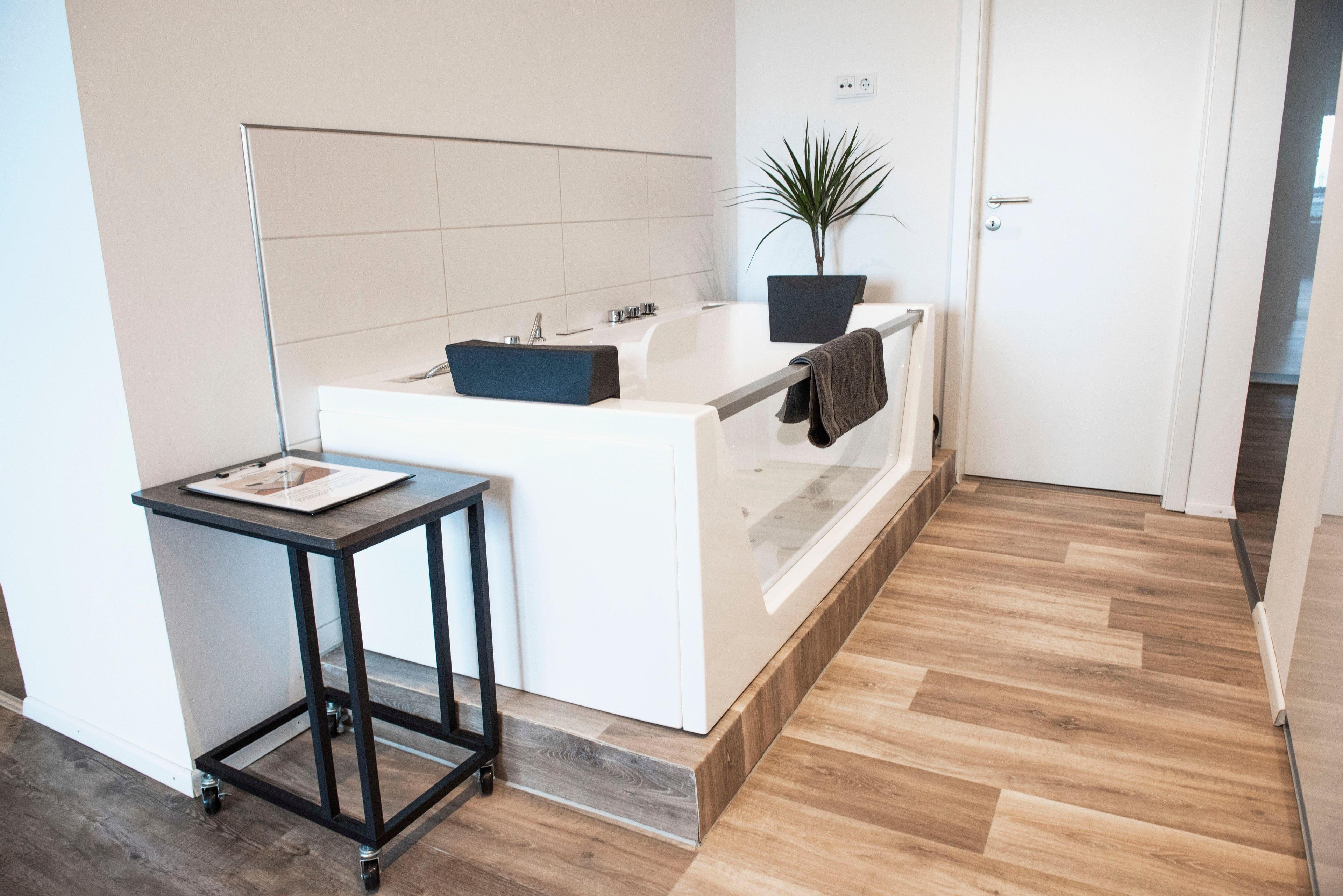 Im offenen Durchgang zum Schlafzimmer erwartet Sie eine Whirlpool-Badewanne.