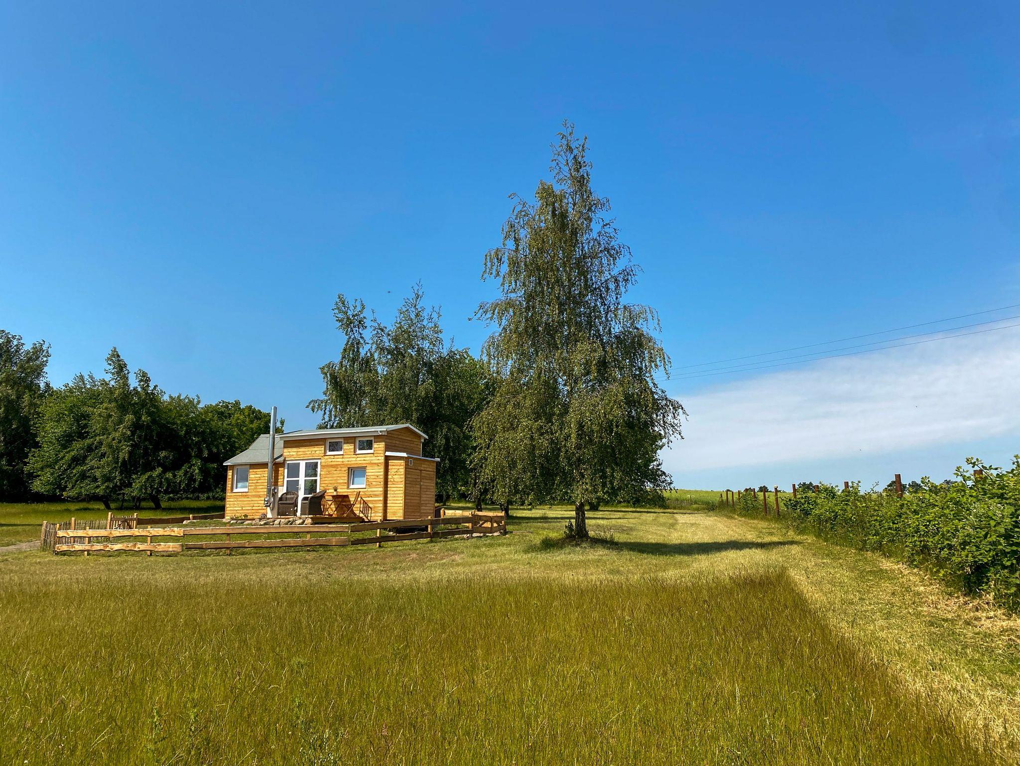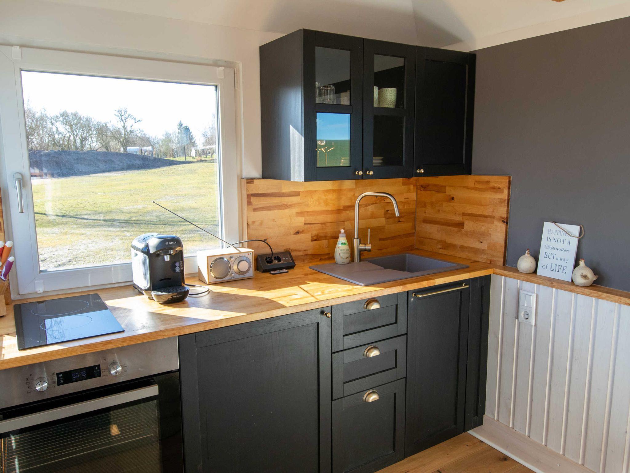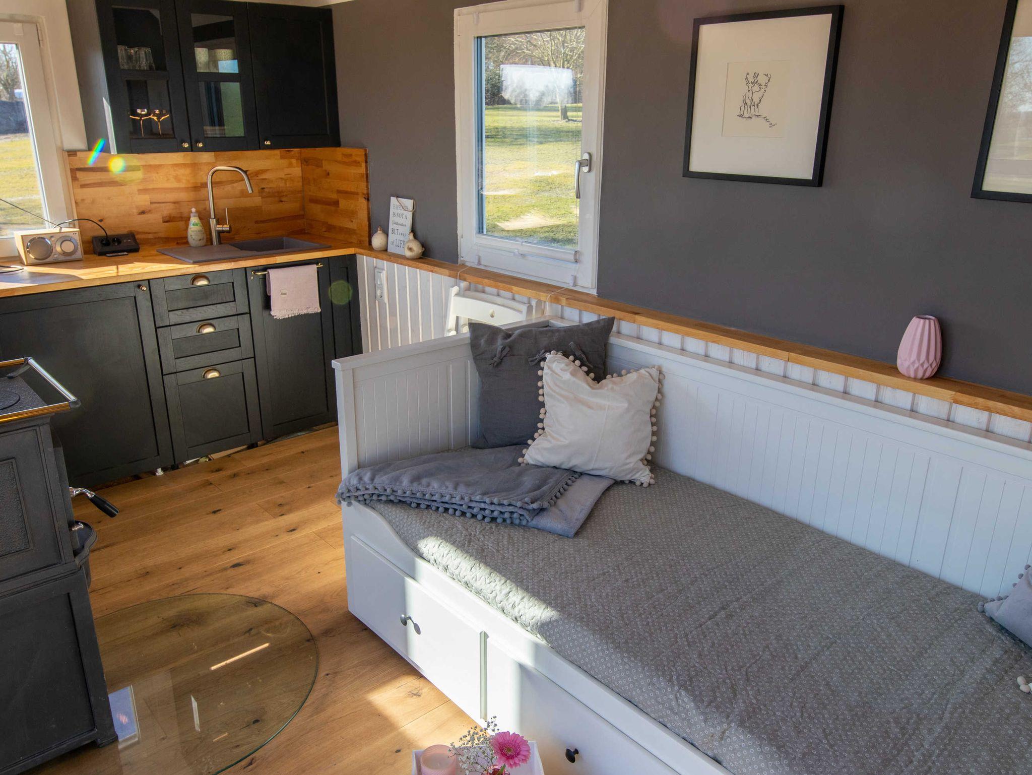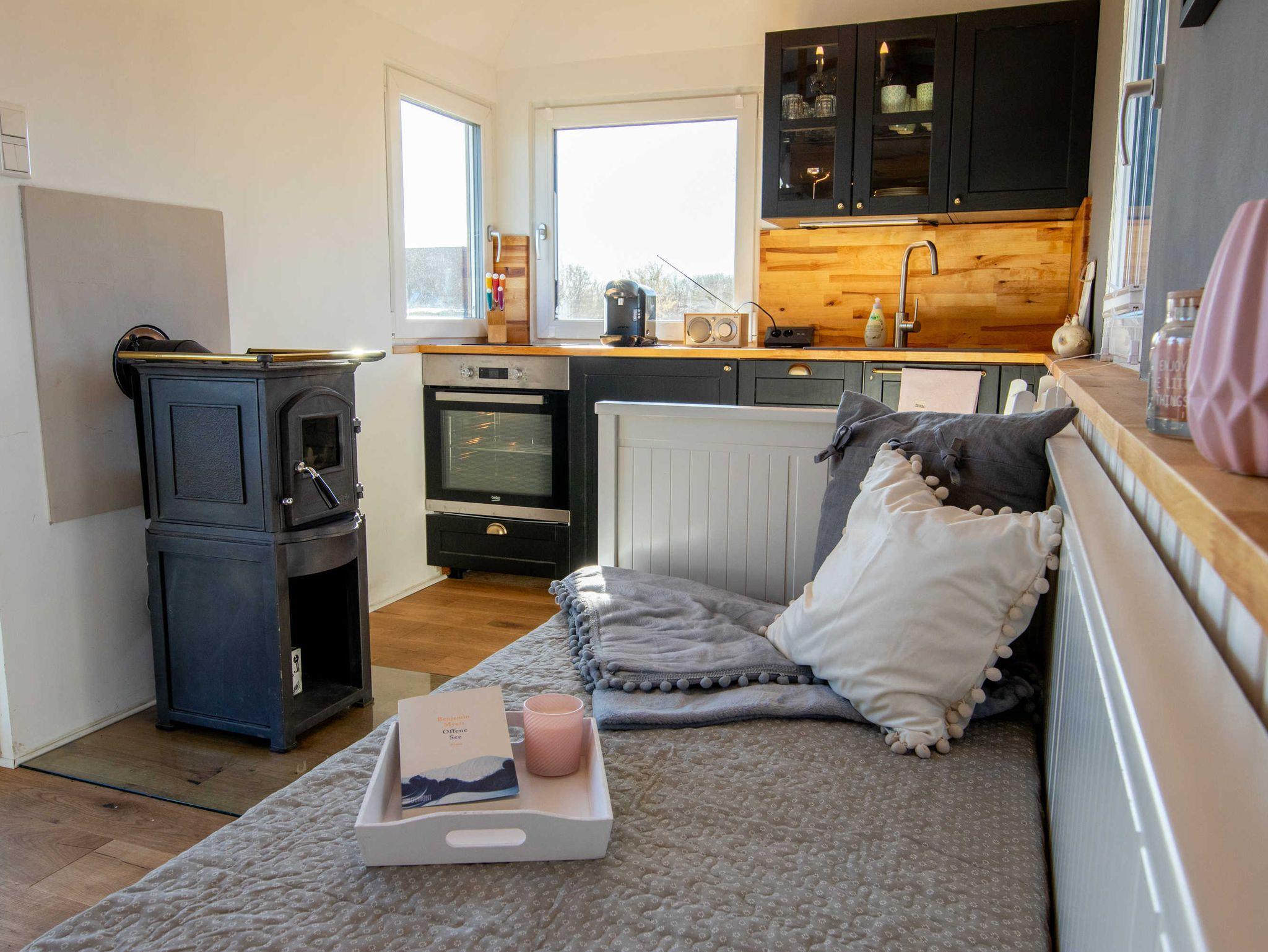 Das Tiny House in Kenz-Küstrow, auf einem Gutshof-Grundstück gelegen, bietet bis zu 3 Personen Platz. Das Ferienhaus lässt auf 20 m² Grundfläche keine Wünsche übrig: Kochen in der perfekt ausgestatteten Küche, Schlafen im Doppelbett (160x200) unter dem Dach, kuschelige Abende am Holzofen und eine hübsche Holzterrasse mit Sitz- und Grillmöglichkeit direkt vor der Türe. Das Schlafsofa (80x200) bietet eine weitere Schlafmöglichkeit. Im Bad befindet sich eine ebenerdige Dusche und neben dem WC einen beheizbaren Spiegel. Selbstverständlich bieten wir dir WLAN und unser Tiny House ist mit einer Zentralheizung und Fußbodenheizung ausgestattet. Nicht nur Romantiker, Schriftsteller, Radfahrer und Wasserliebehaber kommen hier auf Ihre Kosten, auch für Naturfotografen bieten sich herrliche Bilder. Insbesondere zur Zeit des Kranichzugs im Frühjahr und Herbst.