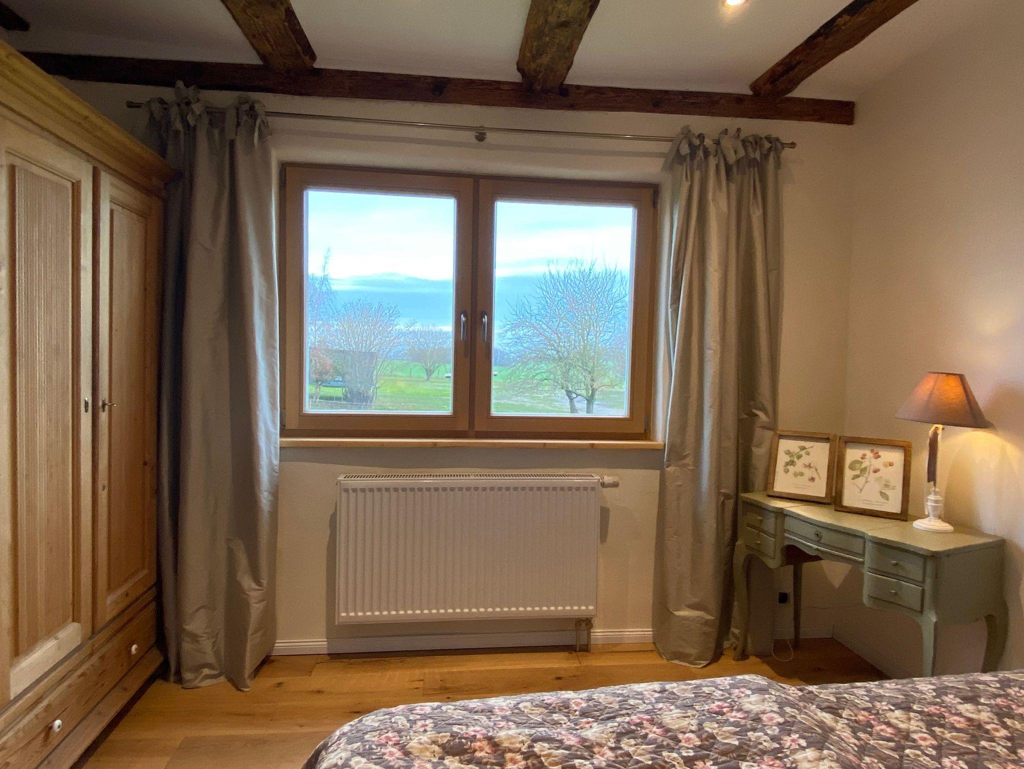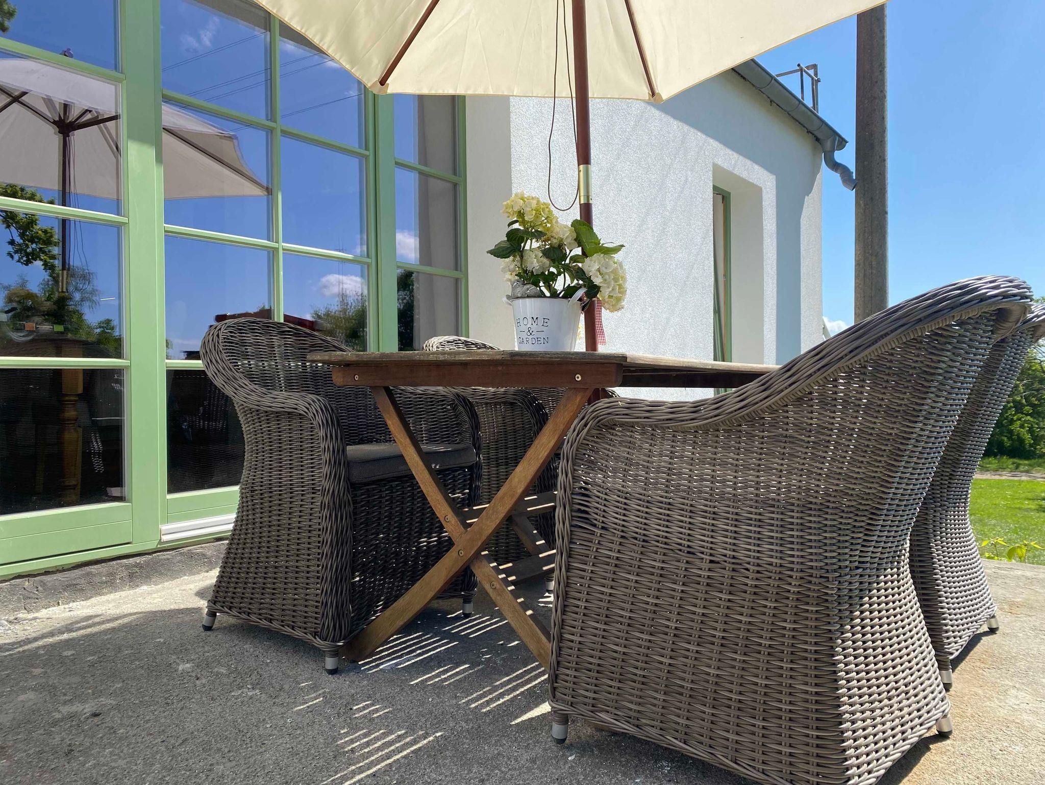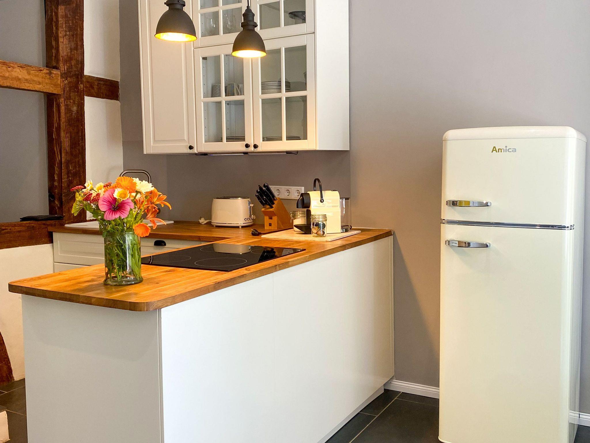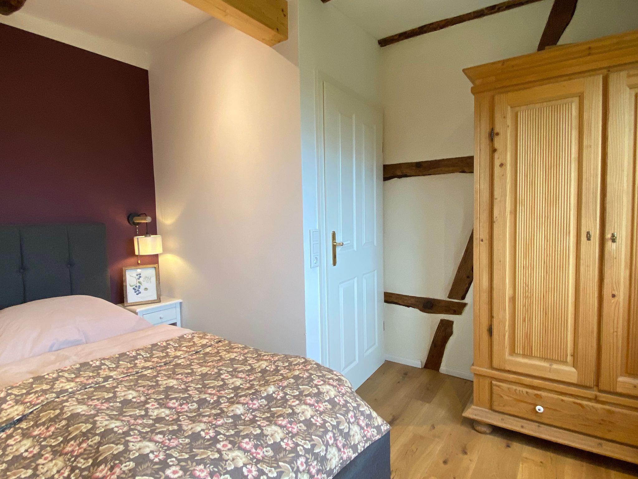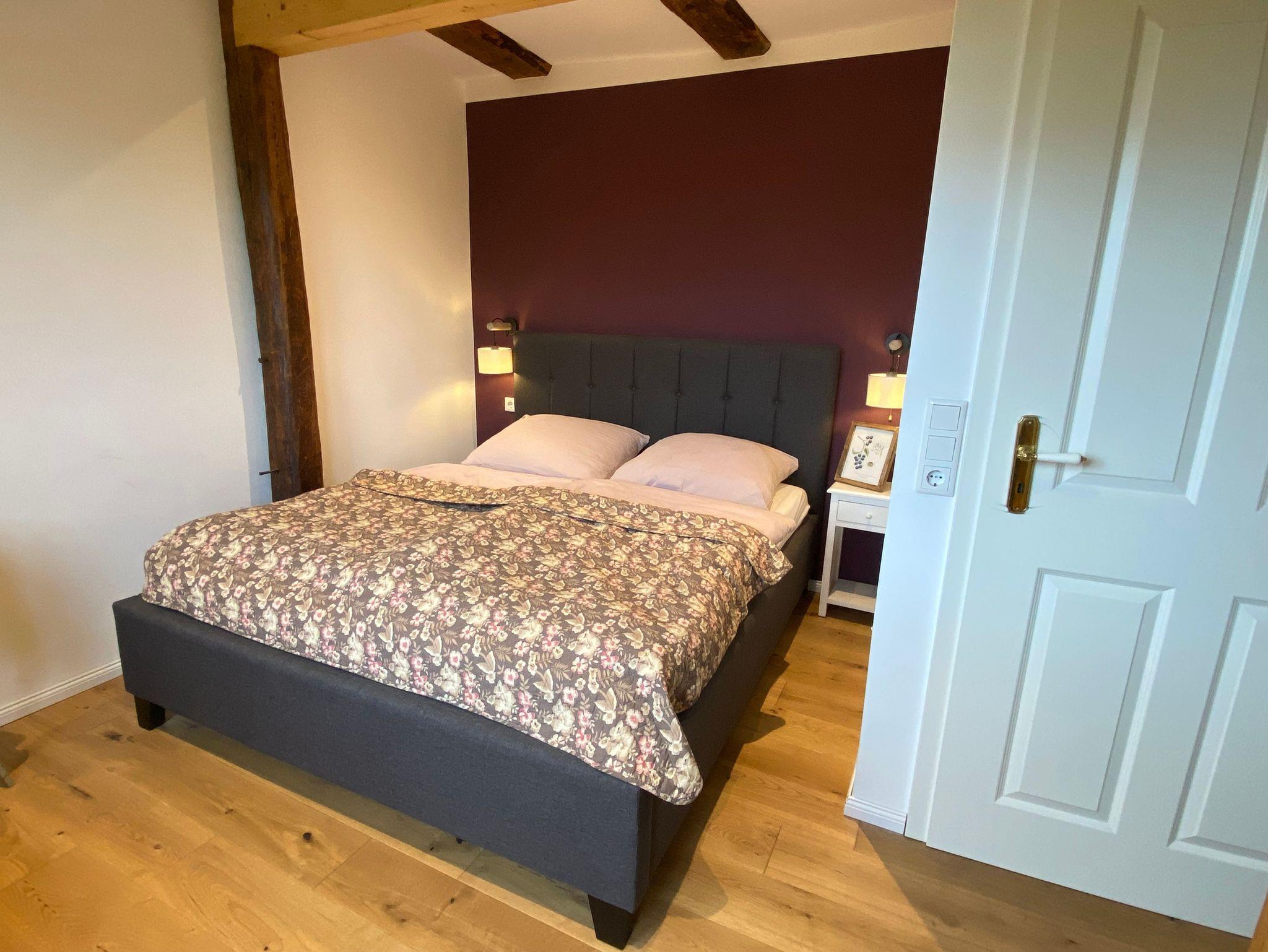 Sie erreichen Ihre 50 m² Ferienwohnung über im EG über den herrlichen Eingang des Gutshauses. Ihre Ferienwohnung bietet Ihnen einen wunderschönen offenen Wohn- und Küchenbereich mit einer neu eingerichteten Küche inkl. Spülmaschine und Backofen für bis zu 4 Personen. Ein komfortables Sofa, das auch noch als Schlafsofa (140x200) umfunktioniert werden kann, lädt zu gemütlichen Abenden ein. Über zwei Stufen erreichen Sie einen kleinen Flur, von wo aus das Badezimmer mit Dusche und WC und eine Sauna sowie das romantische Schlafzimmer mit Doppelbett (160x200) erreichbar ist. Auch hier erwarten Sie altes Fachwerk mit lehmverputzten Wänden und moderne Einrichtungselemente. Im Badezimmer steht Ihnen eine ebenerdige Dusche zur Verfügung sowie Tageslicht. Die Sauna lädt zur Entspannung ein. Genießen sie die schönen Stunden am Kaminfeuer des Kaminofens.