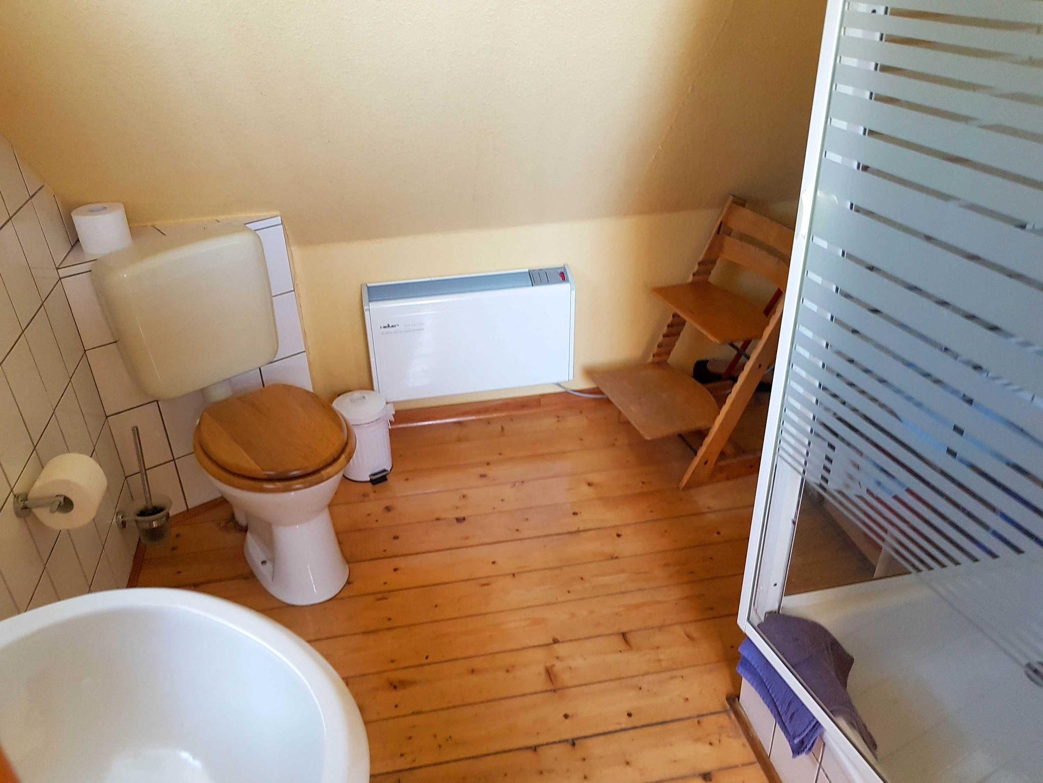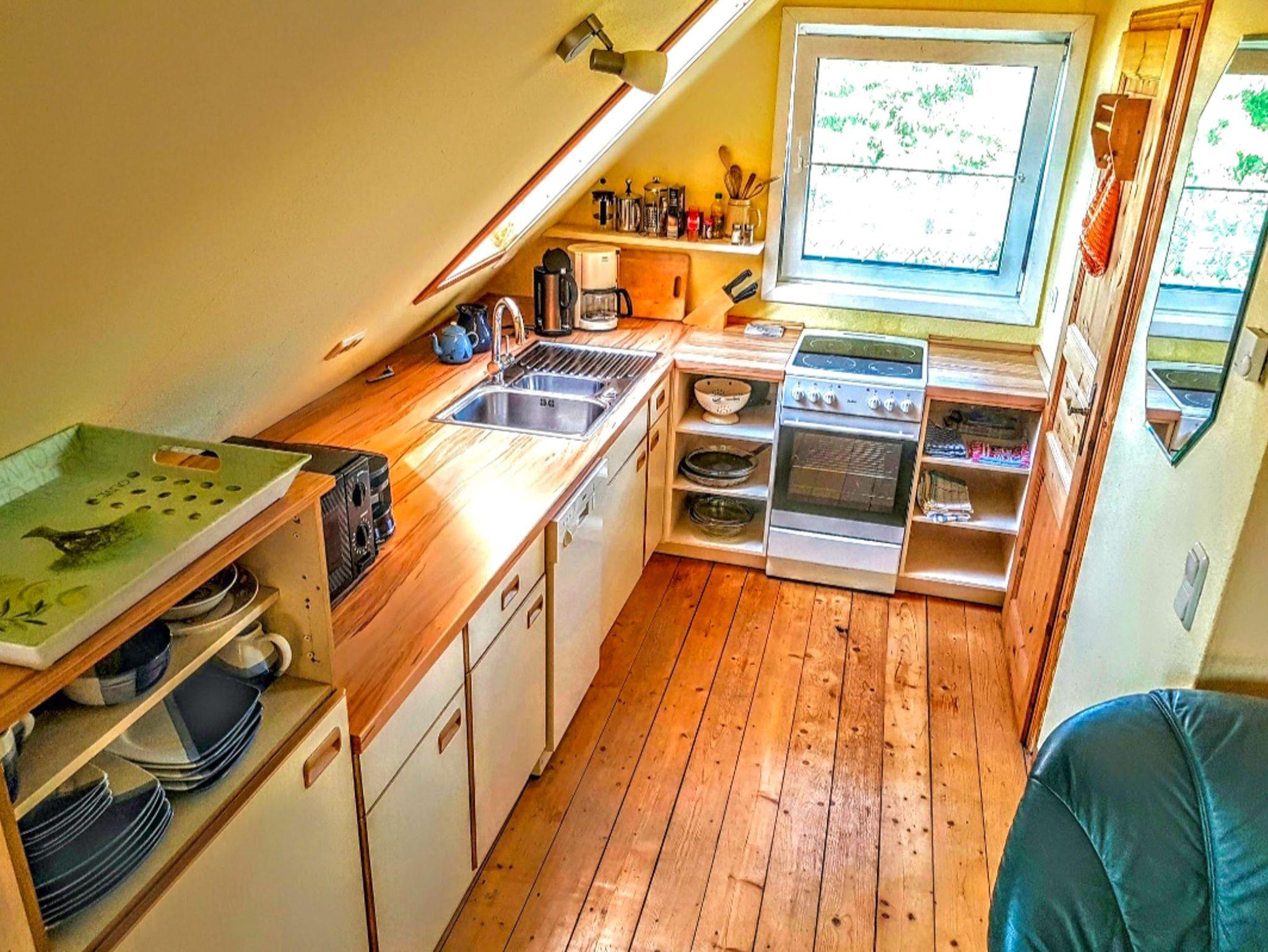 Die Ferienwohnung für 5 Personen befindet sich im Obergeschoss des Nebengebäudes. Über einen eigenen Aufgang mit großem Balkon gelangen Sie in ein Wohnzimmer mit offener, voll ausgestatteten Küche und Essbereich, sowie einem Schlafsofa und einem TV. Die Küche verfügt über einen Kühlschrank, Herd und Backofen, Spülmaschine, Mikrowelle, Kaffeemaschine, Wasserkocher und Toaster. Vom Wohnzimmer aus gelangen sie in die beiden separaten Schlafzimmern, eines mit Doppeltbett (180x200), das andere mit zwei Einzelbetten (90x200). Das Bad ist mit Dusche und WC ausgestattet.