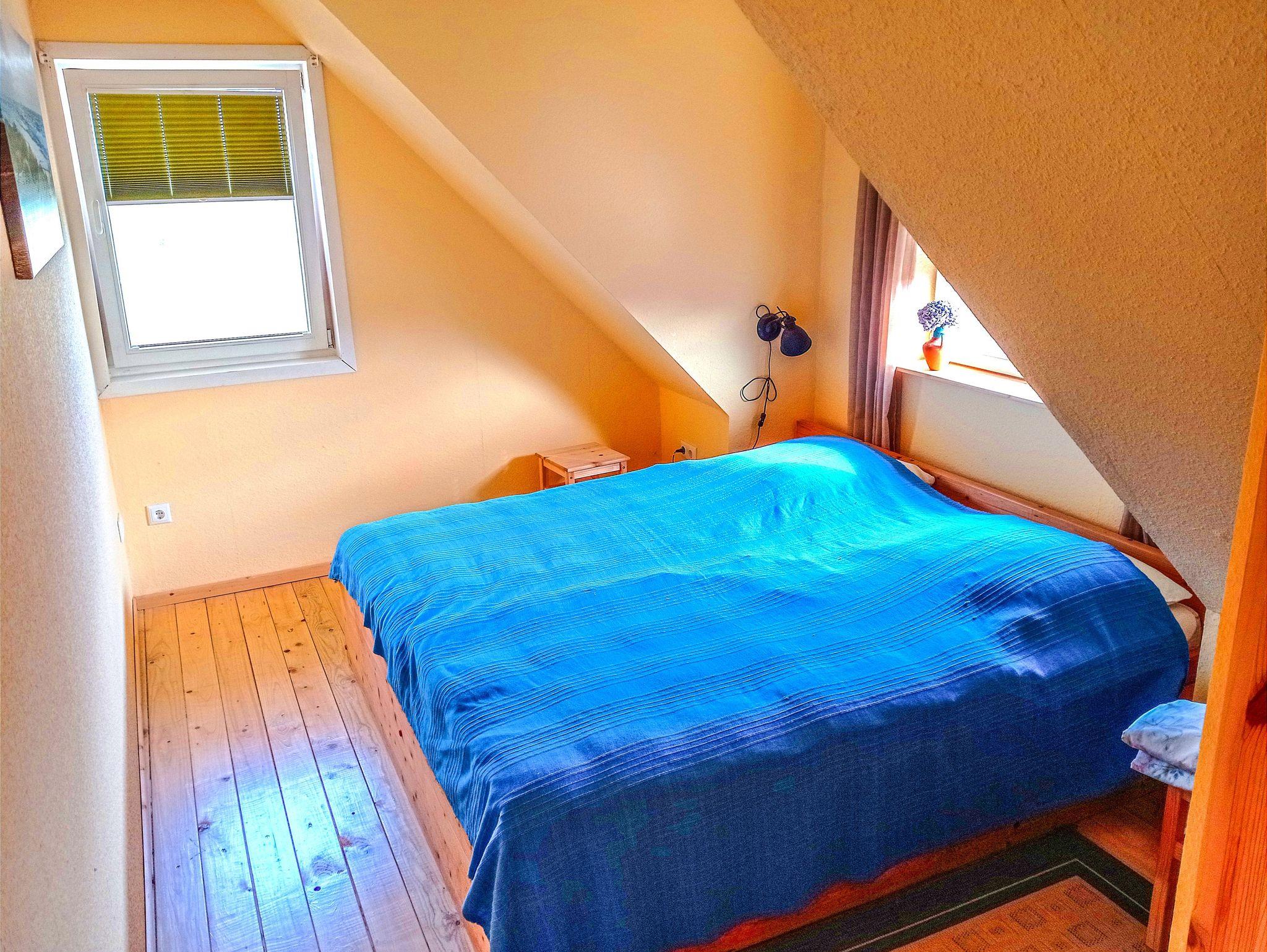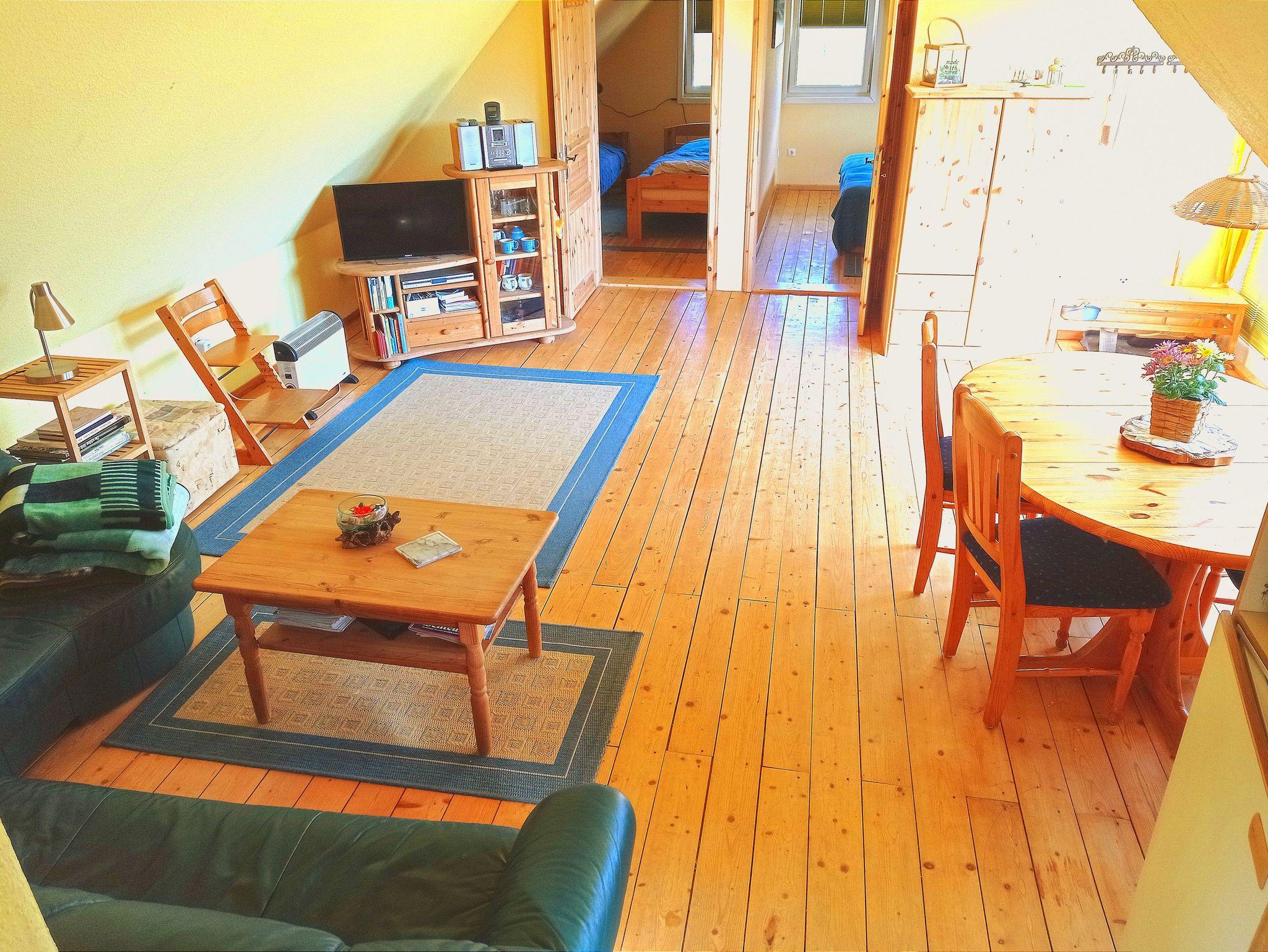 Die Ferienwohnung befindet sich im Obergeschoss des Nebengebäudes und ist über den Balkon erreichbar. Zwei separate Schlafzimmer, ein heller Wohnraum mit offener Küche und Schlafsofa sowie ein Bad mit Dusche und WC bieten alles, was Sie für entspannte Tage brauchen.